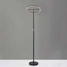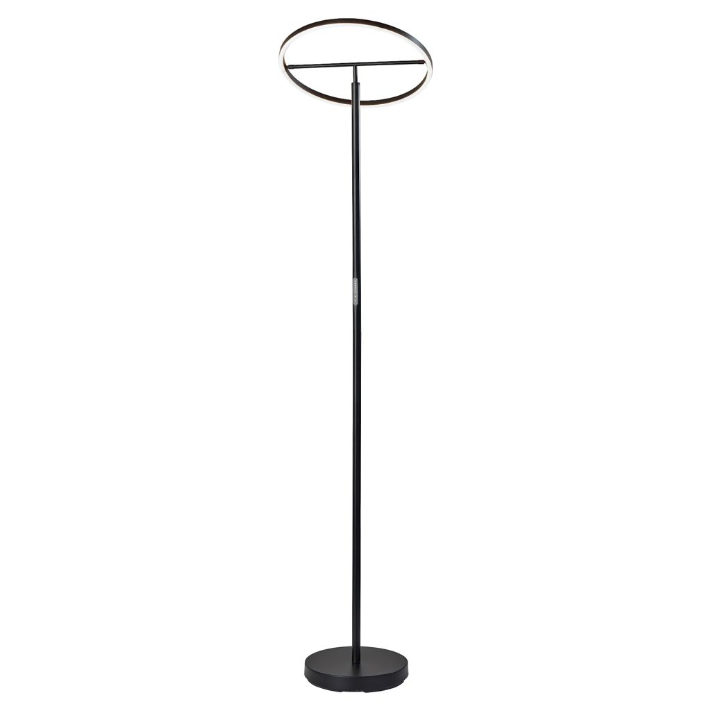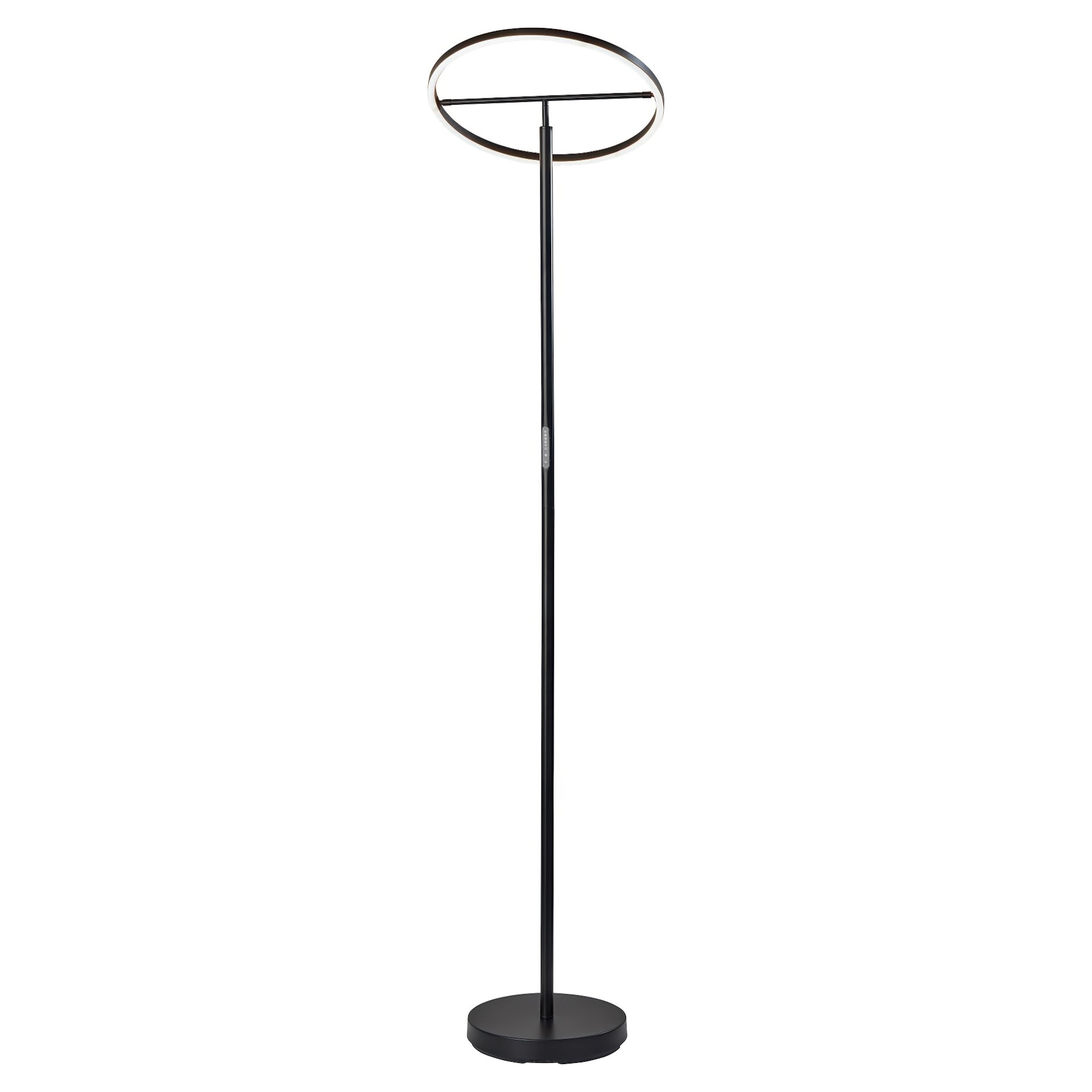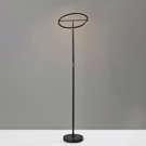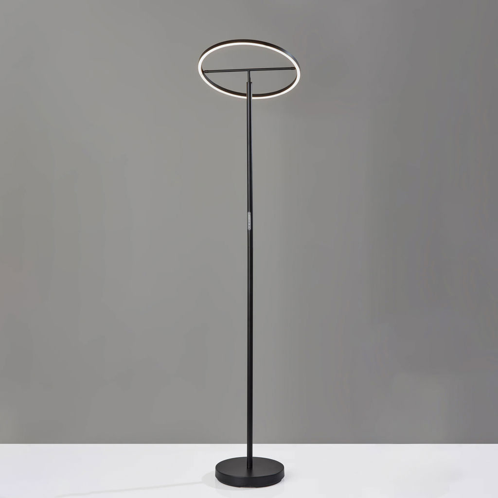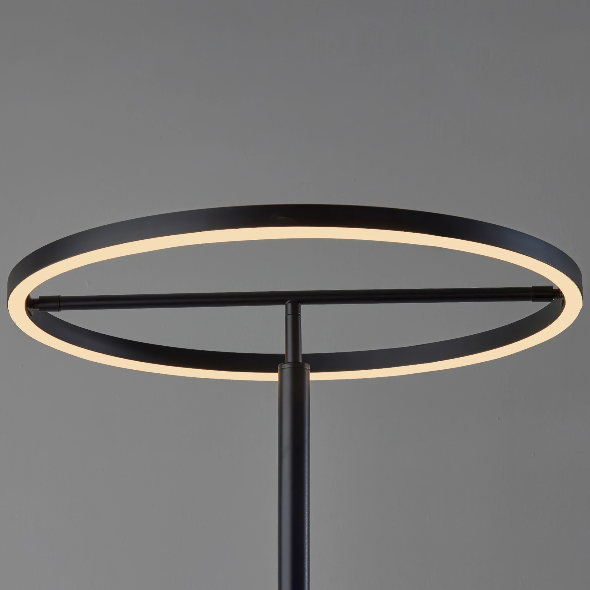 This floor lamp features a sleek black finish that radiates modern elegance. Its distinct black metal ring-shaped shade, paired with a frosted rubber diffuser, creates a captivating and efficient lighting solution.