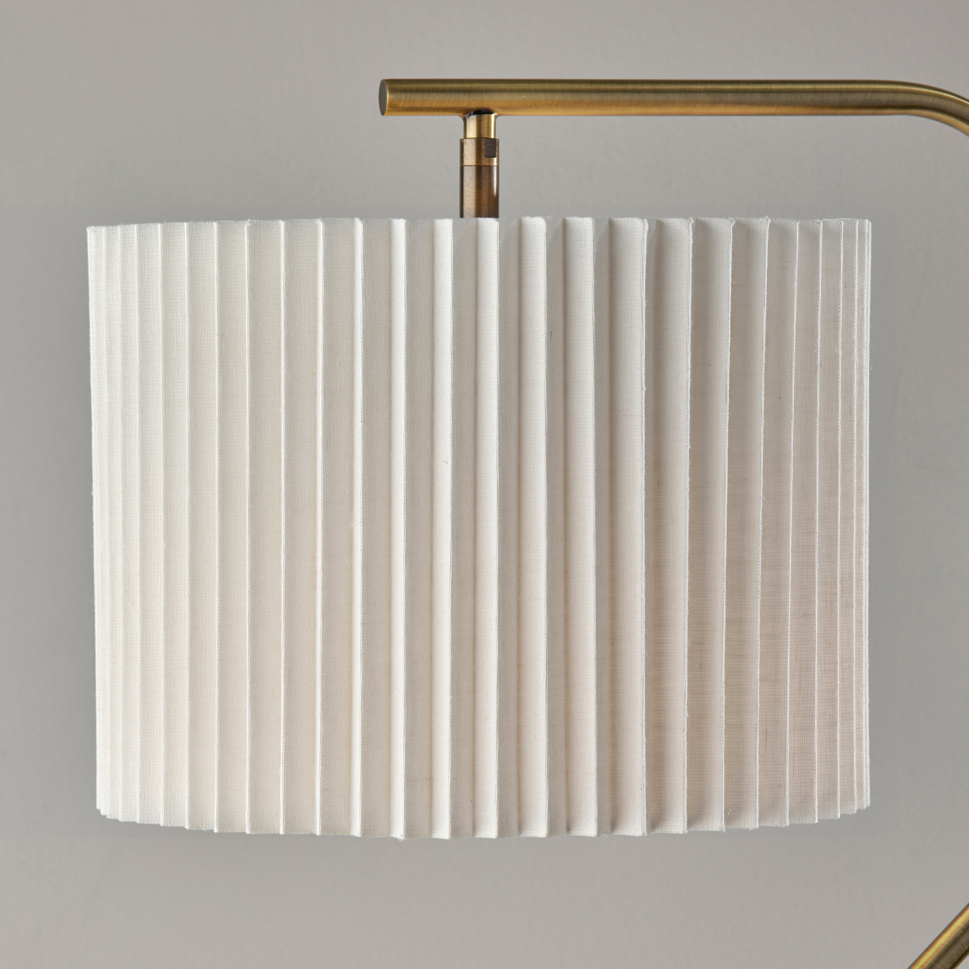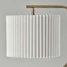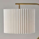 Its sleek brass finish and pleated off-white fabric drum shade create a striking visual contrast, perfect for modern interiors.