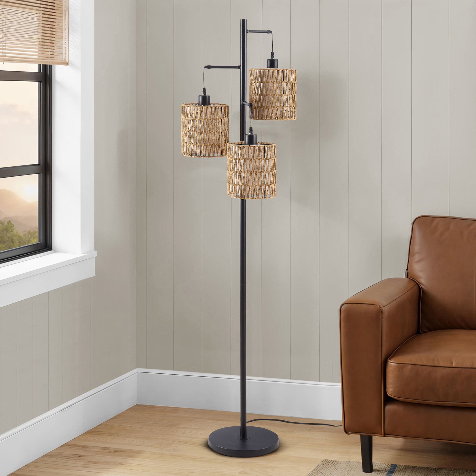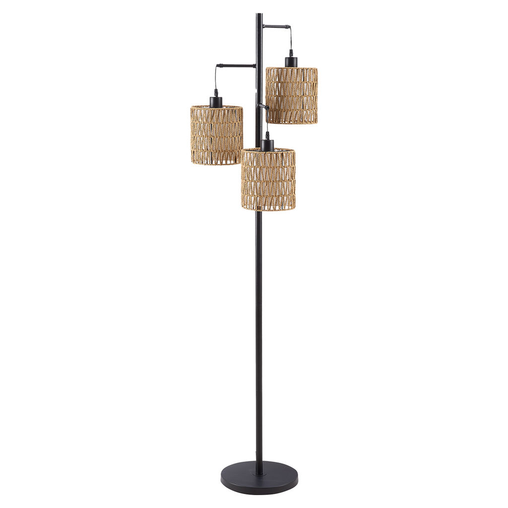 Featuring a sleek black metal frame and three chic natural rope shades, this lamp softly diffuses light to create a warm and inviting atmosphere in any space. Perfect for the living room, bedroom, or office, it serves as both a functional light source and a stylish decorative accent.