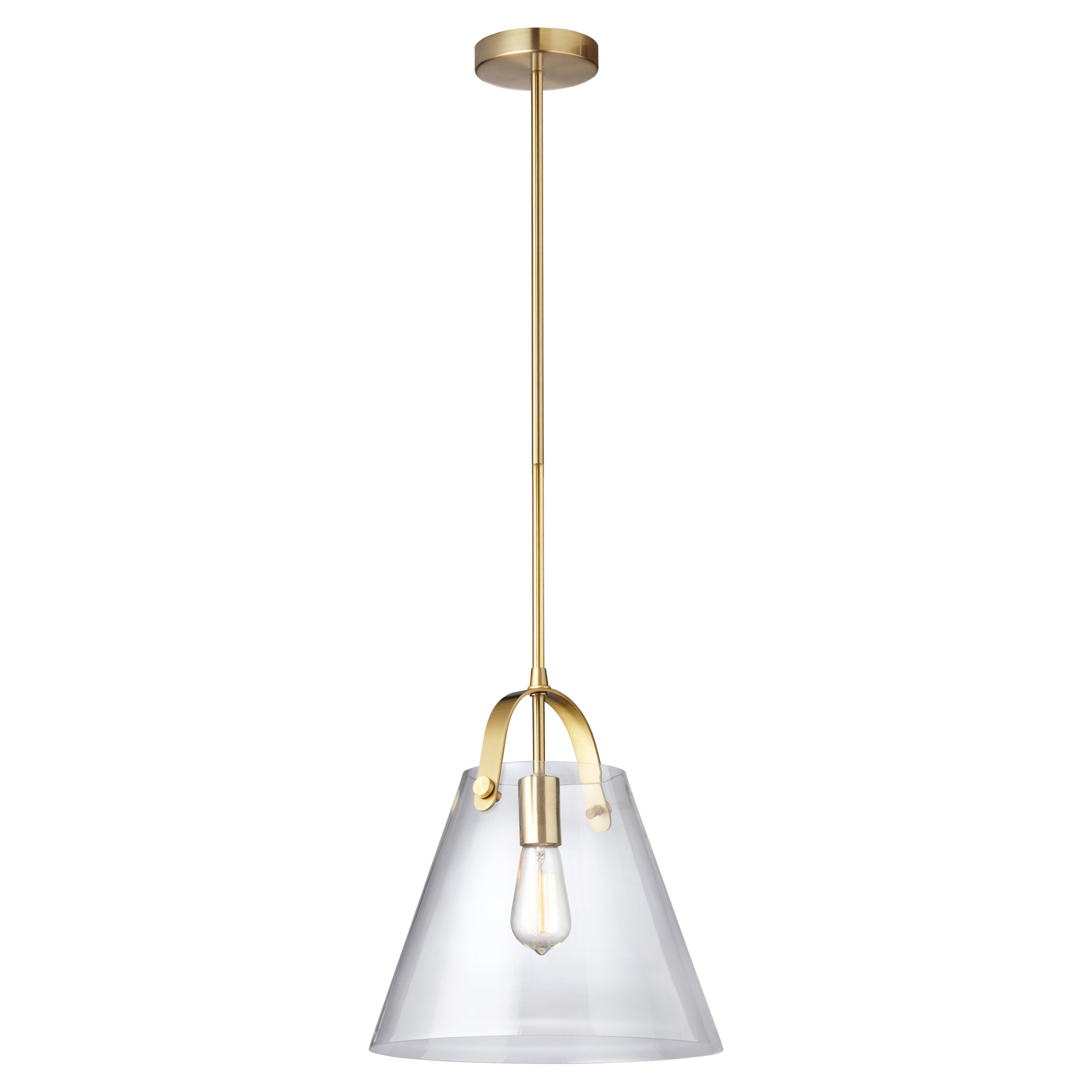This pendant light combines the airy lightness of clear glass with the warm glow of brushed brass. The conical clear glass shade leaves the bulb visible as a central decorative element, creating an elegant play of light.