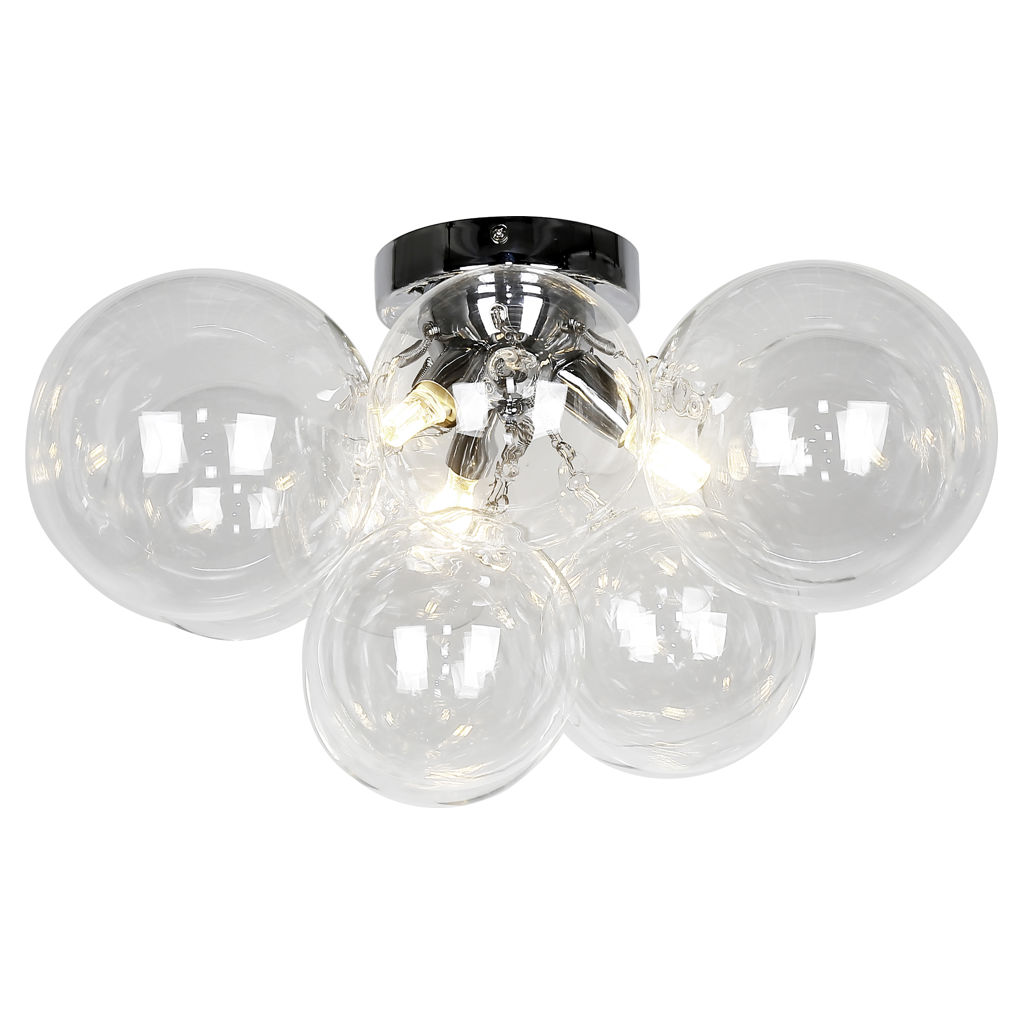This ceiling light draws the eye with its luminous design and airy visual effect. The clear glass globes diffuse light generously and evenly, providing pleasant illumination to effectively brighten a room.