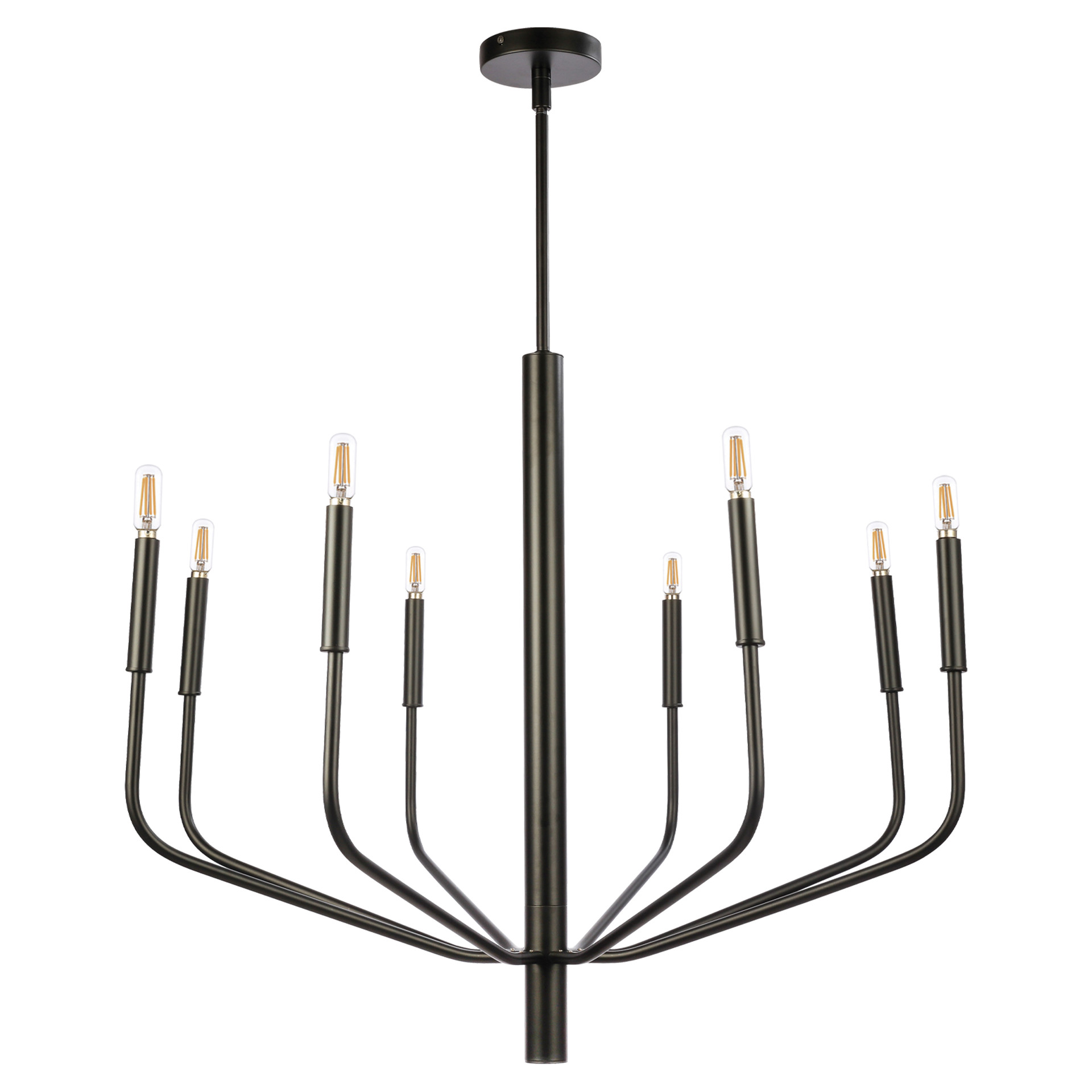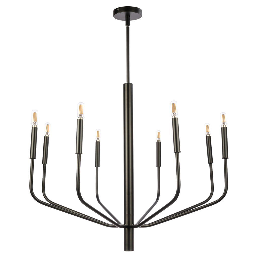 This eight-arm chandelier celebrates refined simplicity with its black metal tubular arms rising gracefully from a slender central stem. The minimalist curved lines create an airy, elegant silhouette that subtly catches the light.