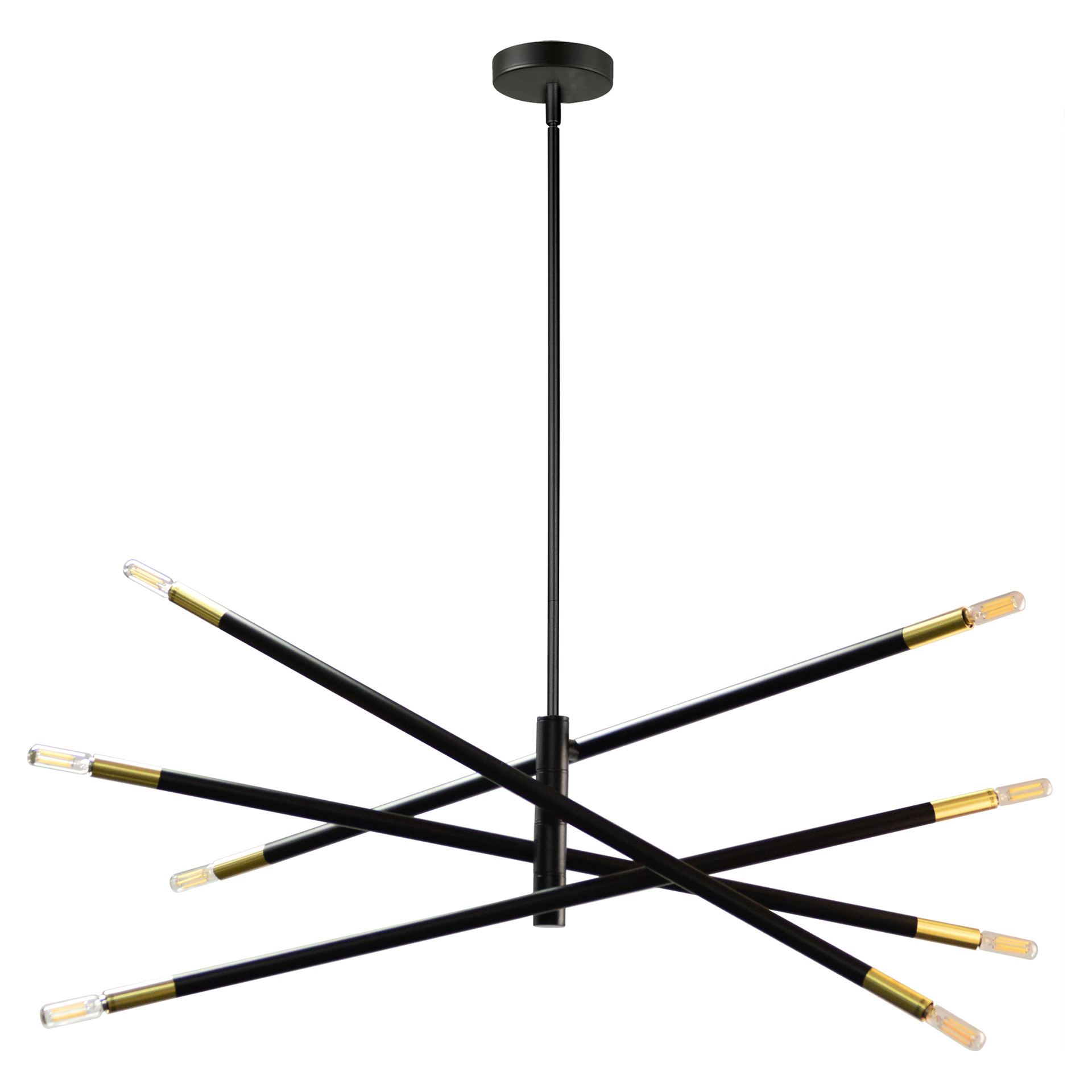 This architectural chandelier combines matte black with gold accents to create a striking graphic composition. Eight tubular arms extend symmetrically from the center, each end finished with a gold socket that adds a warm touch of sophistication to the monochrome palette.