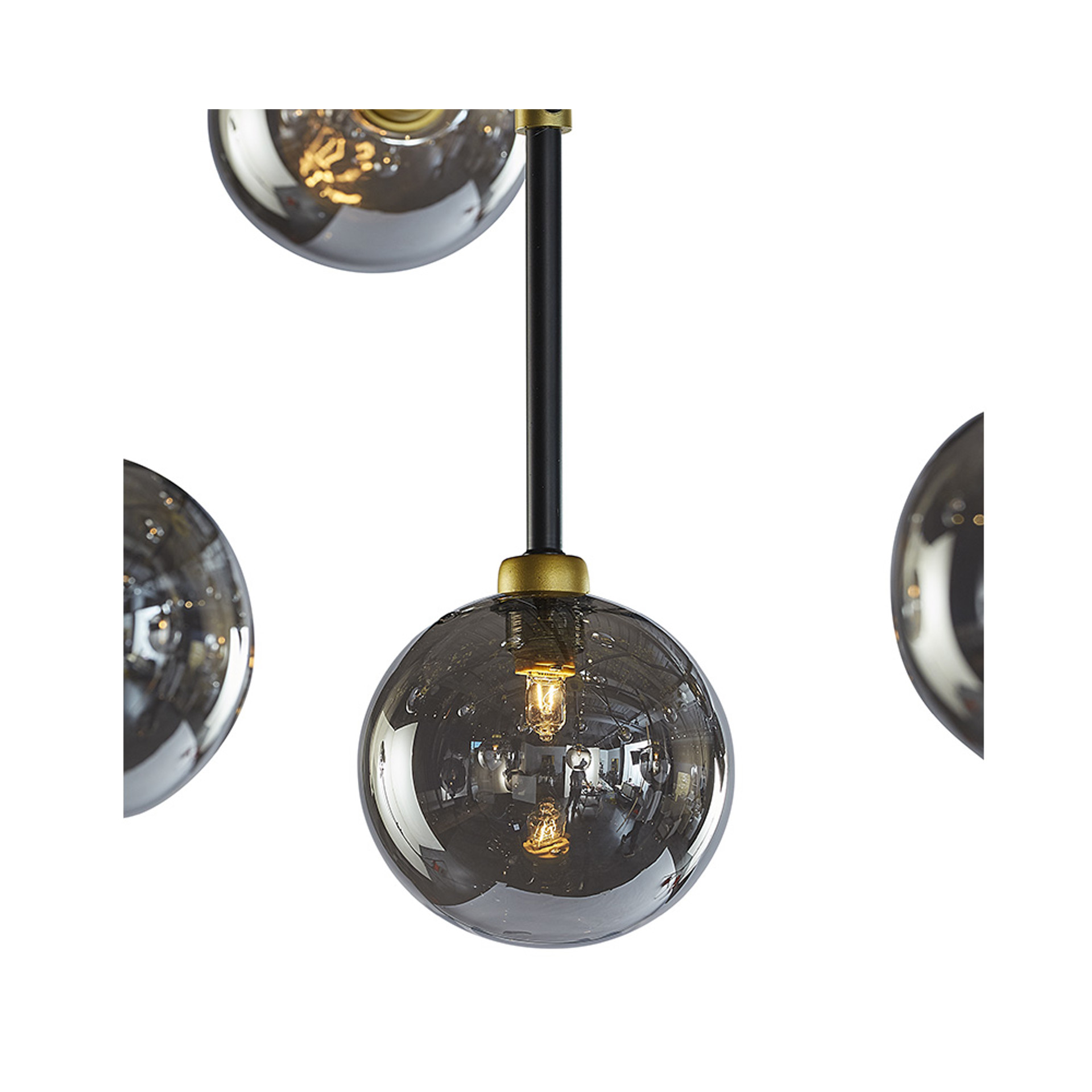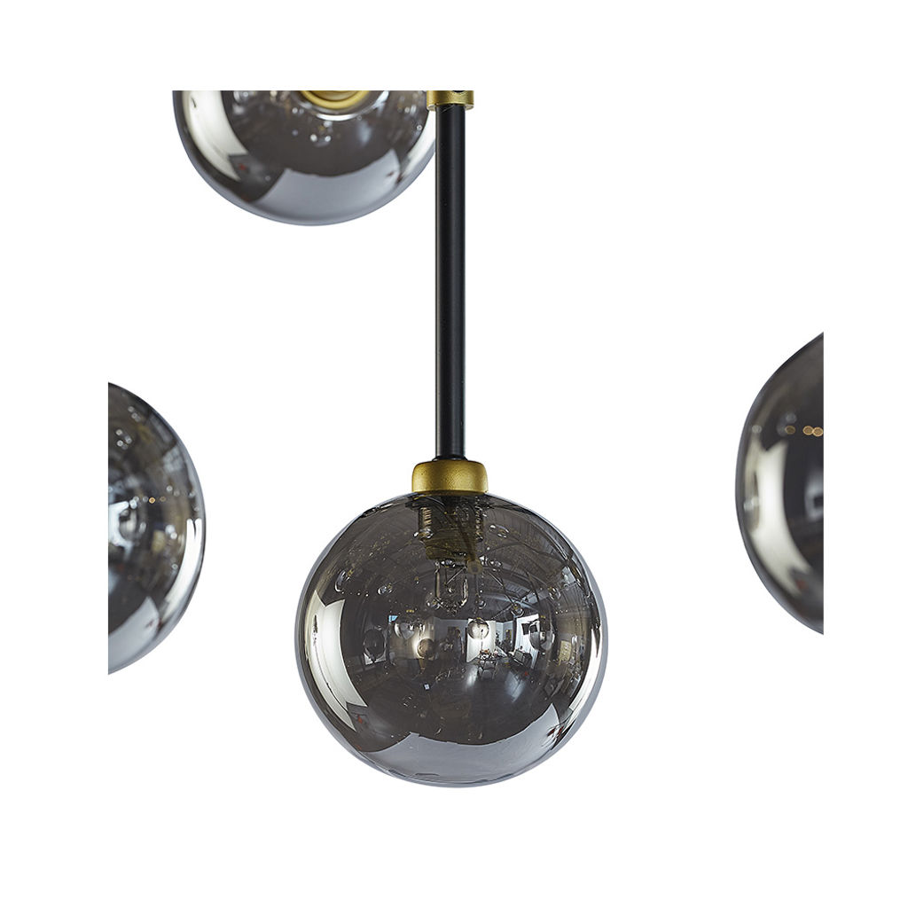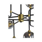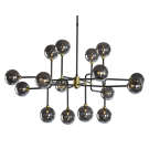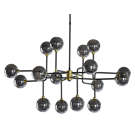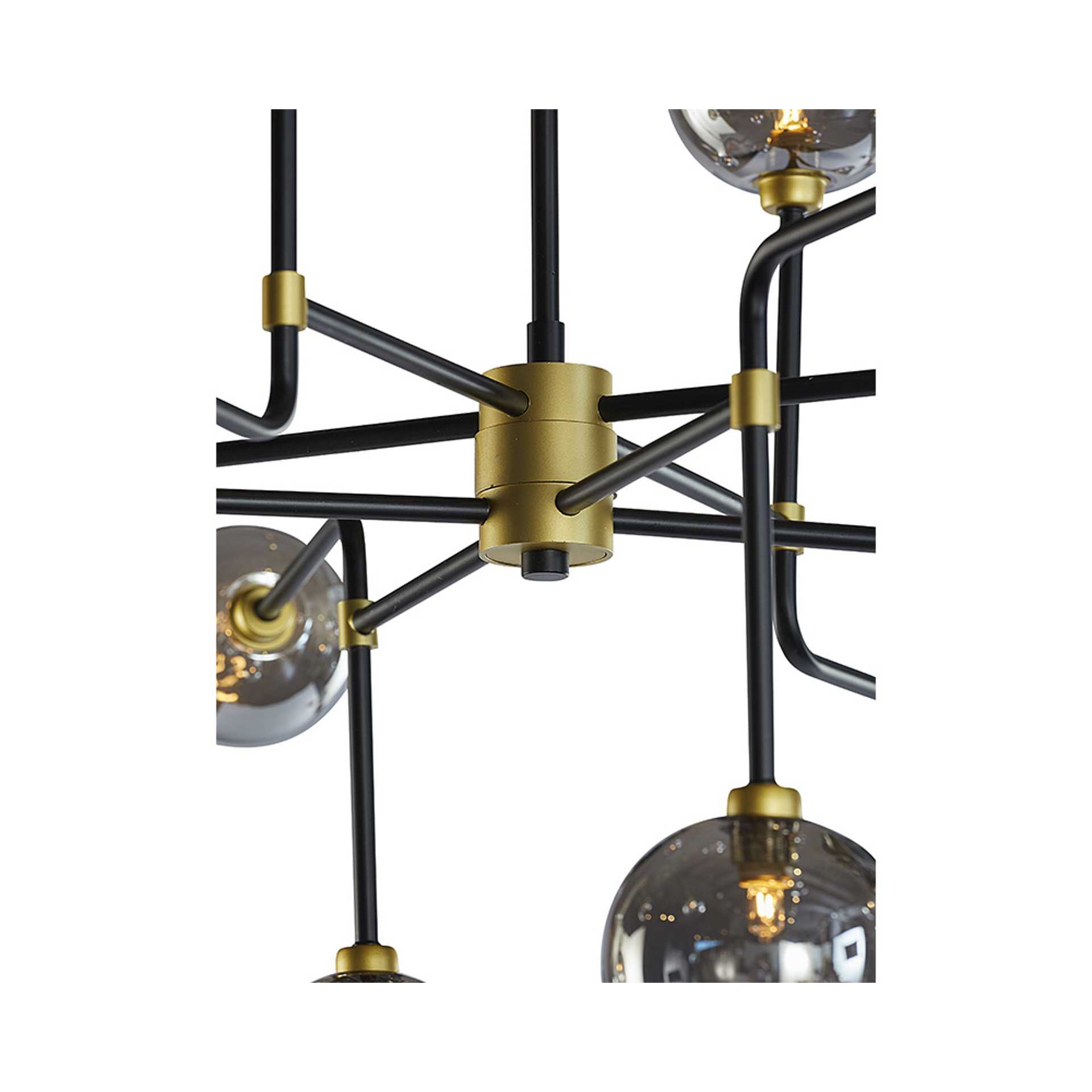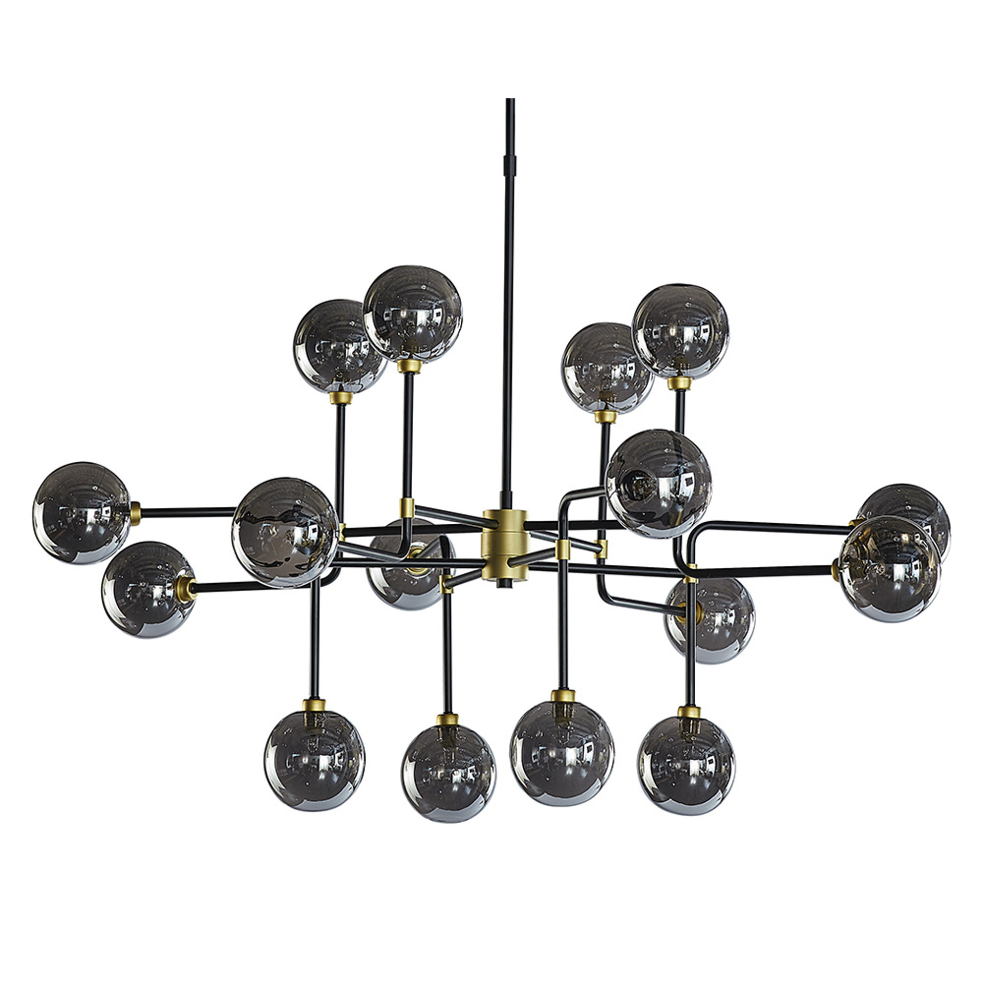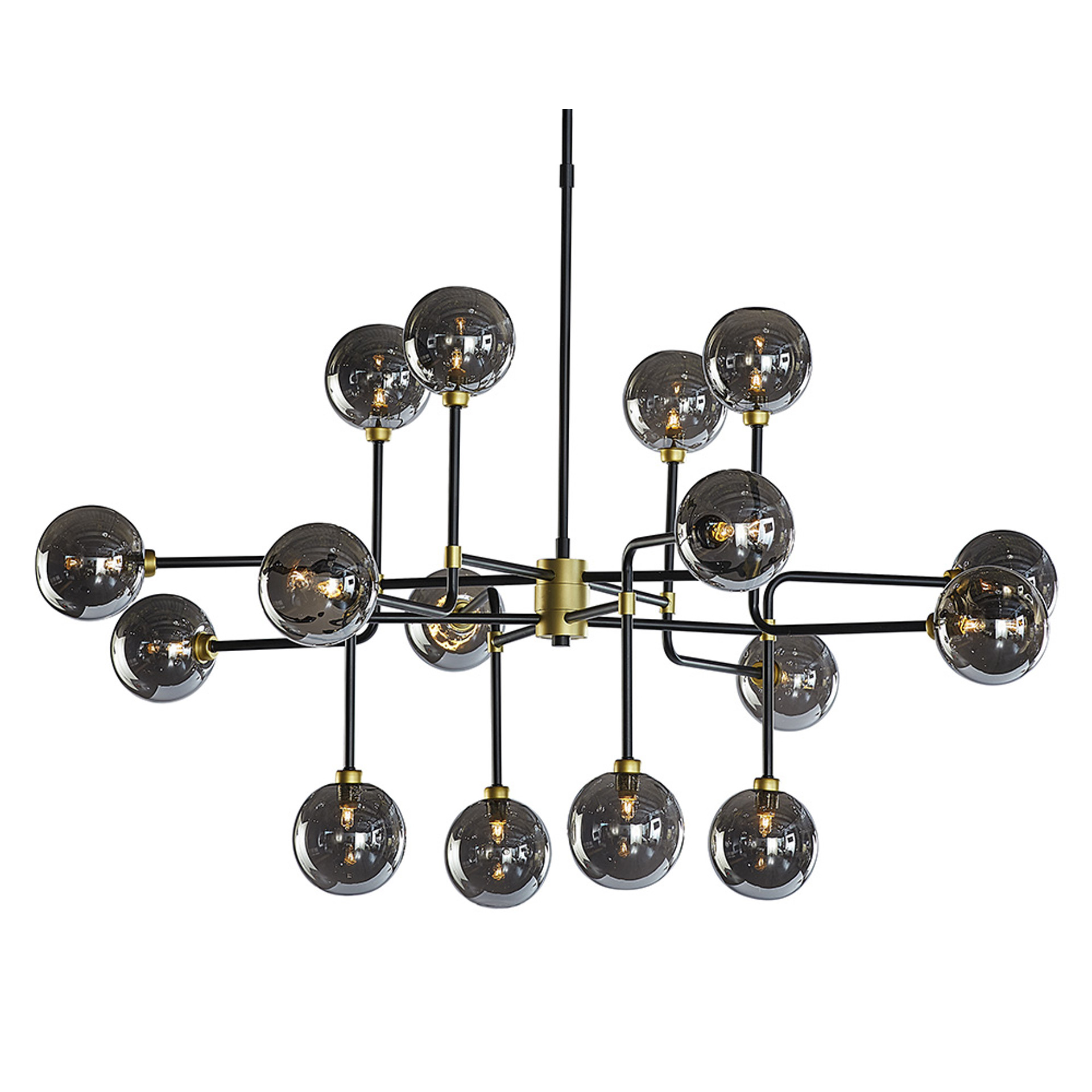 Transform your space with this spectacular chandelier featuring bold architectural lines. Its black structure extends sixteen smoked glass globes in a striking asymmetrical composition, enhanced by refined gold accents.