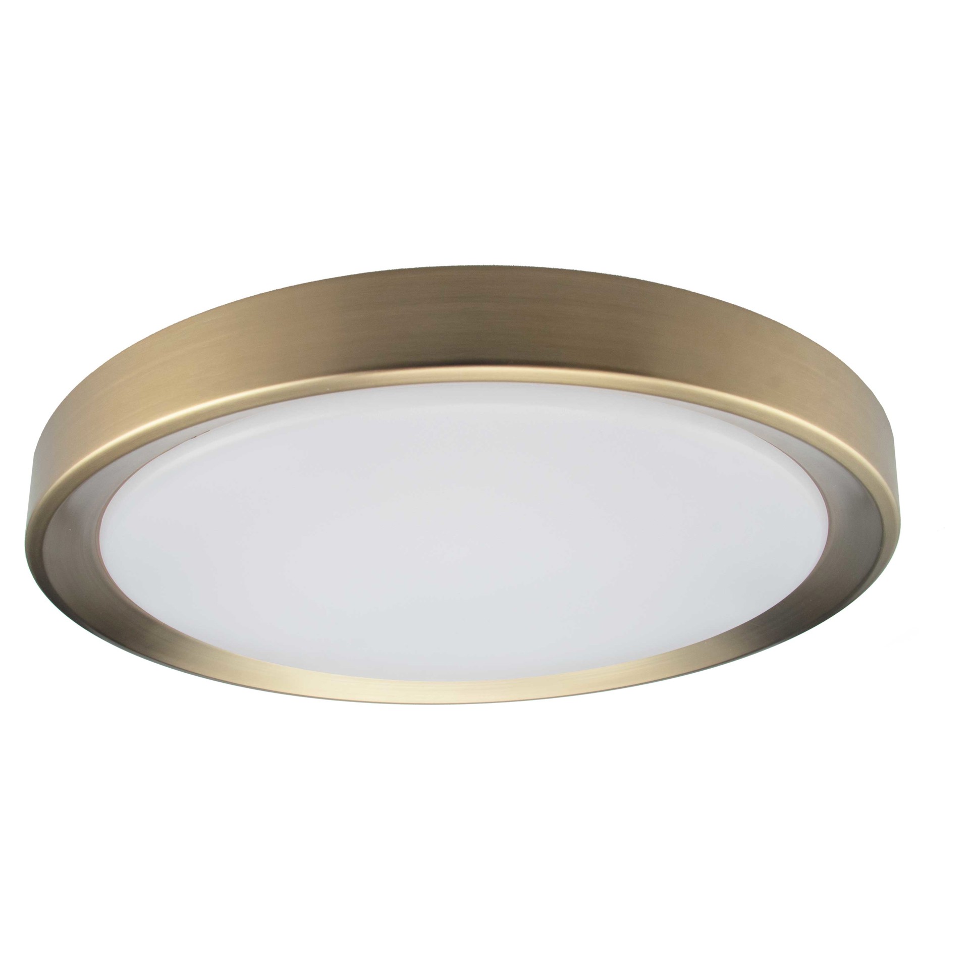 The Dainolite Modern Flynn recessed ceiling light, with electrolytic aged brass metal and white polystyrene ceiling plastic with 1 integrated LED light, max 24 Watts, is dimmable and UL approved for damp locations with a 5-year limited warranty.