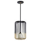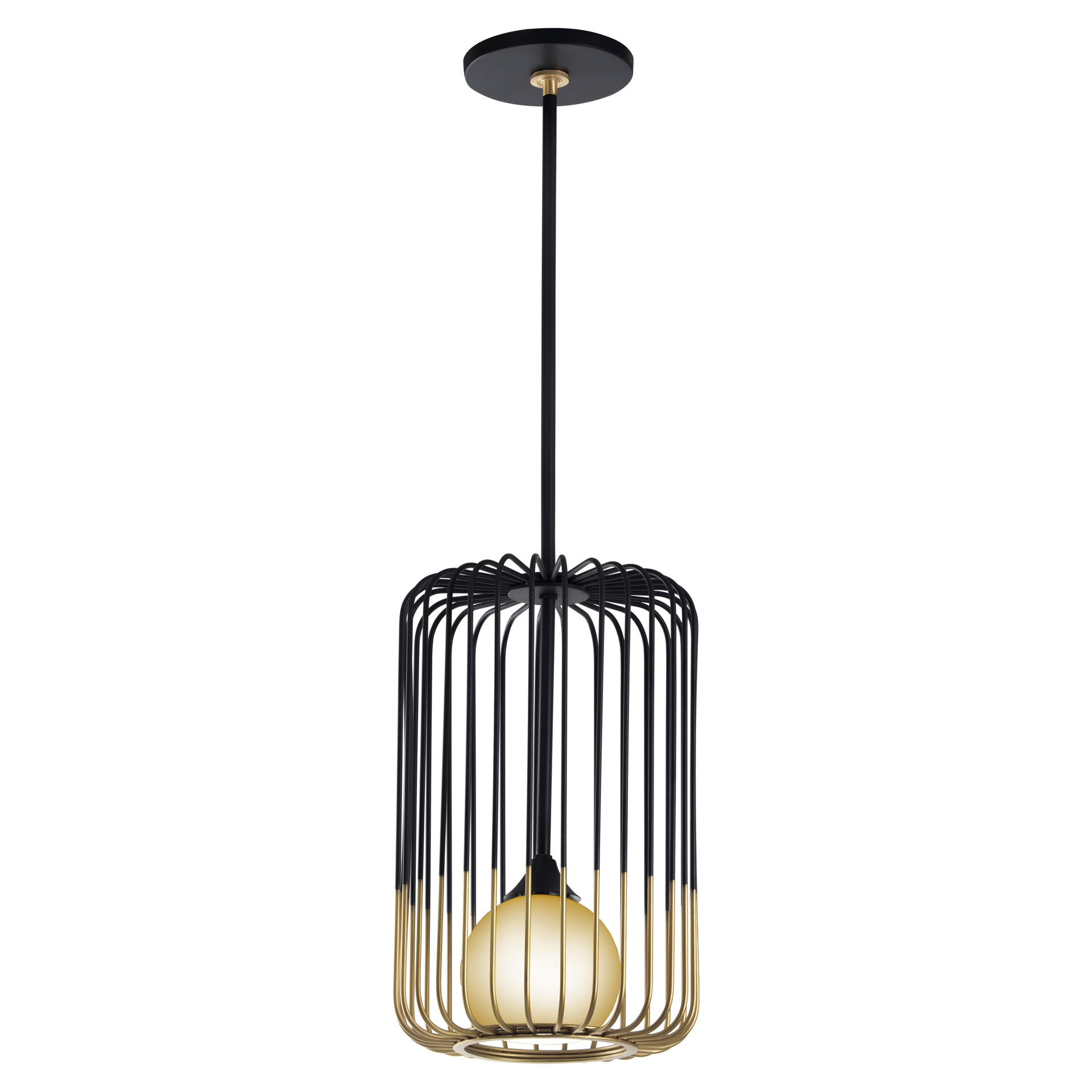 Its two-tone cylindrical frame, crafted from black and gold metal rods, creates a striking contrast while revealing an opal glass globe within.