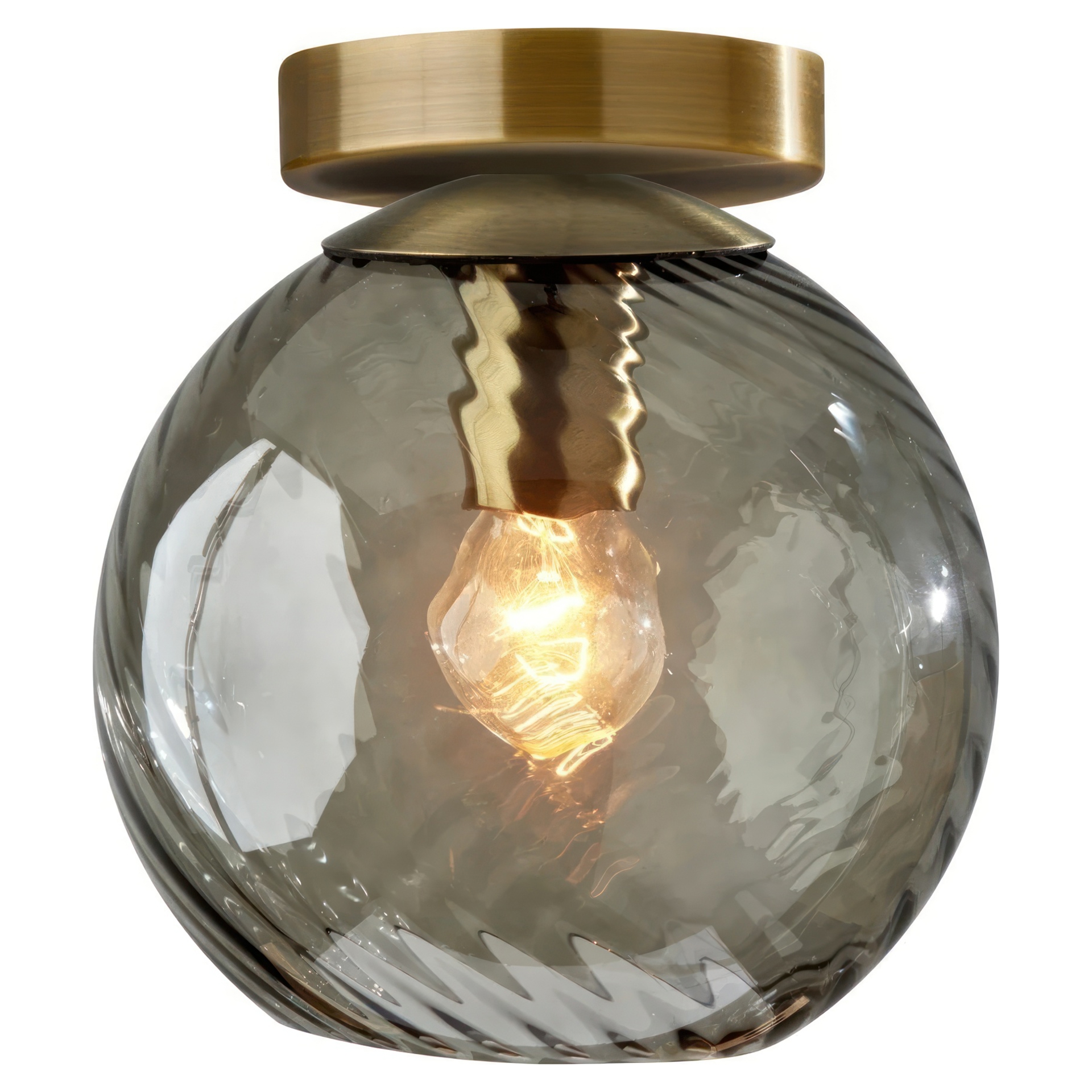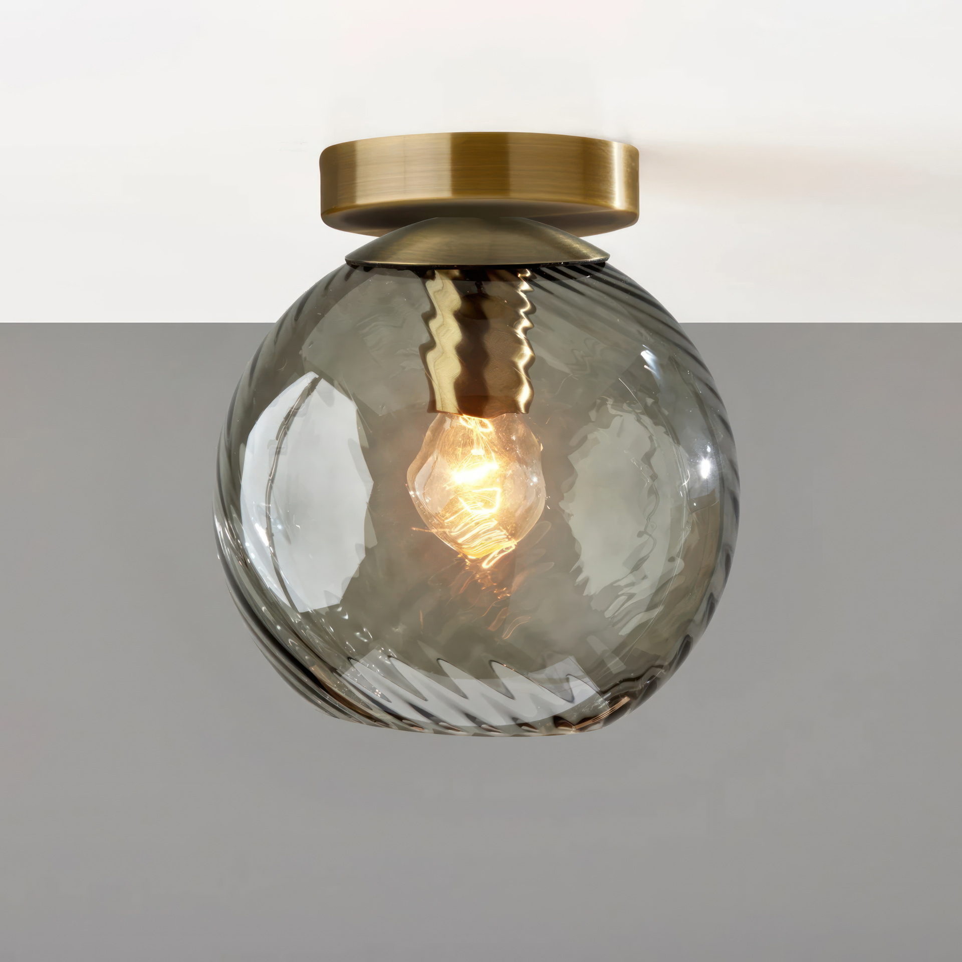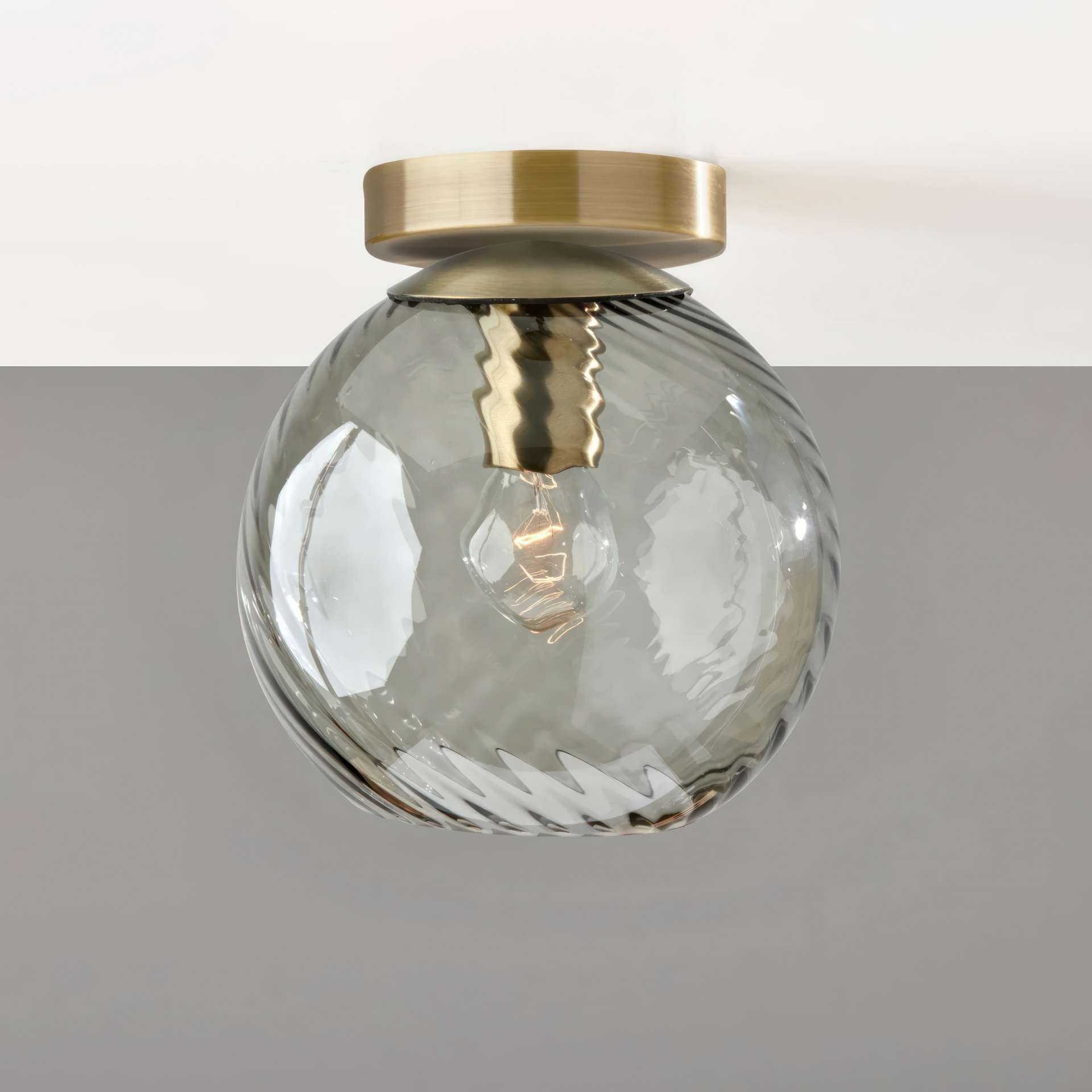 The shade is crafted of smoked glass with a delicate swirl pattern and leaves the 60W bulb visible, making a vintage Edison bulb (not included) a striking choice.