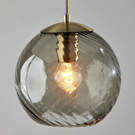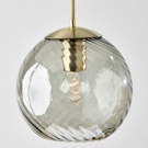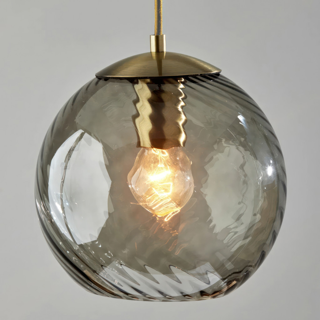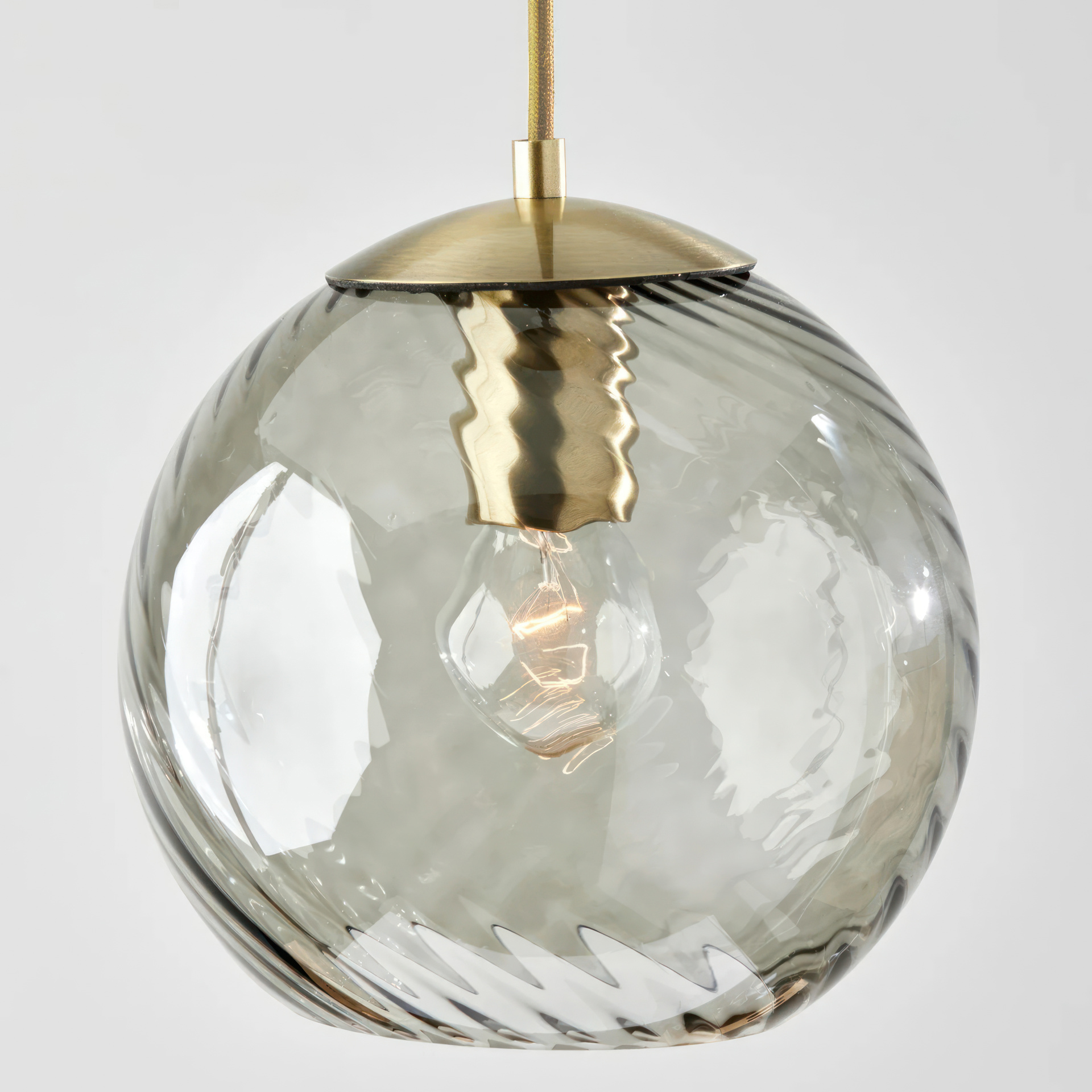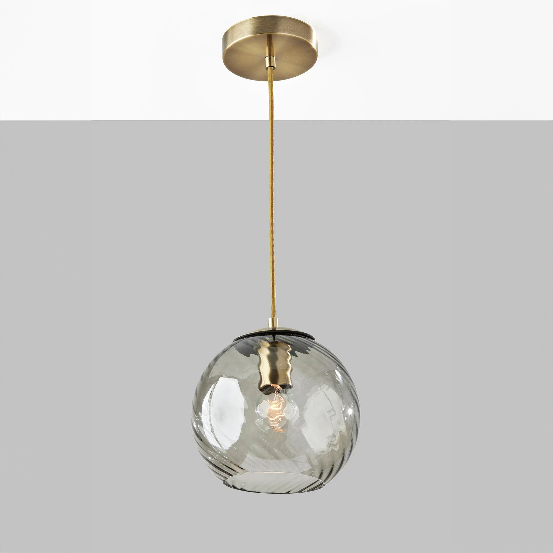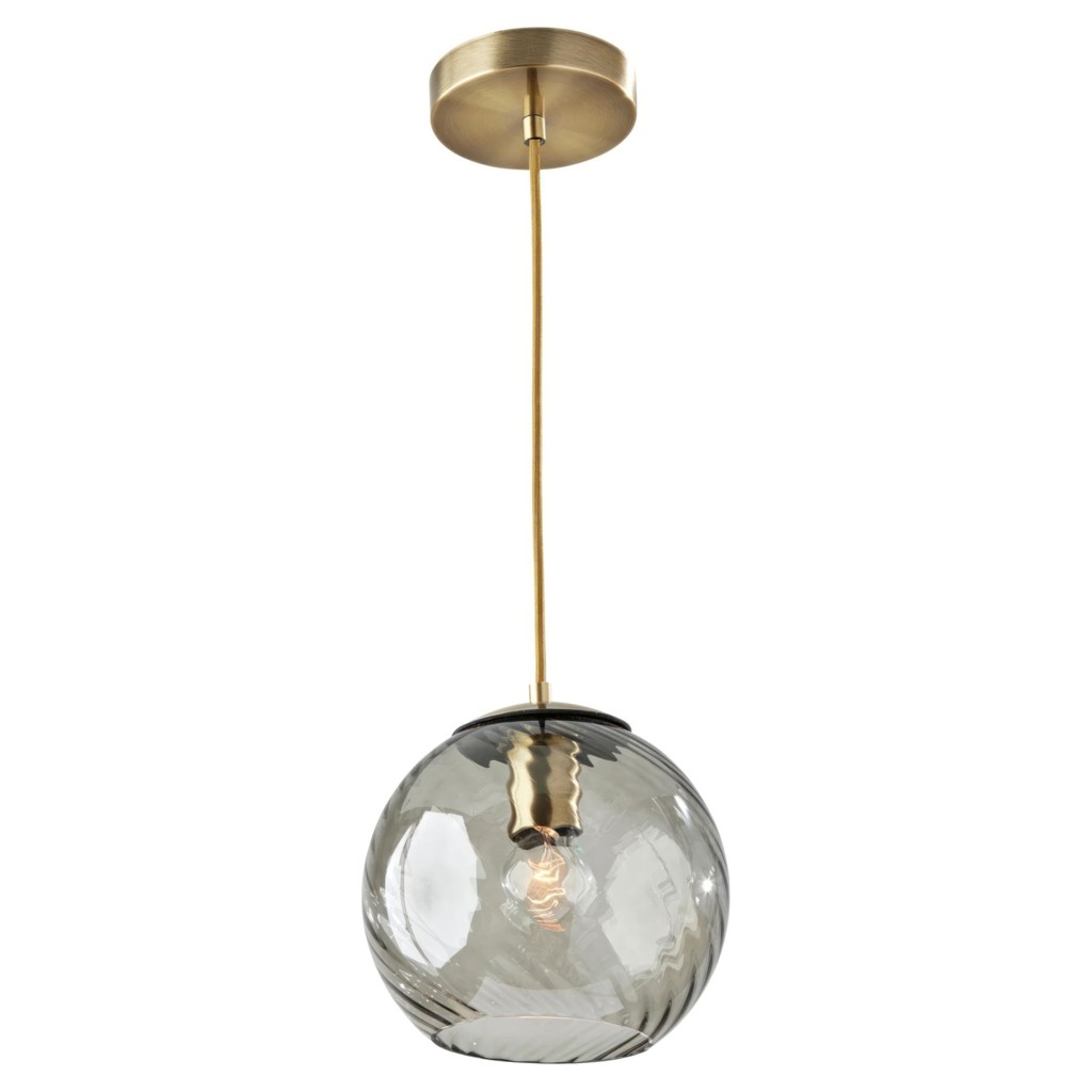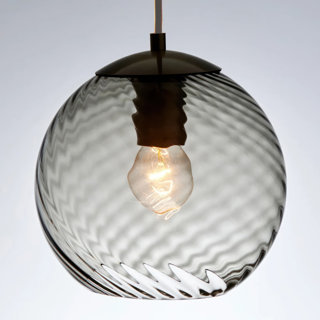 The shade is crafted of smoked glass with a delicate swirl pattern and leaves the 60W bulb visible, making a vintage Edison bulb (not included) a striking choice.