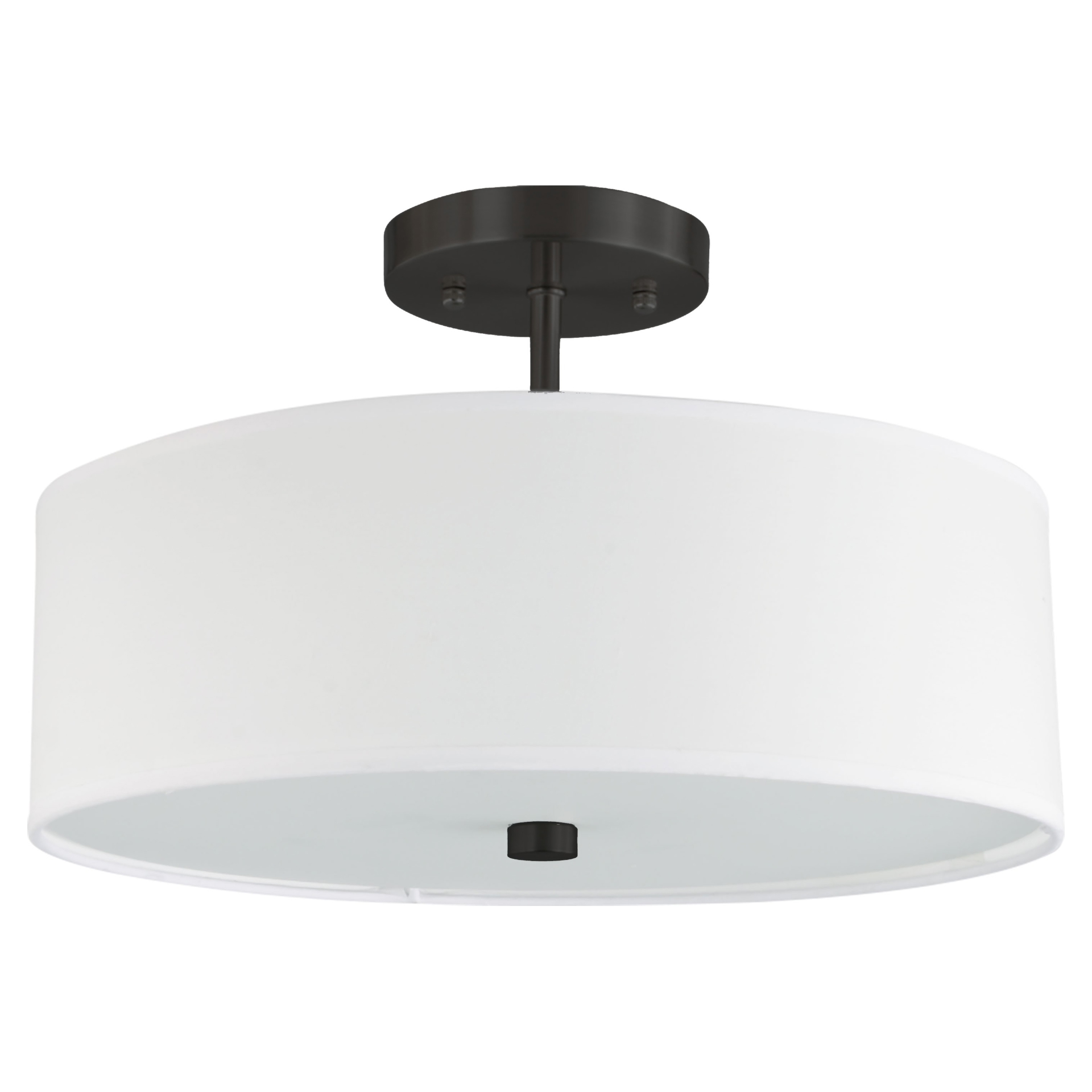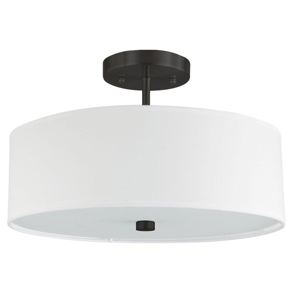 The metal frame drops to a relatively narrow drum shade, with a contrasting inner shade. From the metal frame to inner and outer shades, color options range from monochromatic to dramatic contrast.