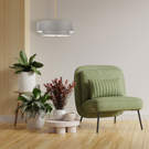 The metal frame drops to a relatively narrow drum shade, with a contrasting inner shade. From the metal frame to inner and outer shades, color options range from monochromatic to dramatic contrast.