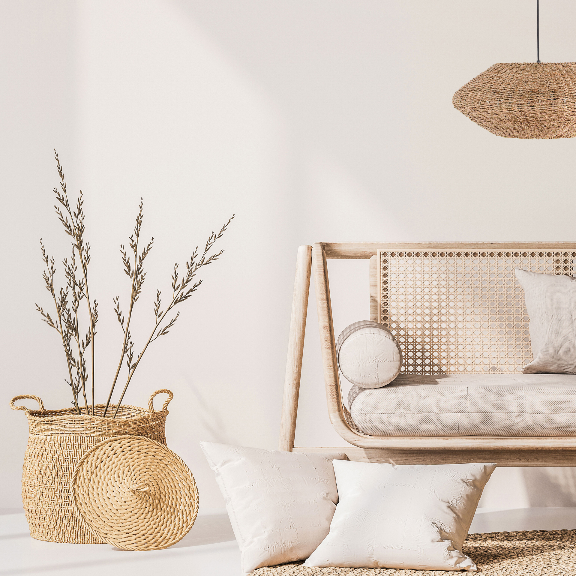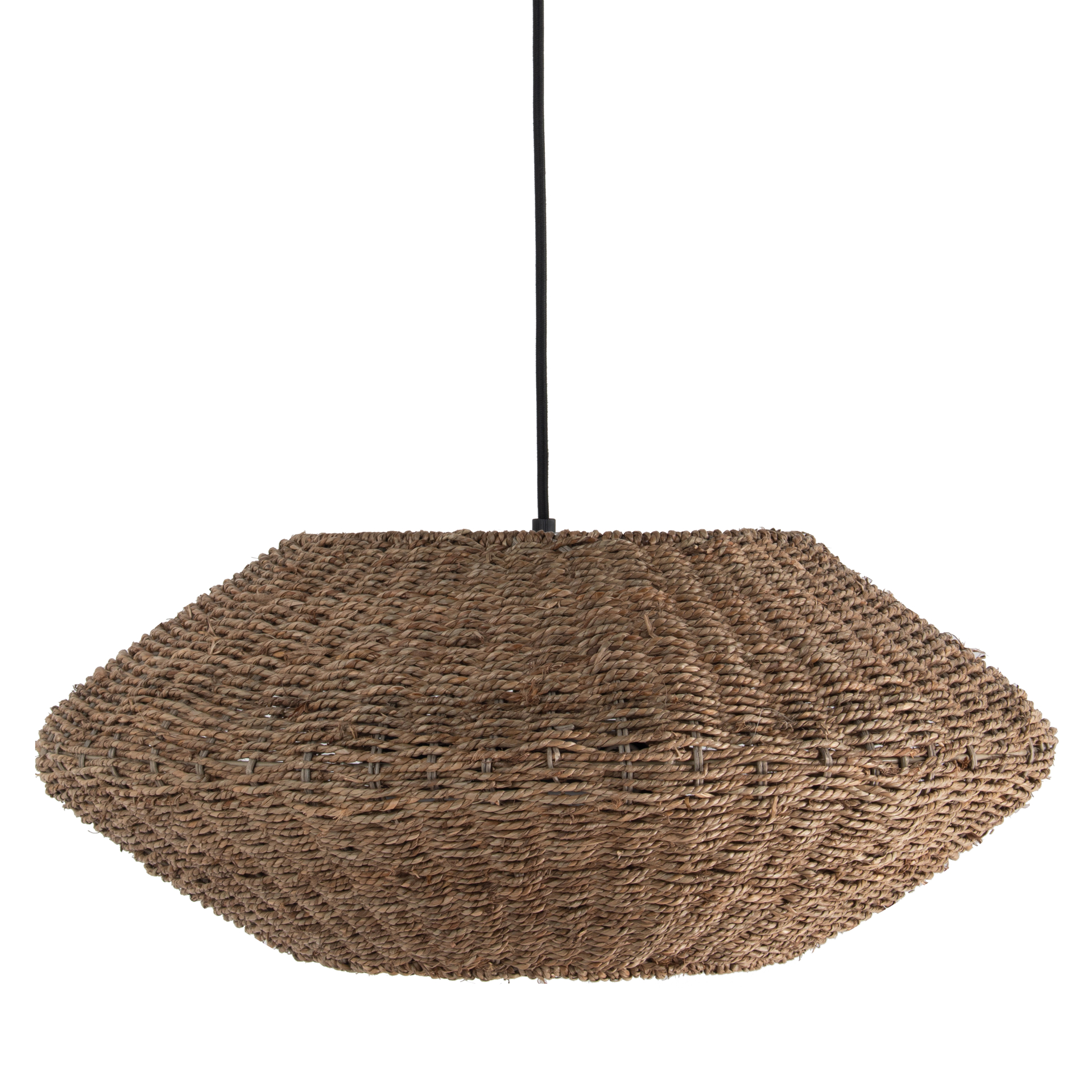 A metal frame in neutral matte black drops to a dome frame made of woven seagrass in a natural finish. It adds a neutral tone and soft lines that will create a striking contrast in minimalist modern homes. Pourel offers bright lighting and a subtle sense of style to your kitchen or living room.