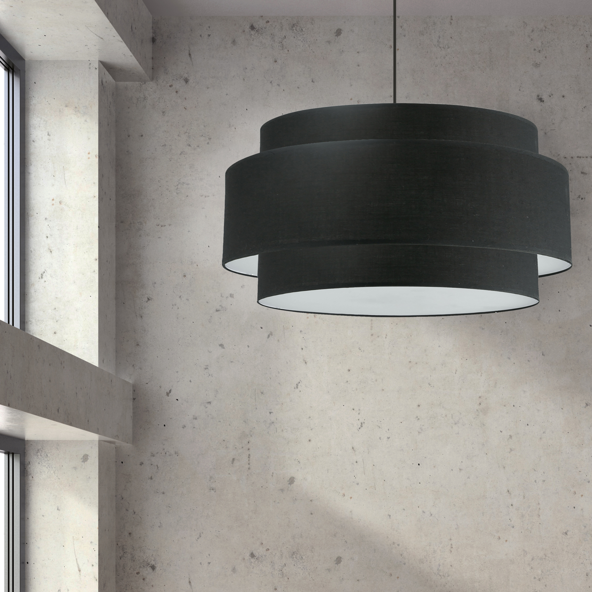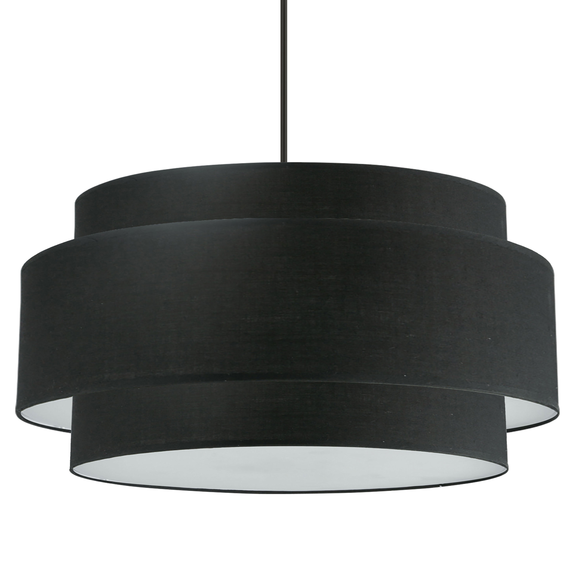 From a simple drop, the design is constructed with overlapping fabric drum shades. Color options include subtle monochromatic as well as contrasting configurations for added eye appeal. The effect is simple, yet stylish, and suitable for living or dining rooms, kitchens and hallways.