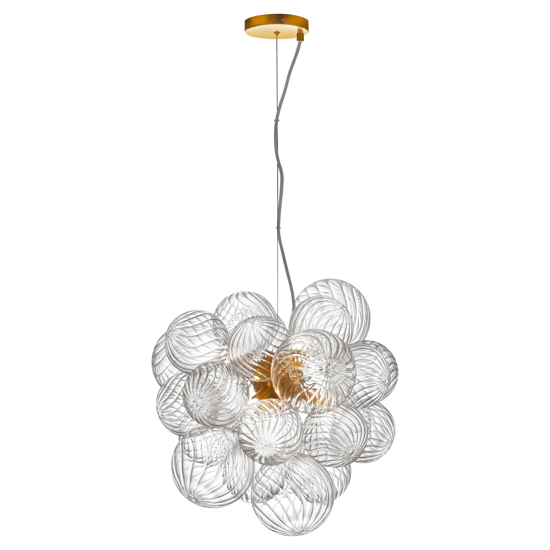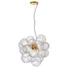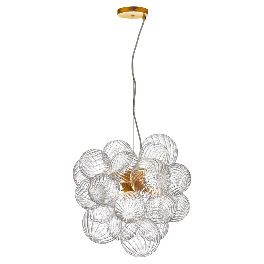 Contemporary Charlize pendant in spiral clear glass for the ceiling with 6 bulb, G9 socket base 40 Watts max dimmable and UL approved for damp with a one year limited warranty.