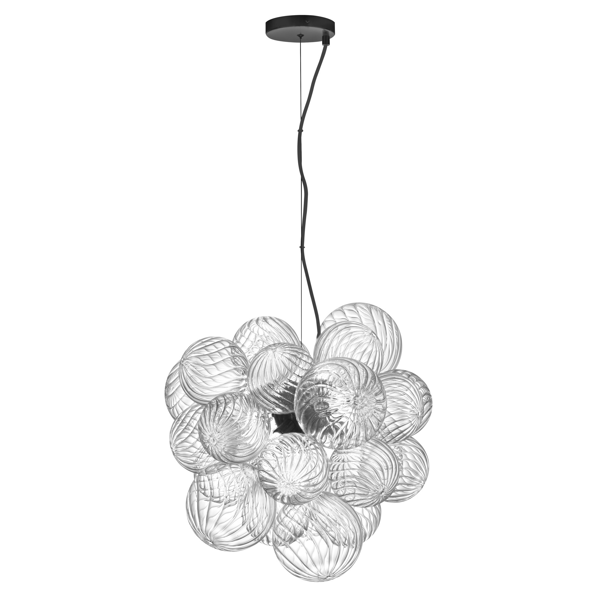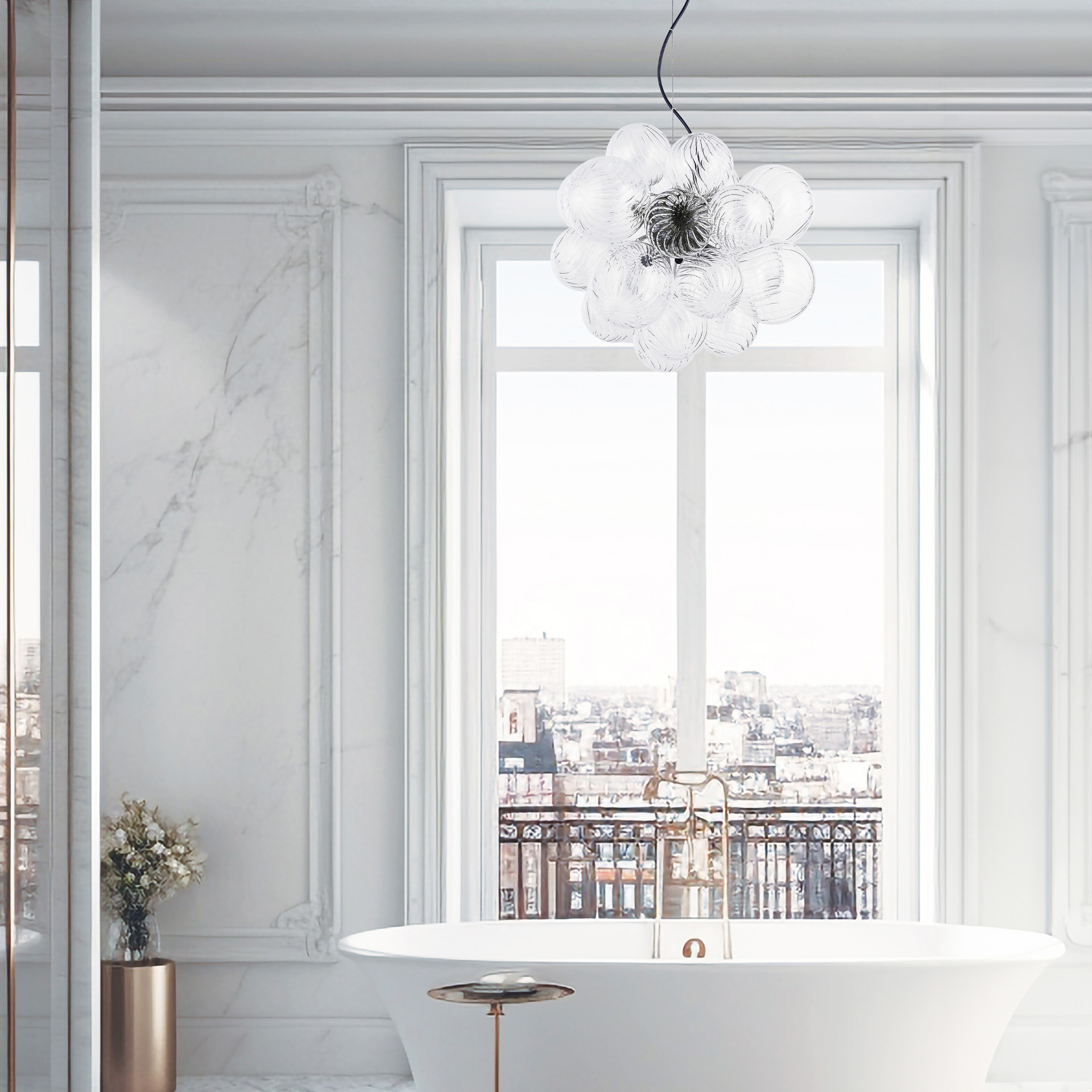 Contemporary Charlize pendant in spiral clear glass for the ceiling with 6 bulb, G9 socket base 40 Watts max dimmable and UL approved for damp with a one year limited warranty.