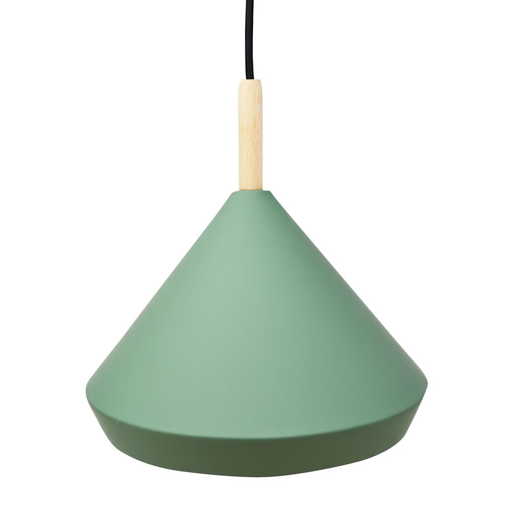 This modern pendant features a conical green metal shade, combined with a natural wood element that adds an organic touch to the design.