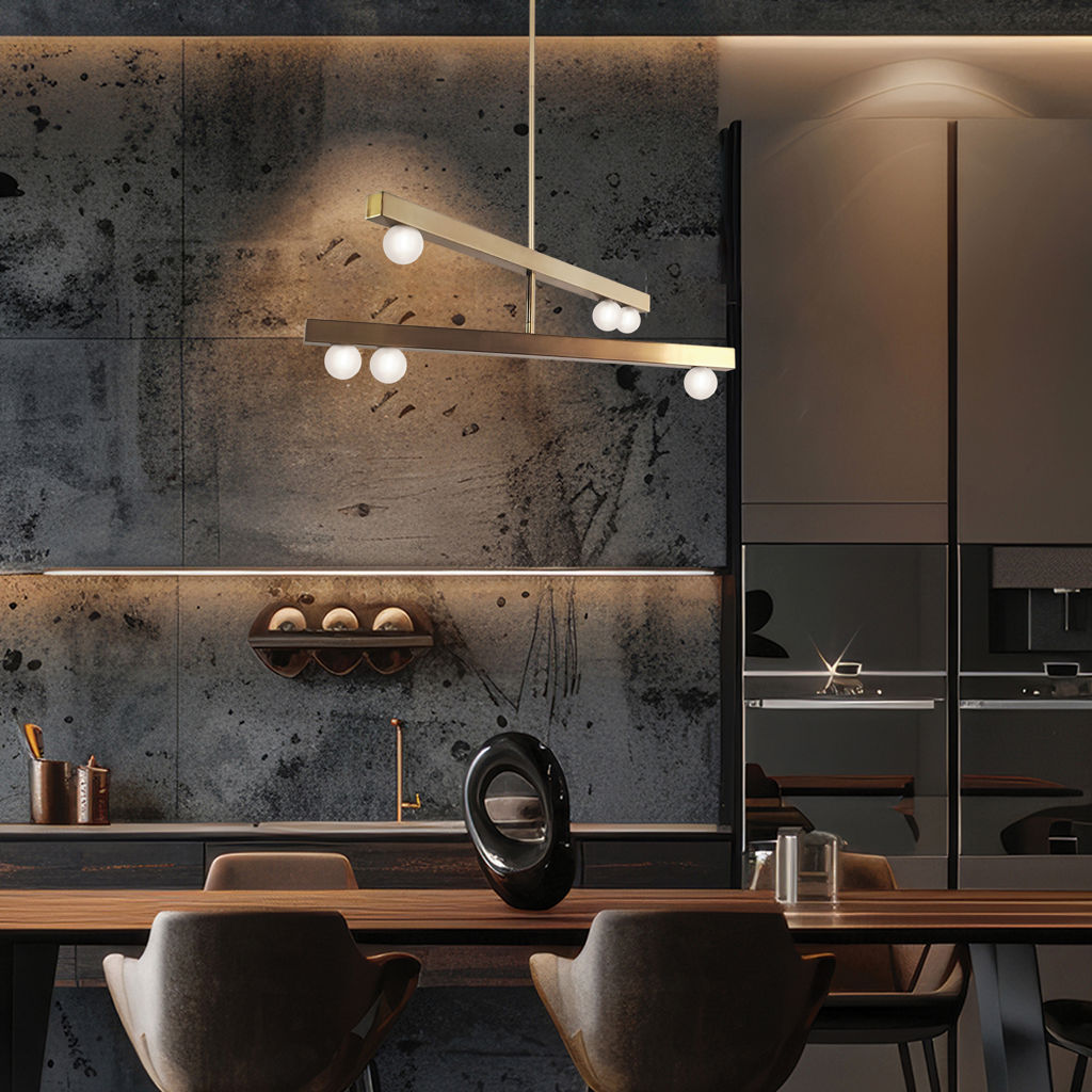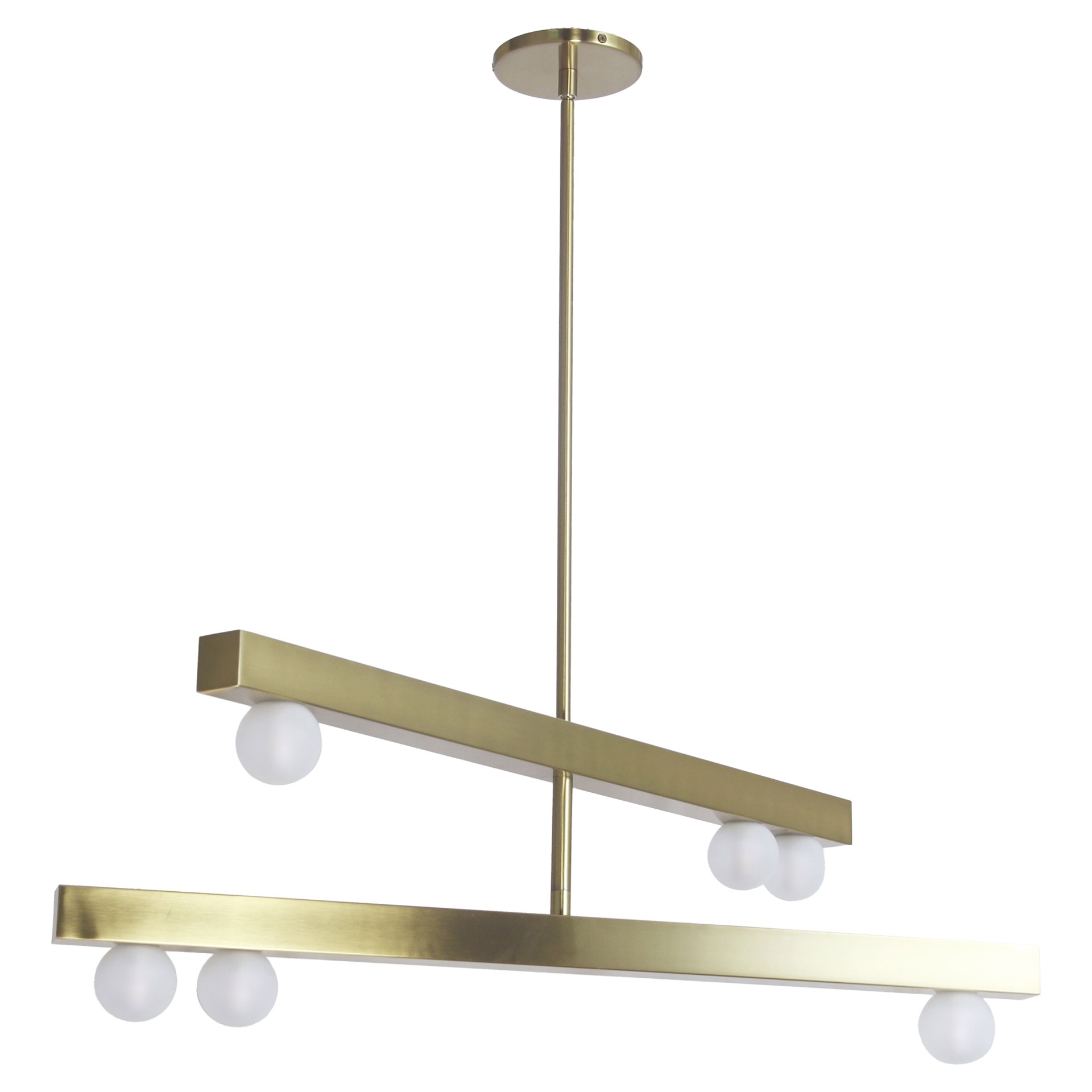 Modern Raleigh pendant in electroplated aged brass metal with 6 bulb, G9 socket base, 25W max, dimmable, and UL approved for damp locations, with a 1 Year limited warranty.