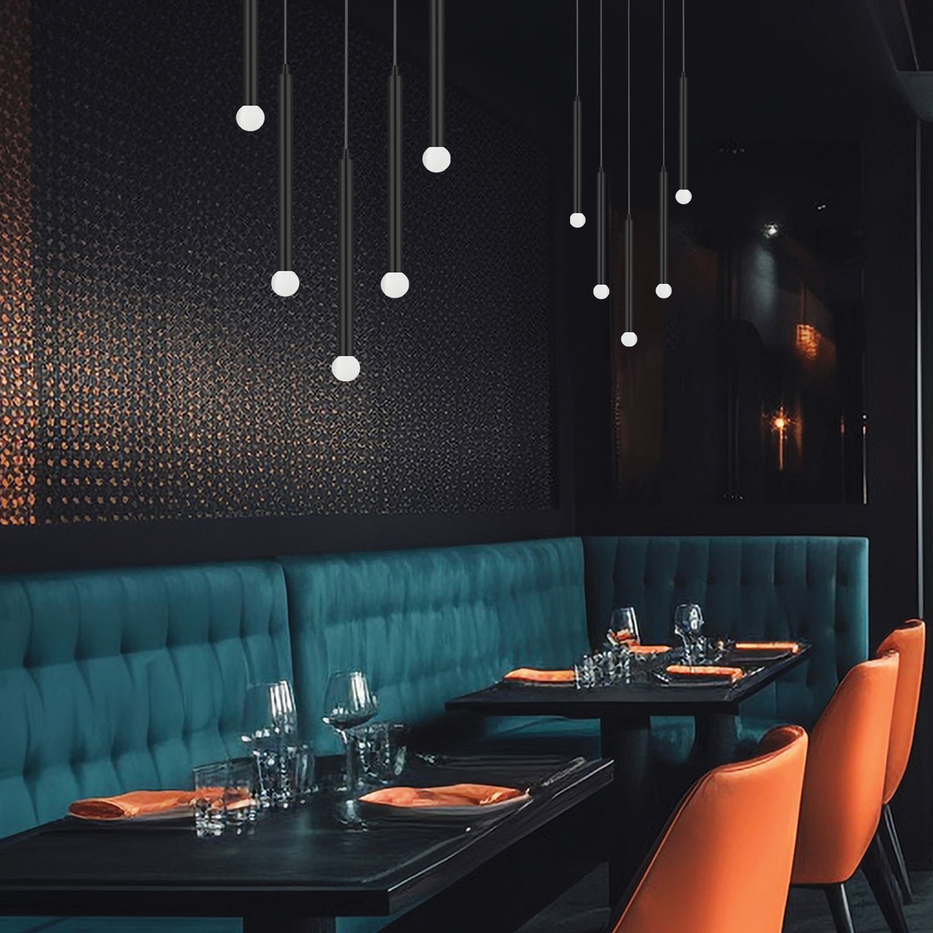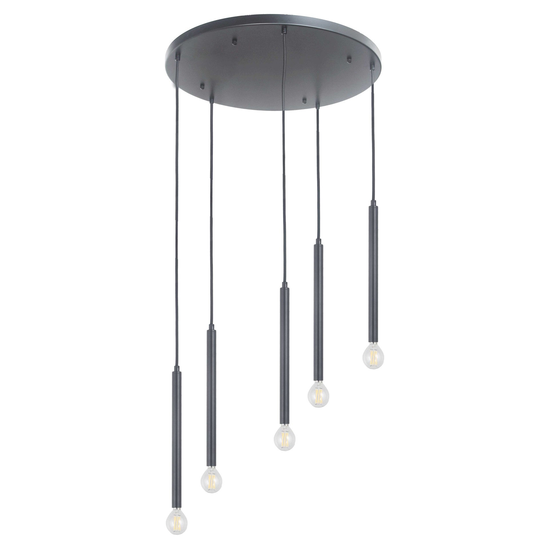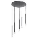 Sanya modern pendant in matte black painted metal with 5 bulbs, E12 base 60 watts max. Dimmable and UL-listed for humidity with one-year limited warranty.