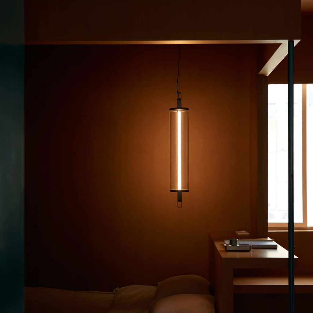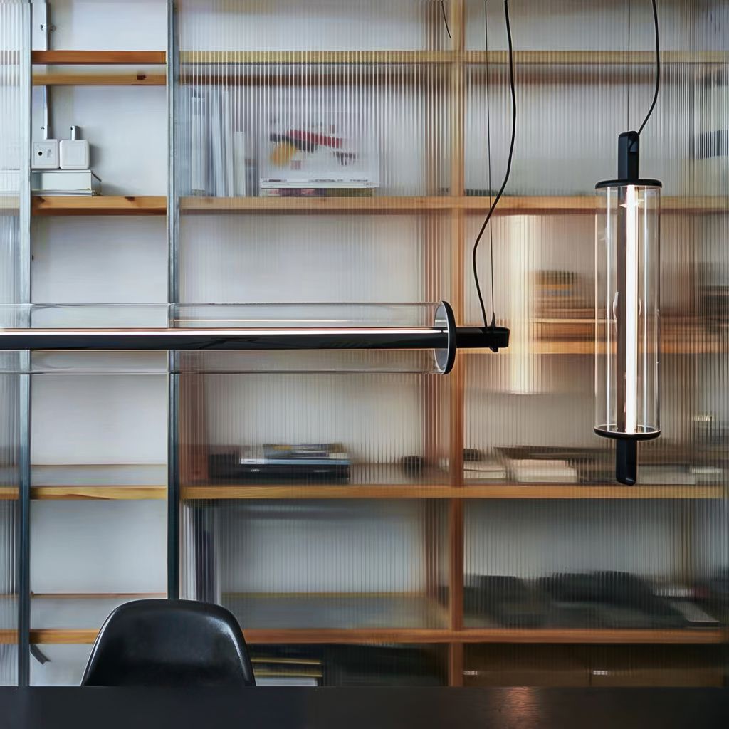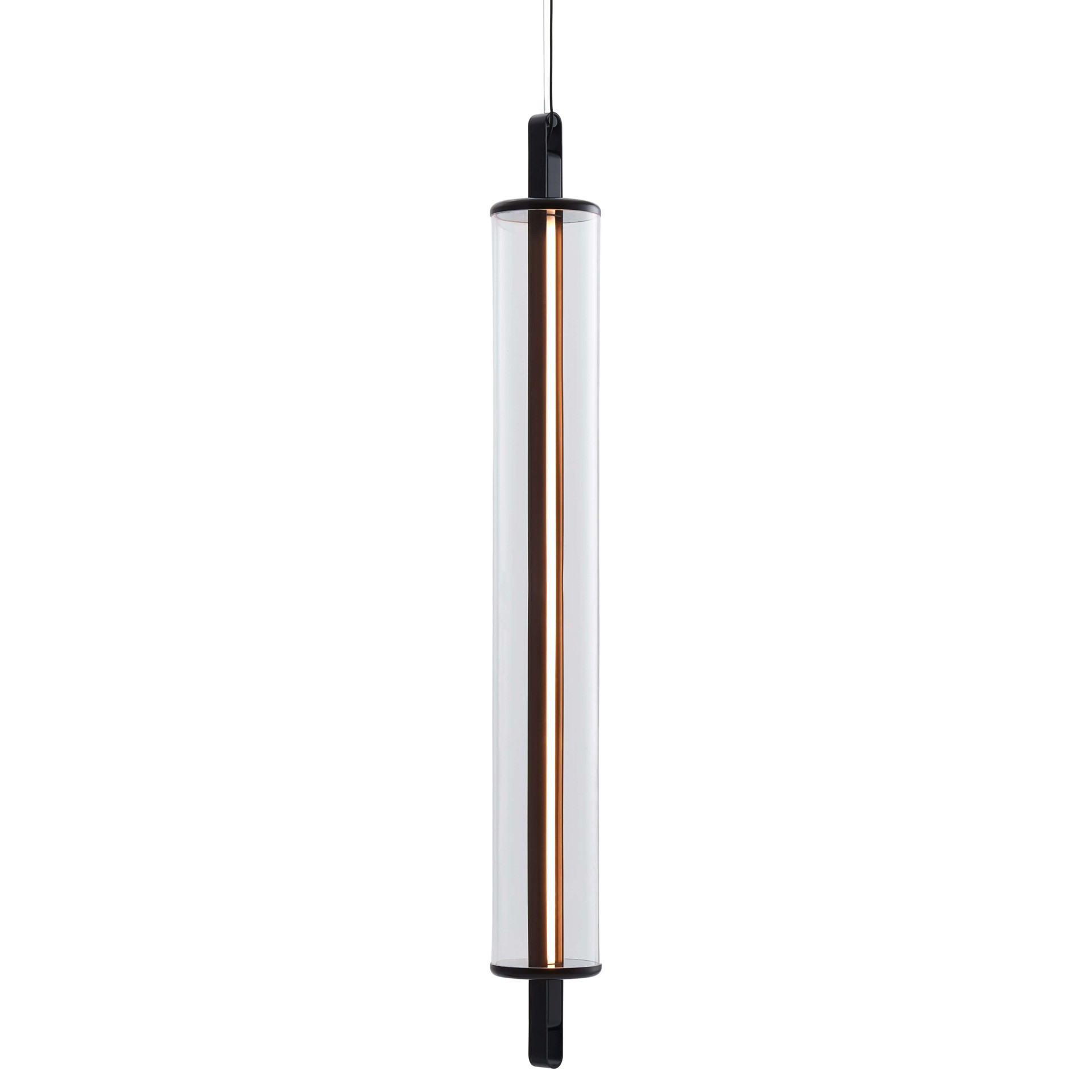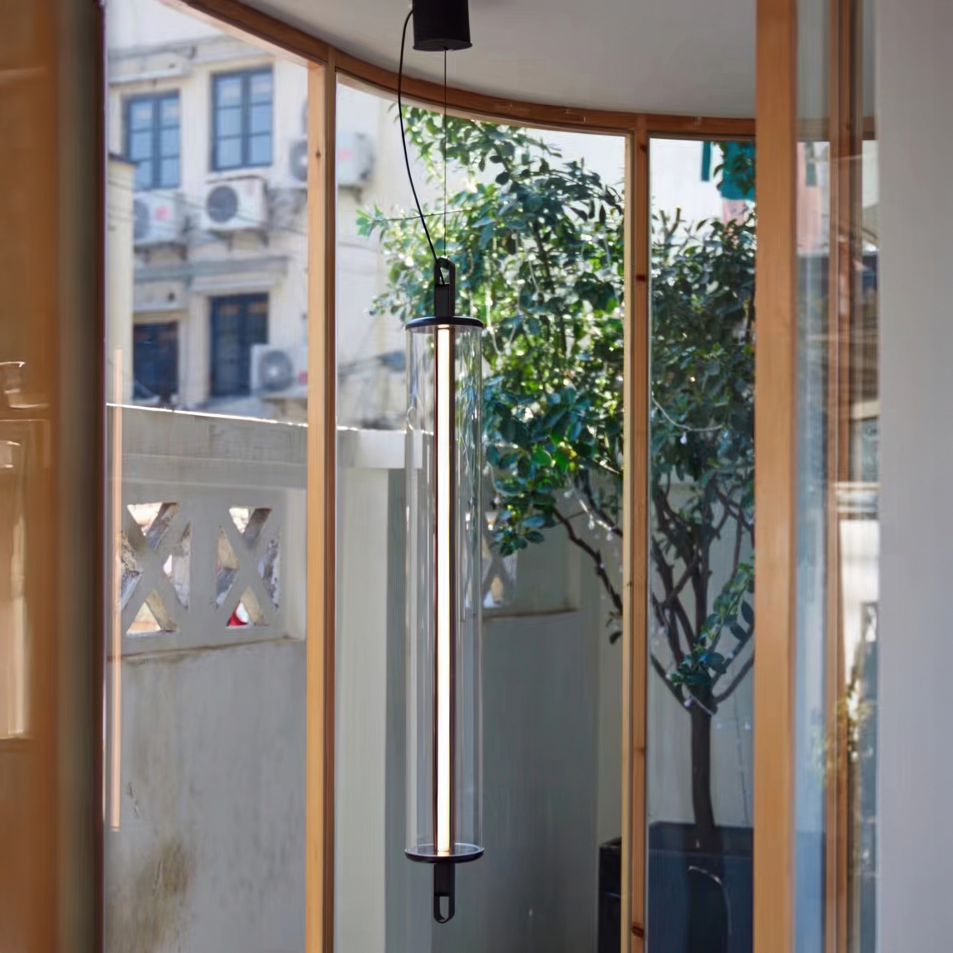 The delicate black metal strip pierces through the cylindrical glass, subtly concealing the light source.