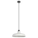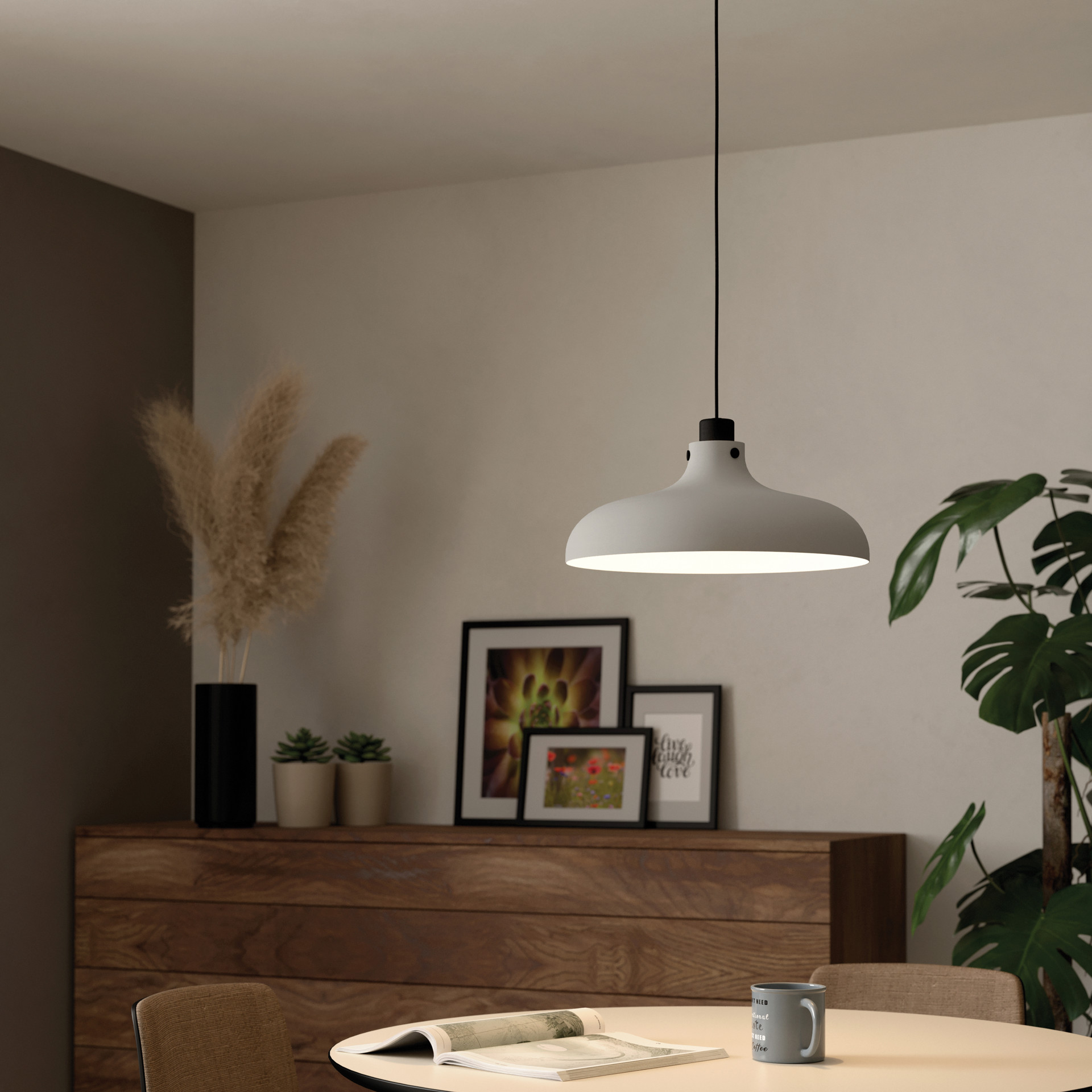 The Matlock pendant light has a conical metal lampshade with a pale grey finish and black industrial accents.