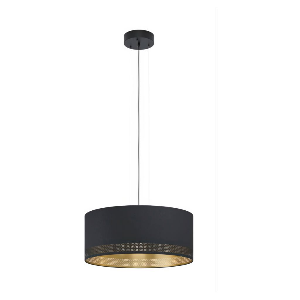The Esteperra pendant light features a black fabric shade with an inner gold lining.