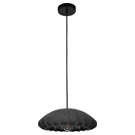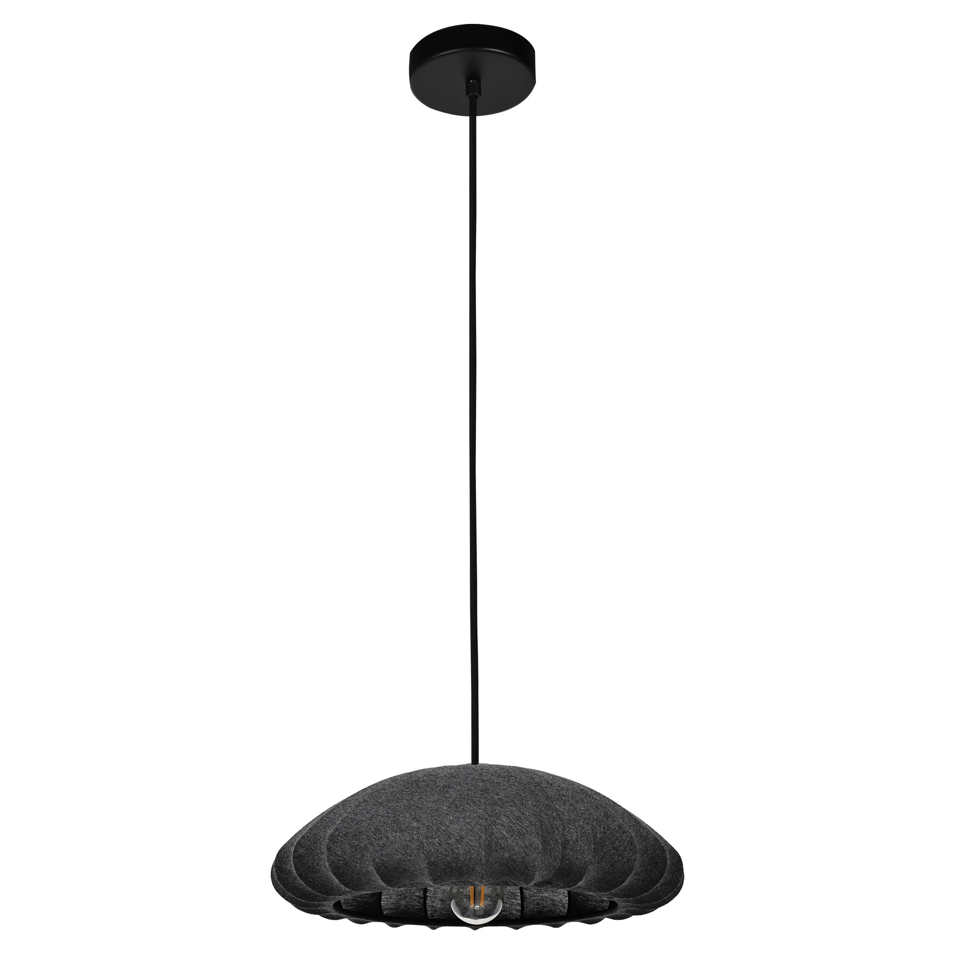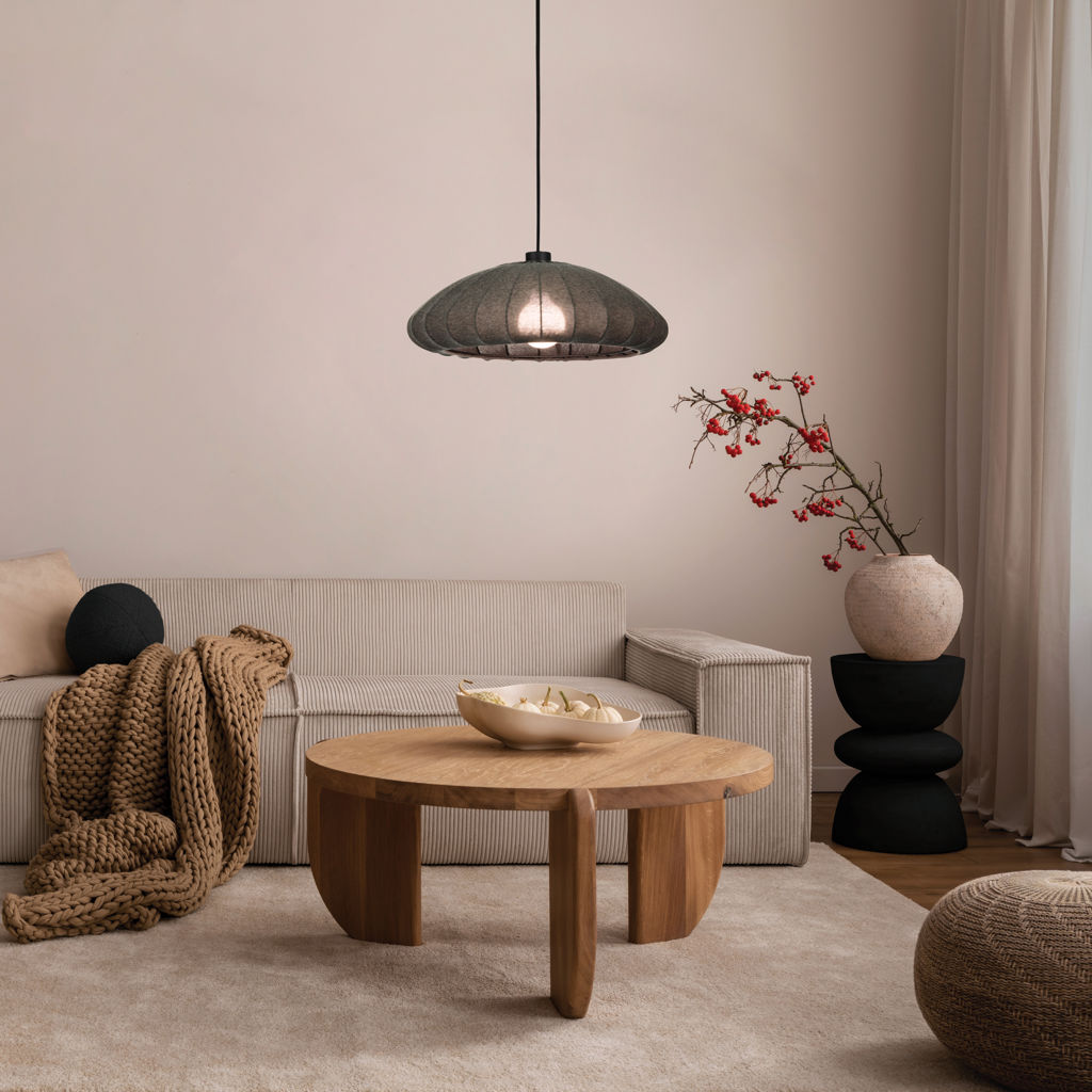 The Barlaston pendant features an organically shaped, grey fabric lampshade with a black steel ceiling mount.