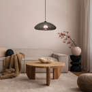 The hanging pendant  has a striking blend of fabrics, metals, and textiles, offering atmospheric lighting for every room with a Japanese inspired style.