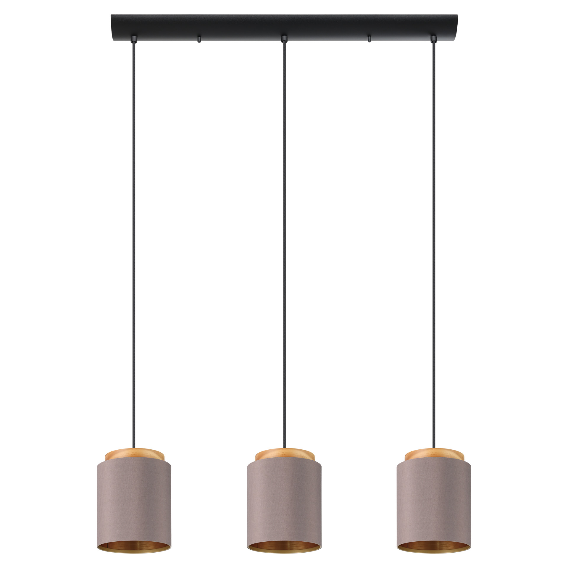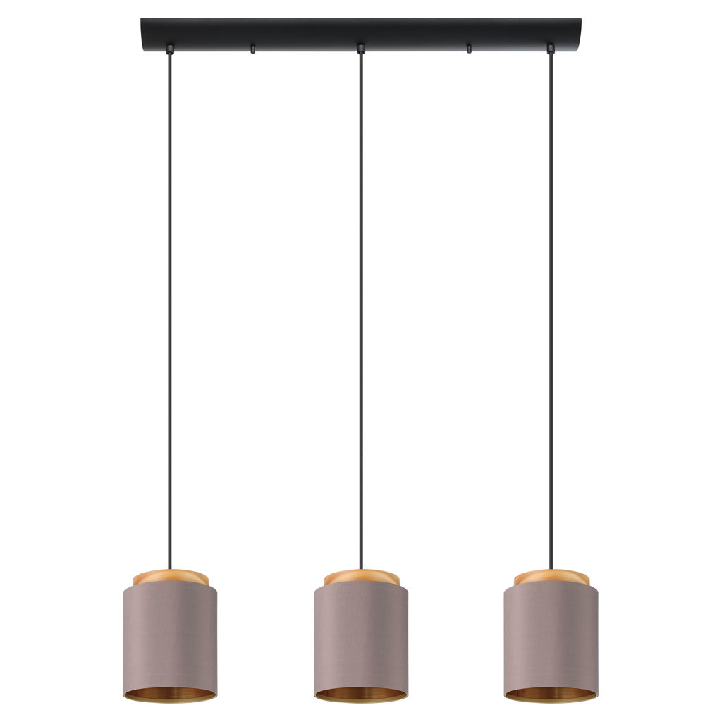 The Albariza pendant light features cylindrical shades mixing fabric with natural rubberwood. The shade creates a cozy and welcoming lighting once illuminated.
