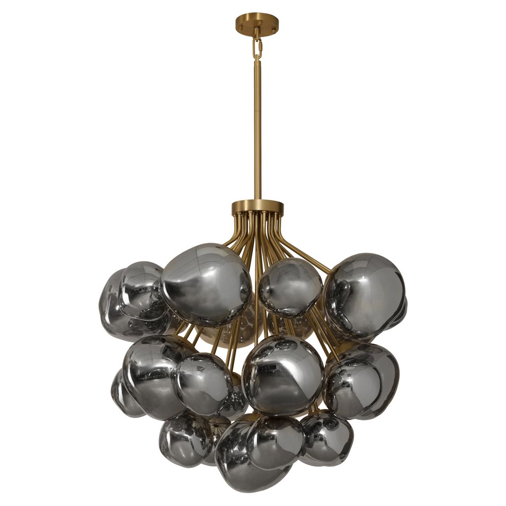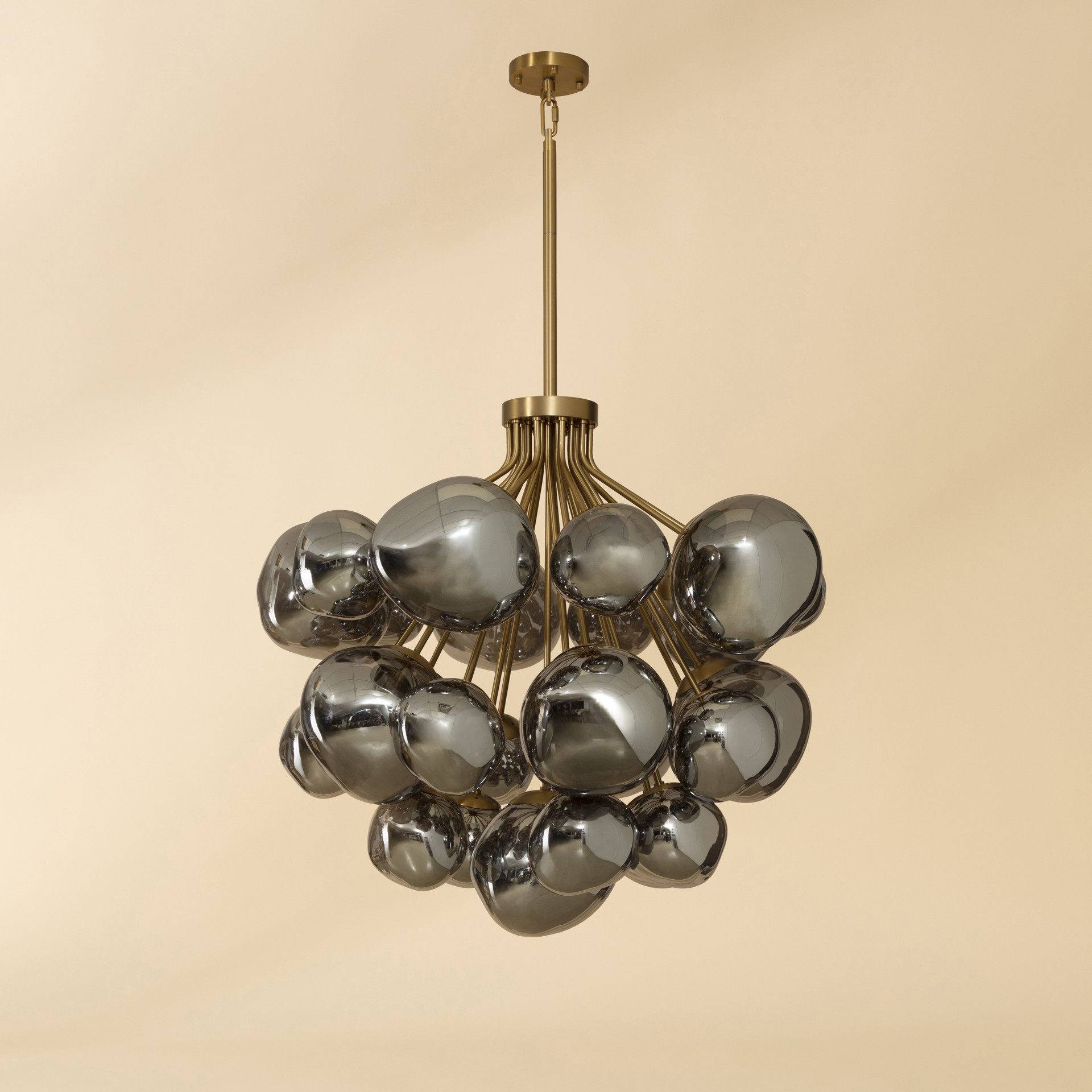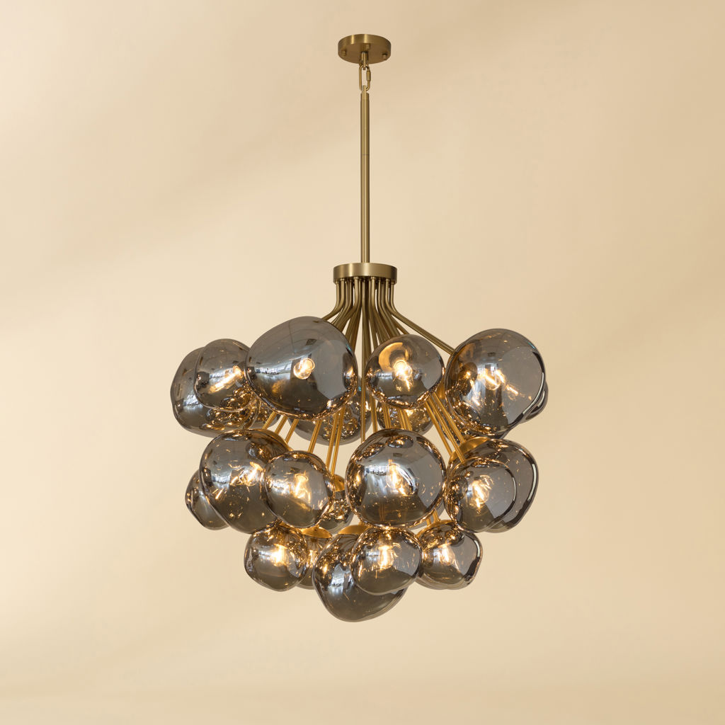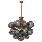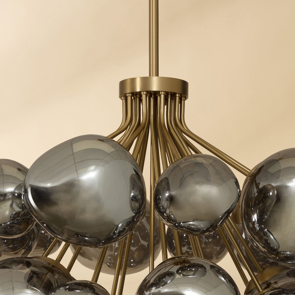 Suspended from a brushed gold iron frame, glass globes in two different sizes are artfully arranged to cast a brilliant, radiant light.