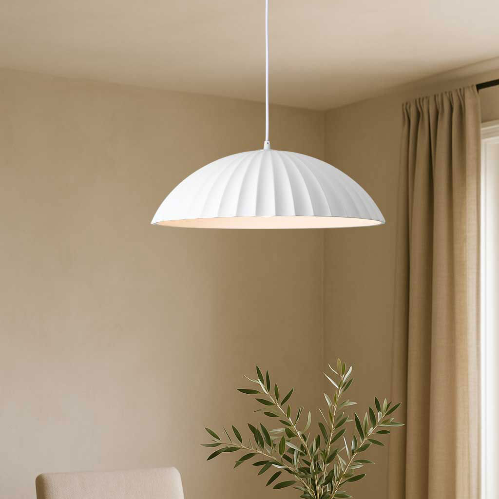 Enhance your space with this stylish ribbed dome pendant featuring a crisp matte white finish and a sculpted shade crafted from durable metal and plaster.