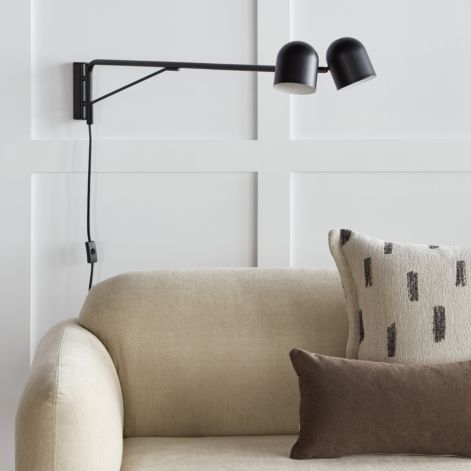 A white or black powder-coated finish shines when paired with thoughtful details like adjustable lamp heads, a fabric-covered cord, and a convenient hand switch.