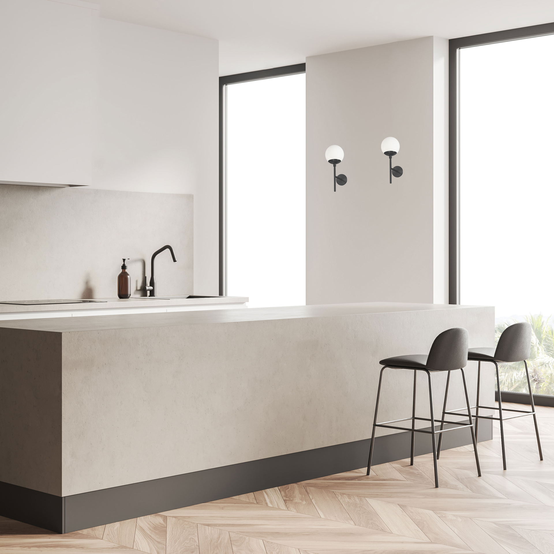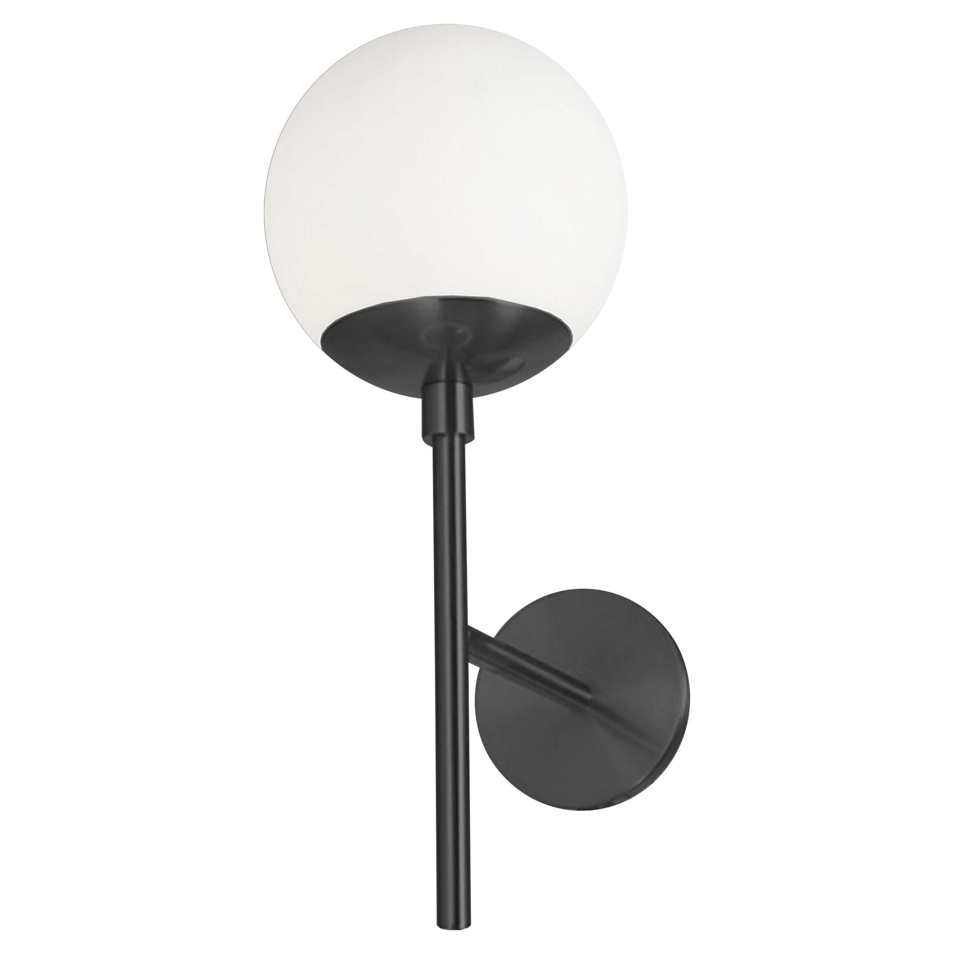 The metal base in matte black, polished chrome or aged brass finish comes in a variety of linear configurations, some straight and others curved. Lighting emanates from round glass housing in a soft opal finish.