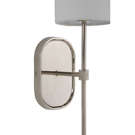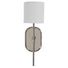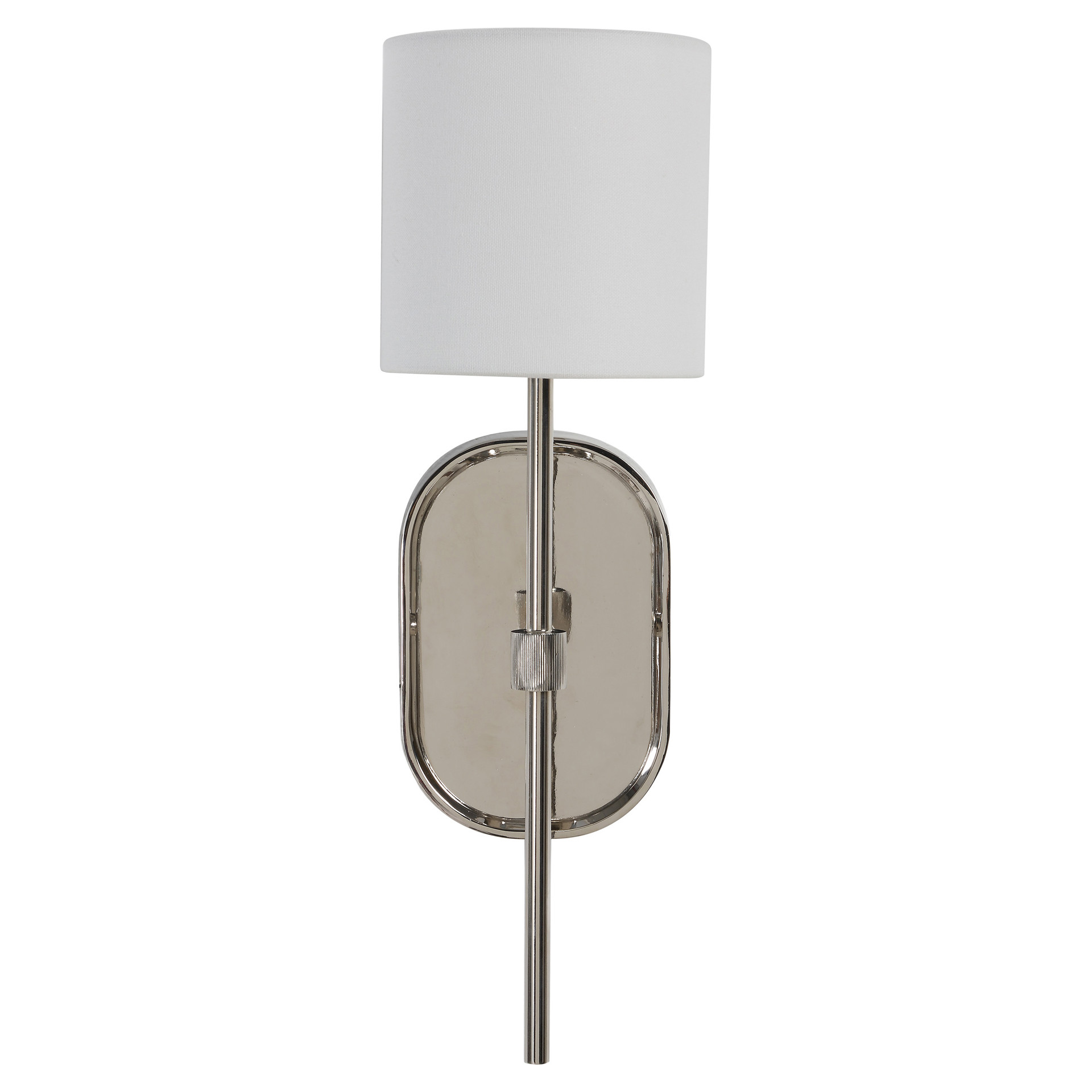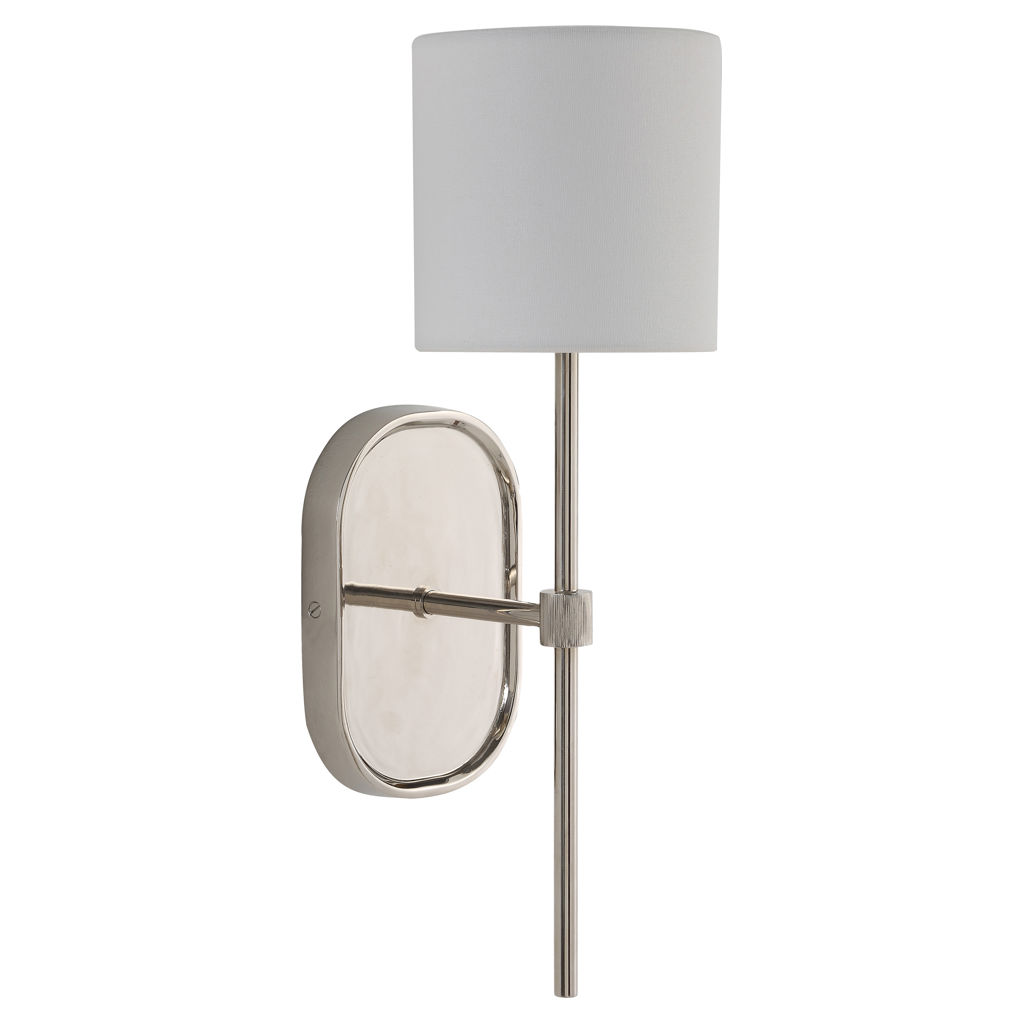 Combining sleek polished nickel-plated forged aluminum and pure ivory linen, incorporate this handsome wall sconce in your decorating scheme to deliver transitional charm and warm, ambient light at the flick of a switch.