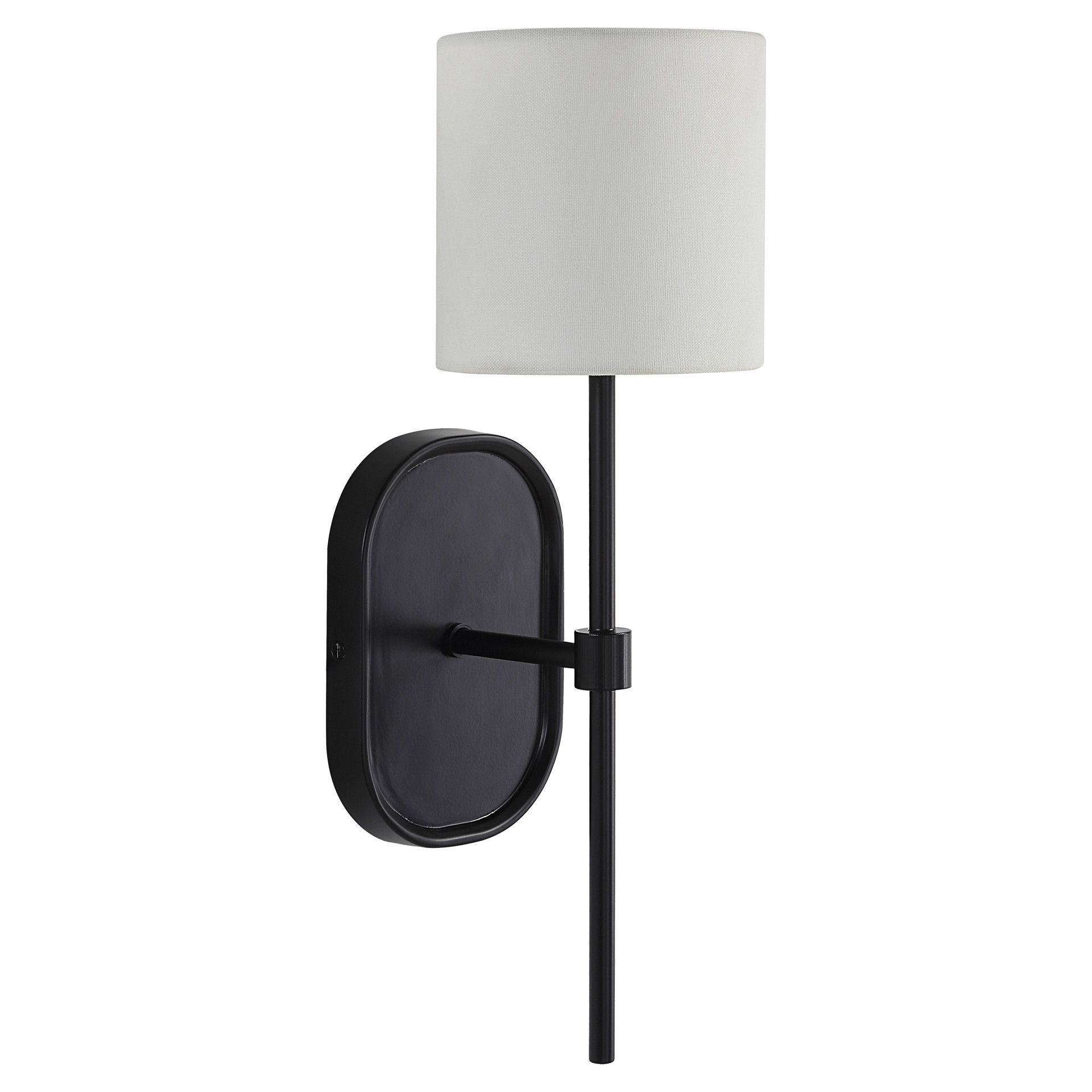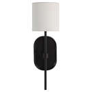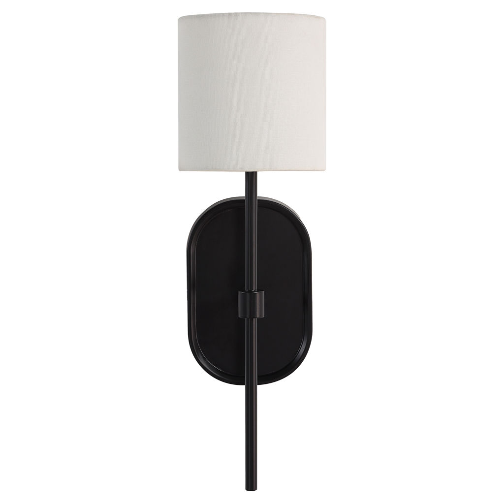 Combining sleek polished nickel-plated forged aluminum and pure ivory linen, incorporate this handsome wall sconce in your decorating scheme to deliver transitional charm and warm, ambient light at the flick of a switch.