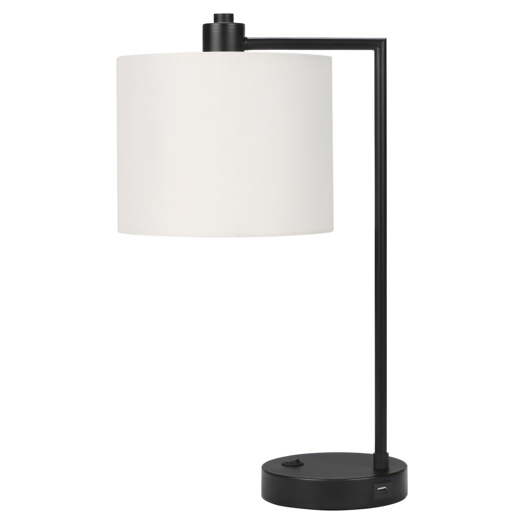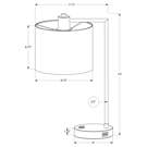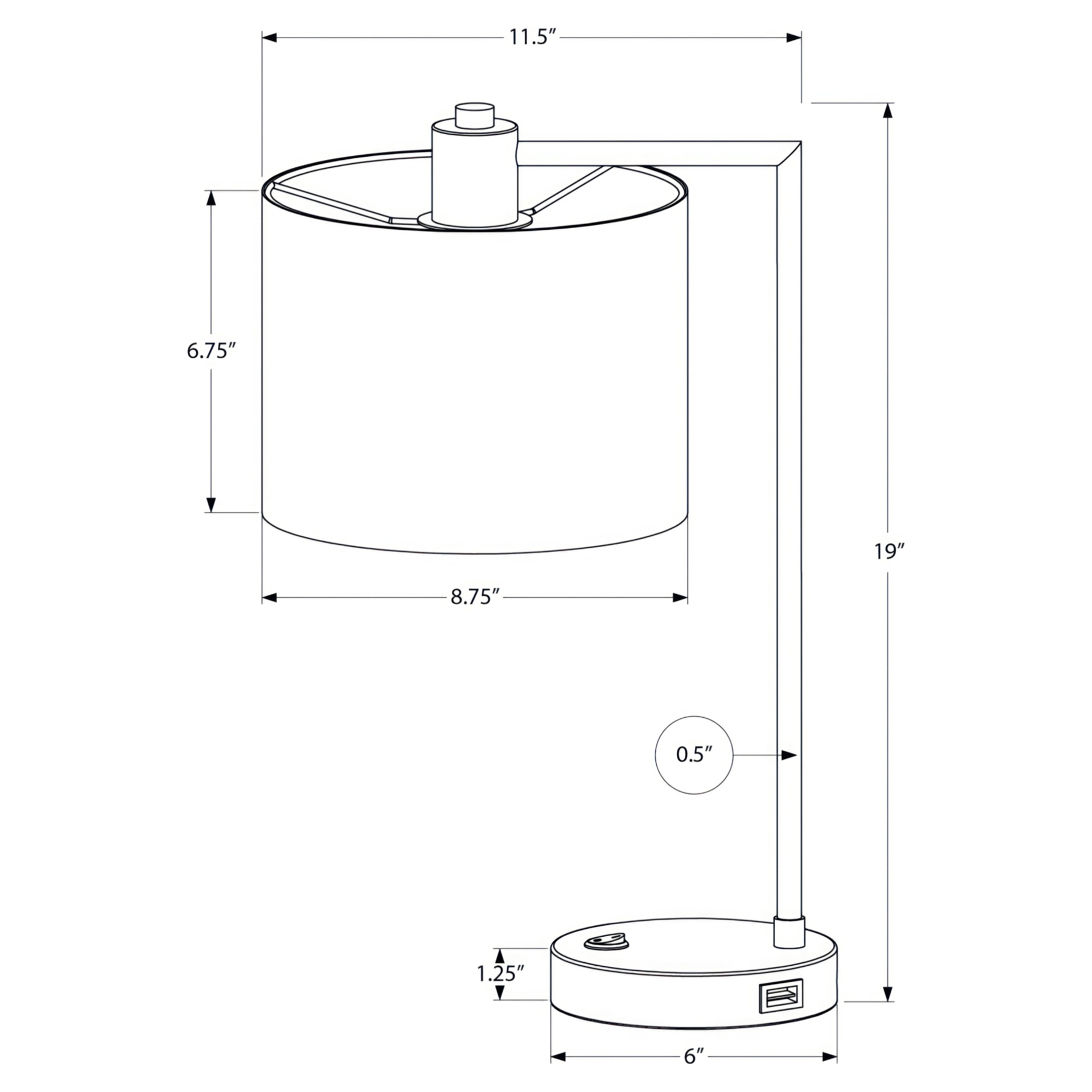 This practical lamp is attached with a 6ft black cord, a convenient built-in on/off rocker switch and USB port at the base to re-charge your device, and housing a single bulb (not included) for a maximum light output of 60W/120V.