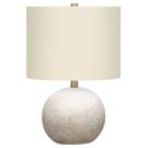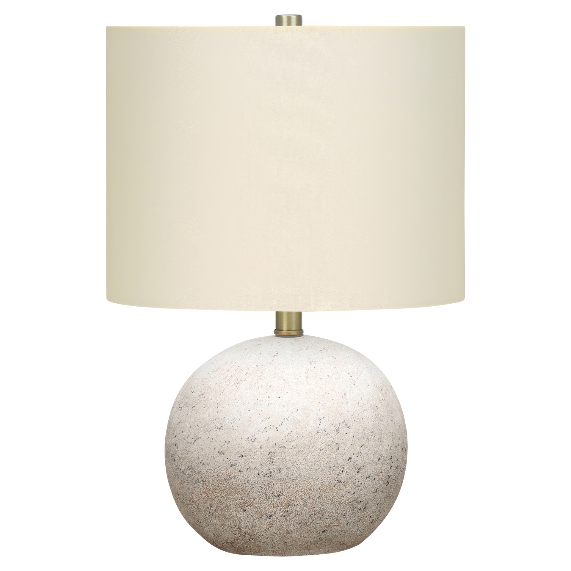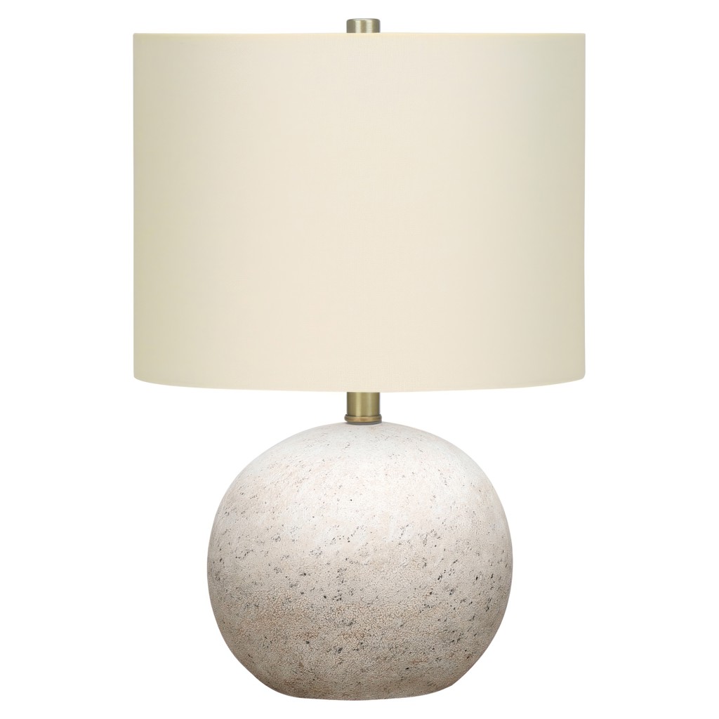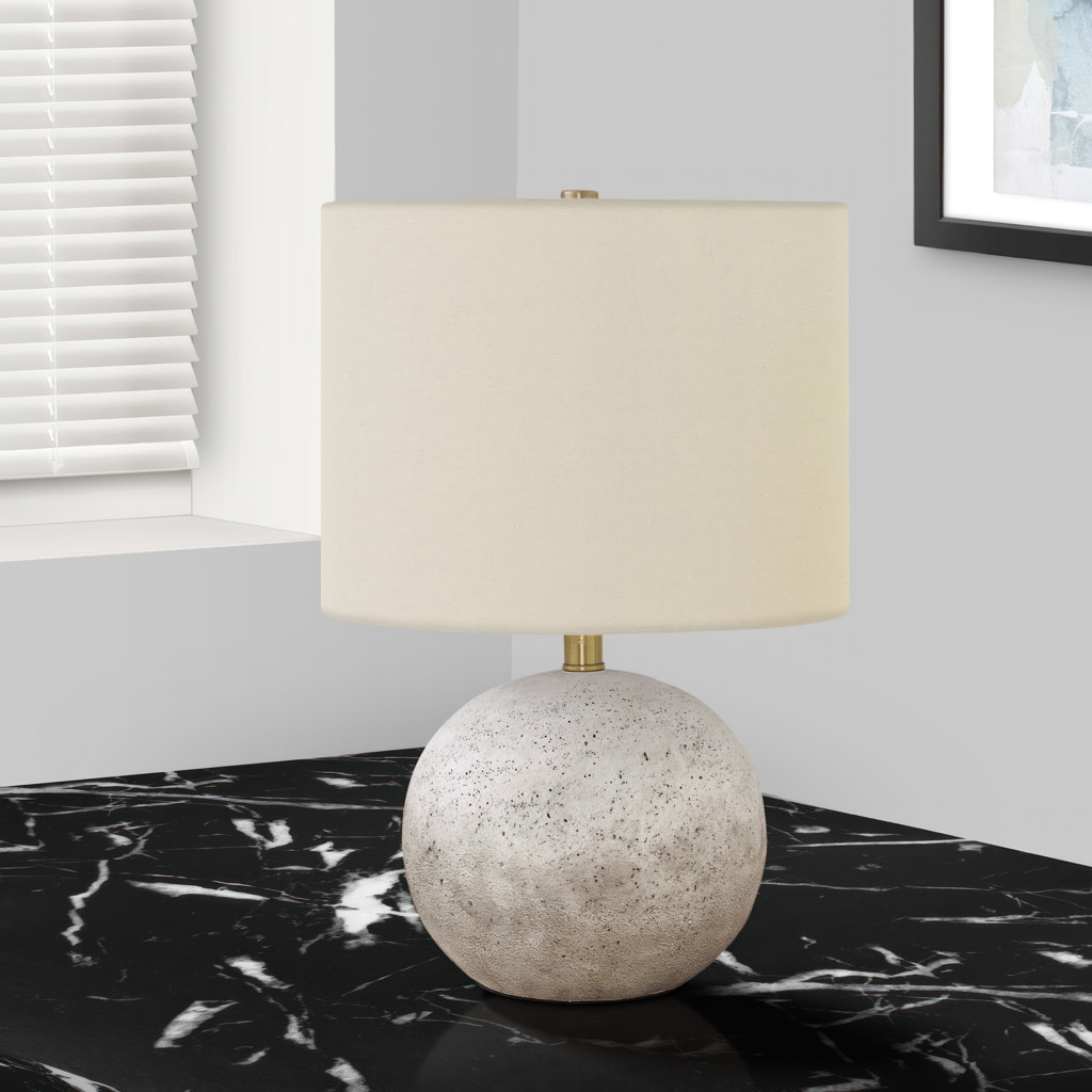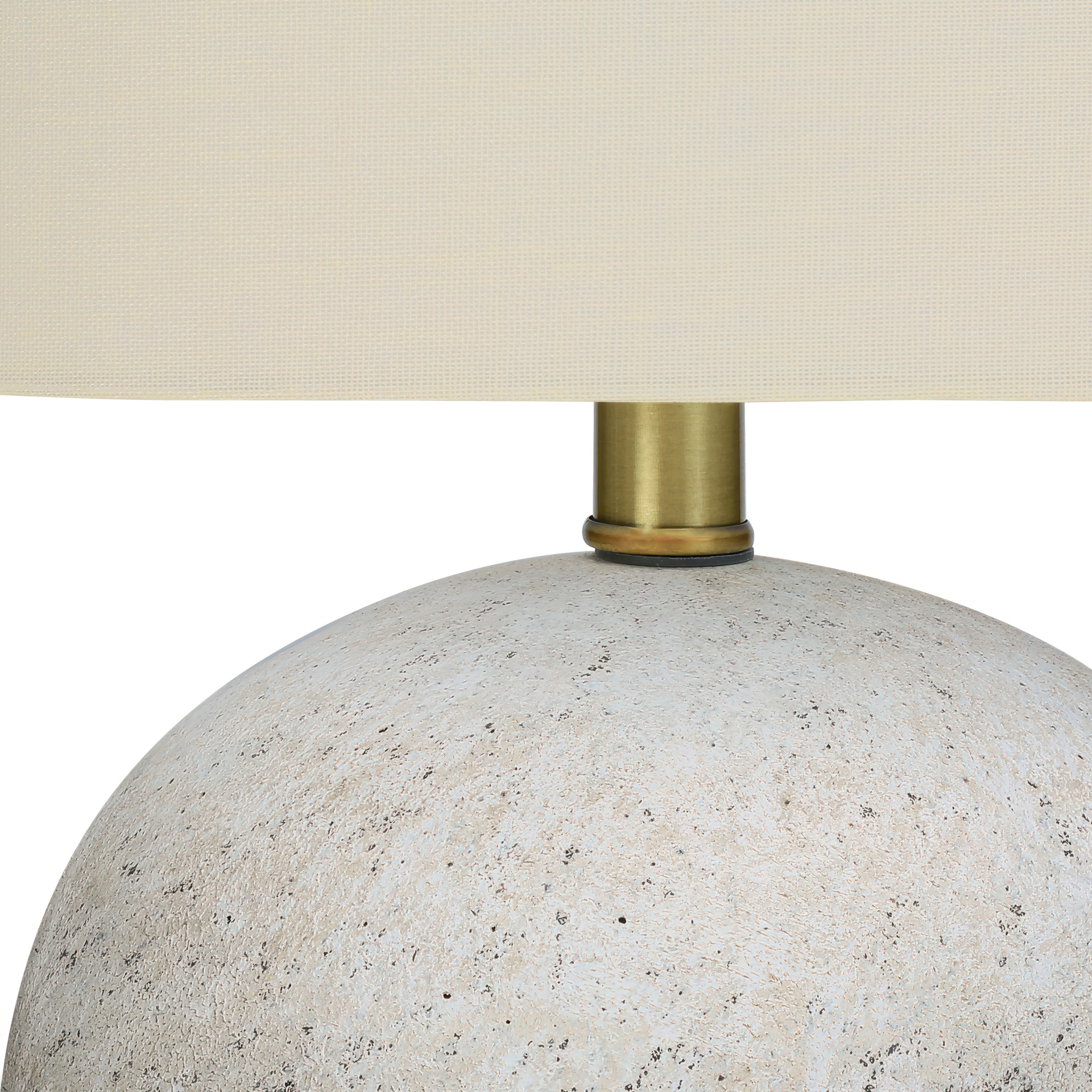 This stylish and fashionable 20"h sphere shaped table lamp with a grey concrete base in a textured finish, and topped with an ivory linen drum shade and gold metal finial will be a standout accent to brighten any room.