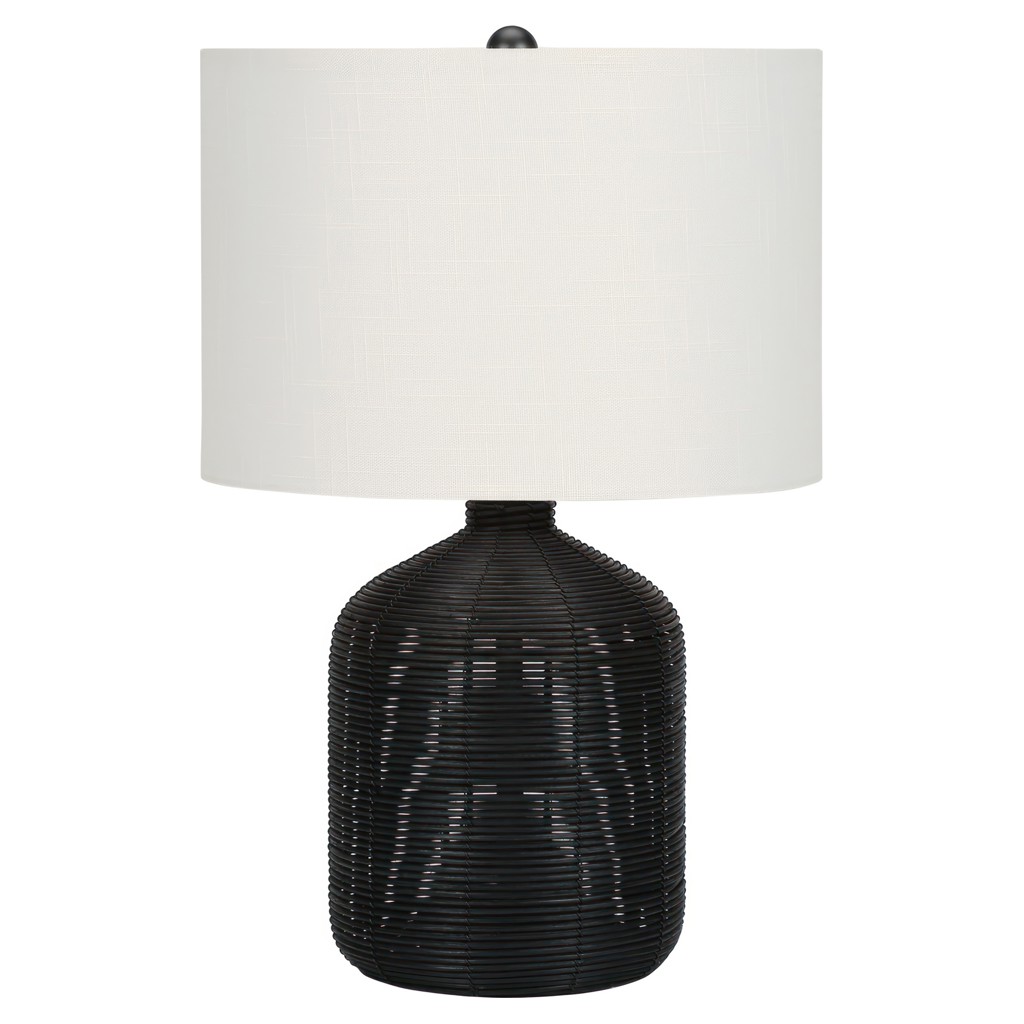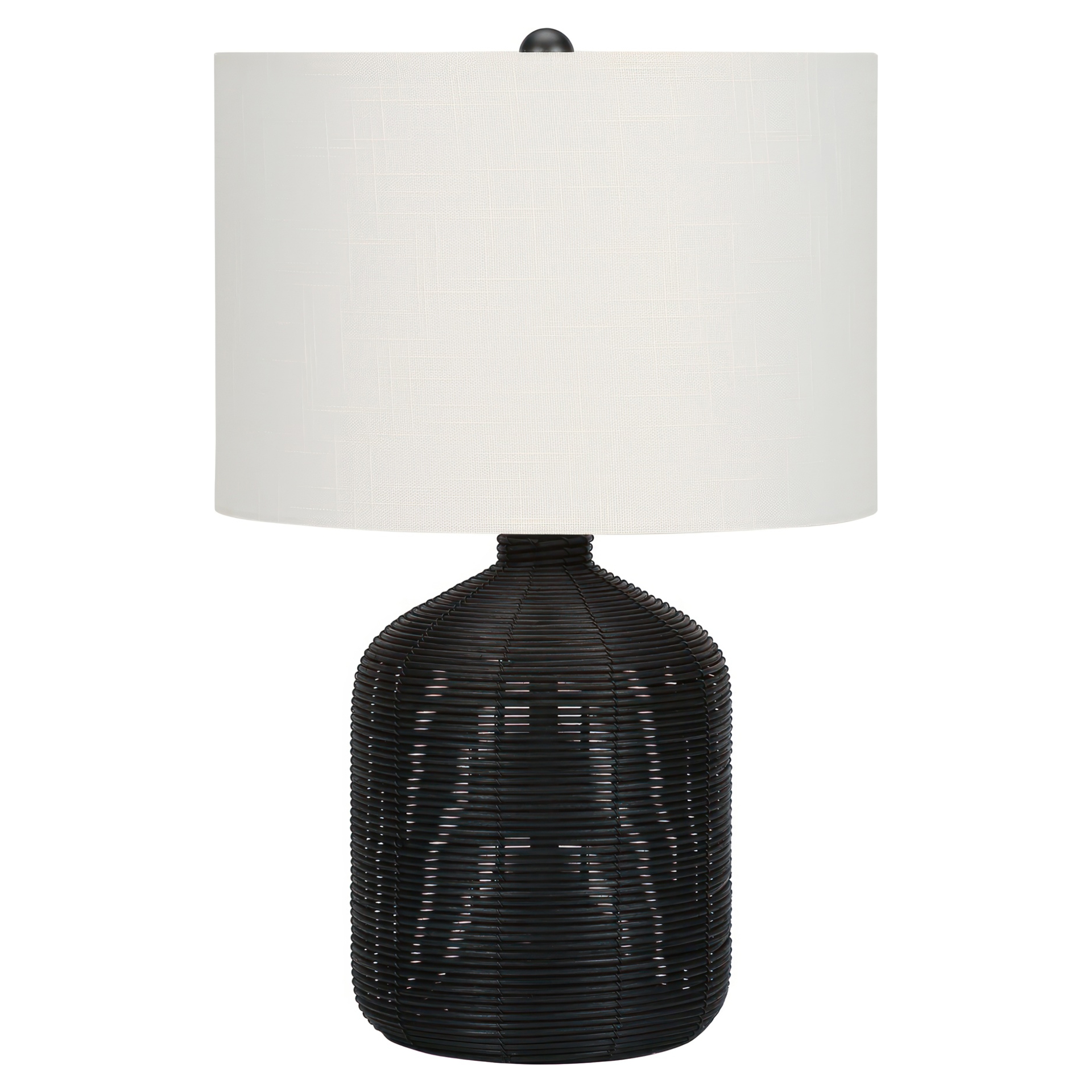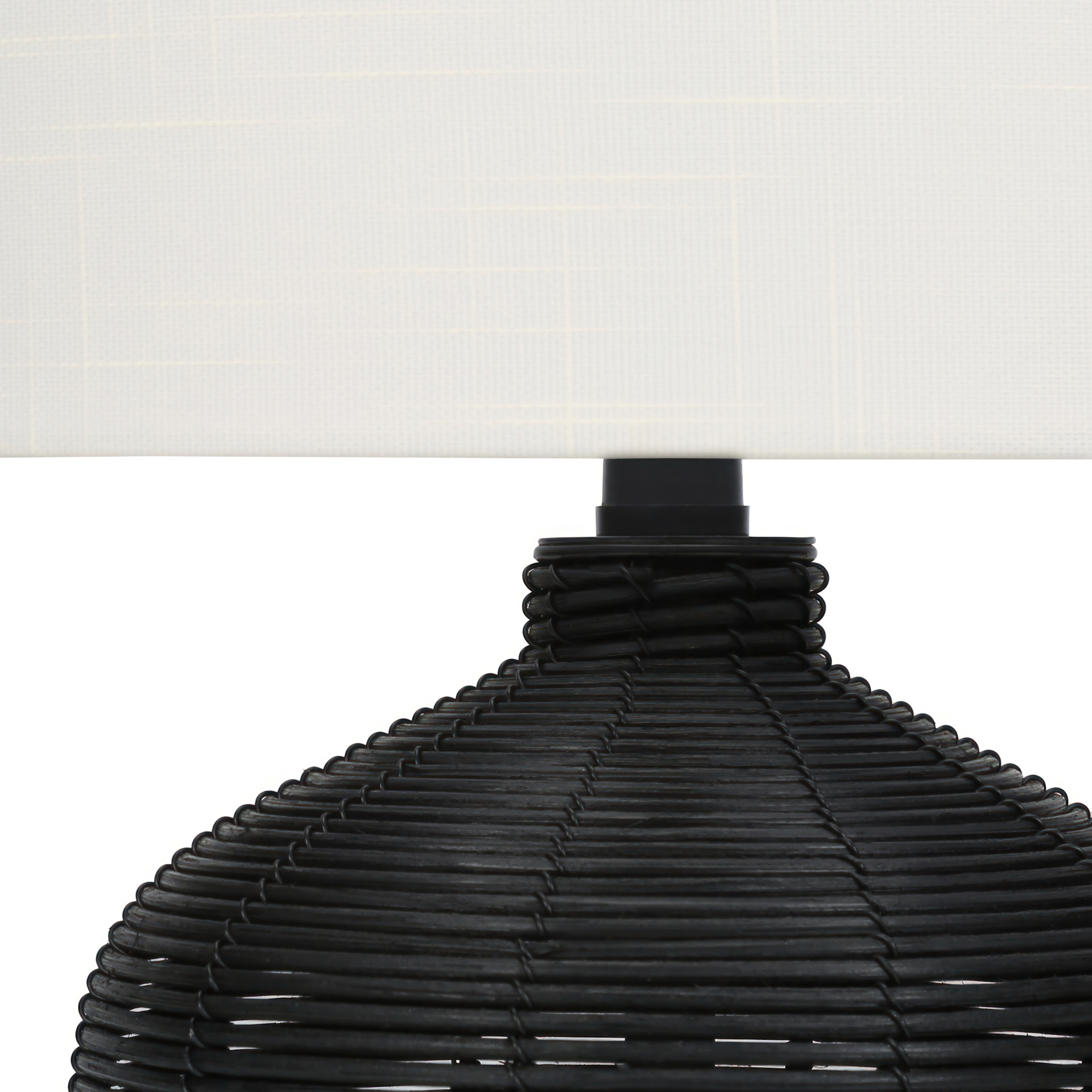 Add a casual chic ambiance to your living room, home office, or bedroom with this stylish and fashionable 23"h table lamp. This ginger jar shaped lamp features a black rattan base and a linen ivory drum shade, finished with a black finial on top.