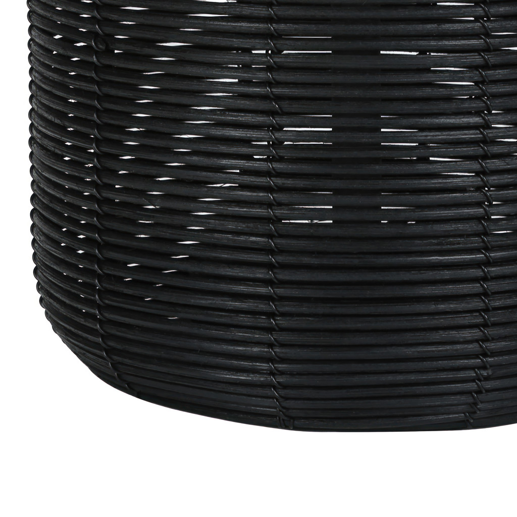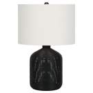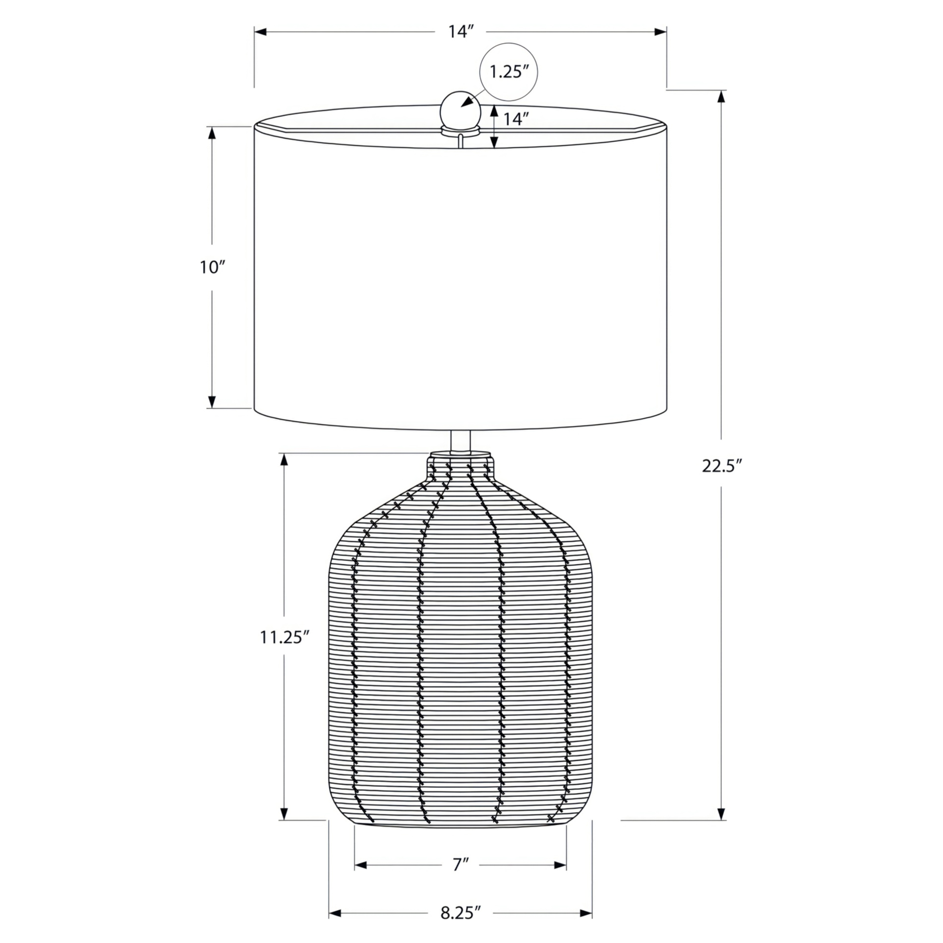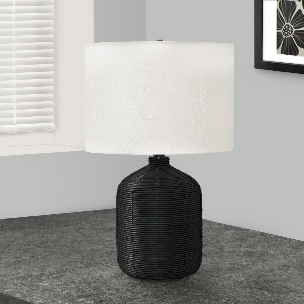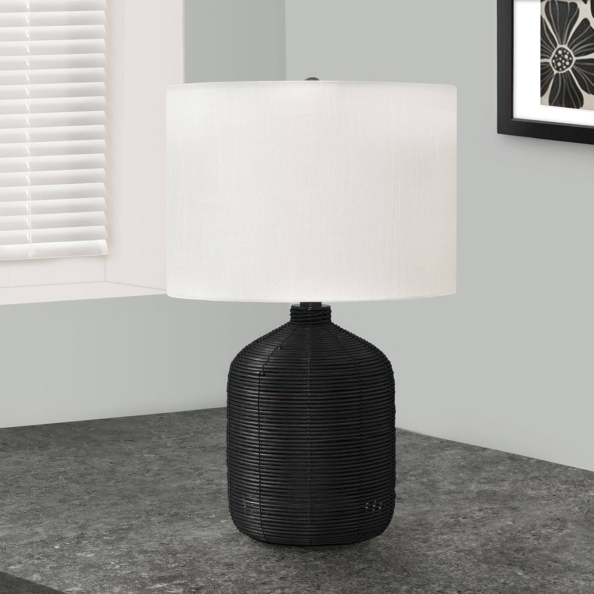 Add a casual chic ambiance to your living room, home office, or bedroom with this stylish and fashionable 23"h table lamp. This ginger jar shaped lamp features a black rattan base and a linen ivory drum shade, finished with a black finial on top.