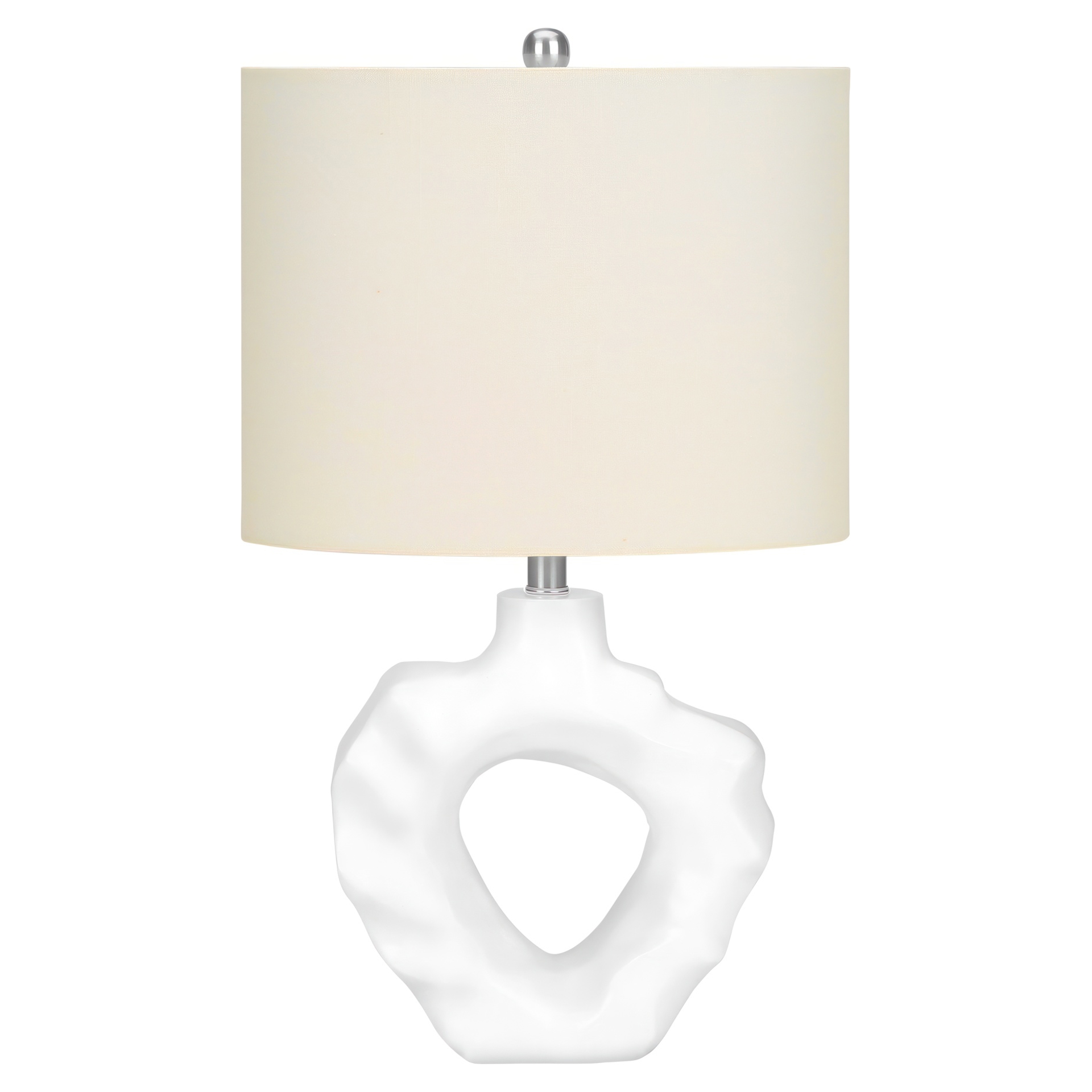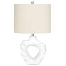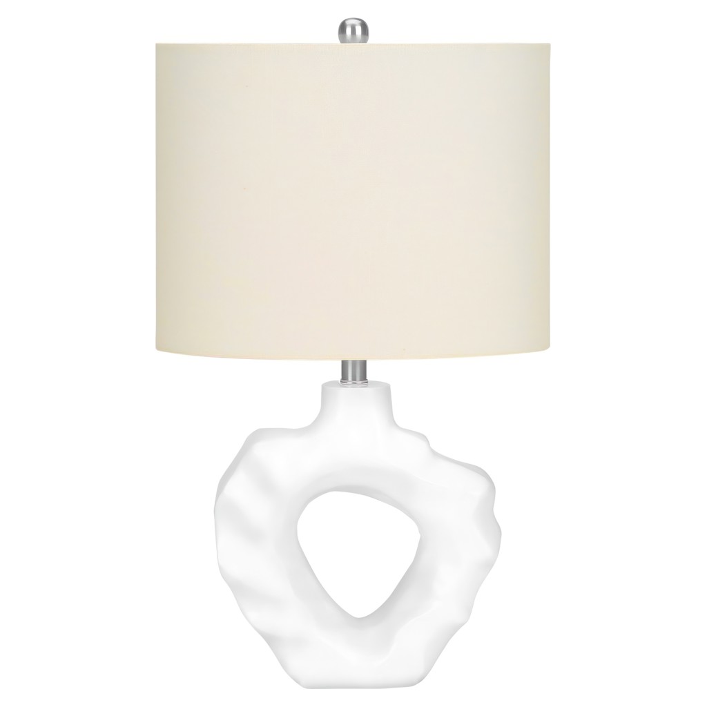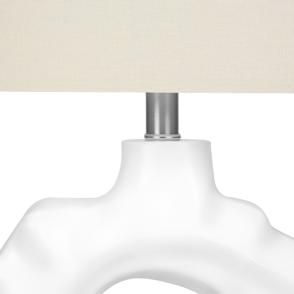 Make any room in your home shine with this unique 25"h table lamp. With a rippled sculptural base crafted from cream resin and an elegant oval ivory linen shade, finished with a round metal finial on top, this modern style lamp will instantly brighten your living room, office space, or bedroom.