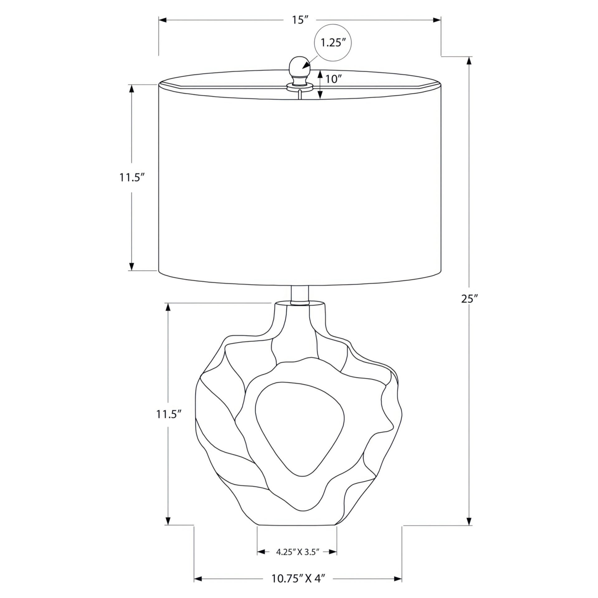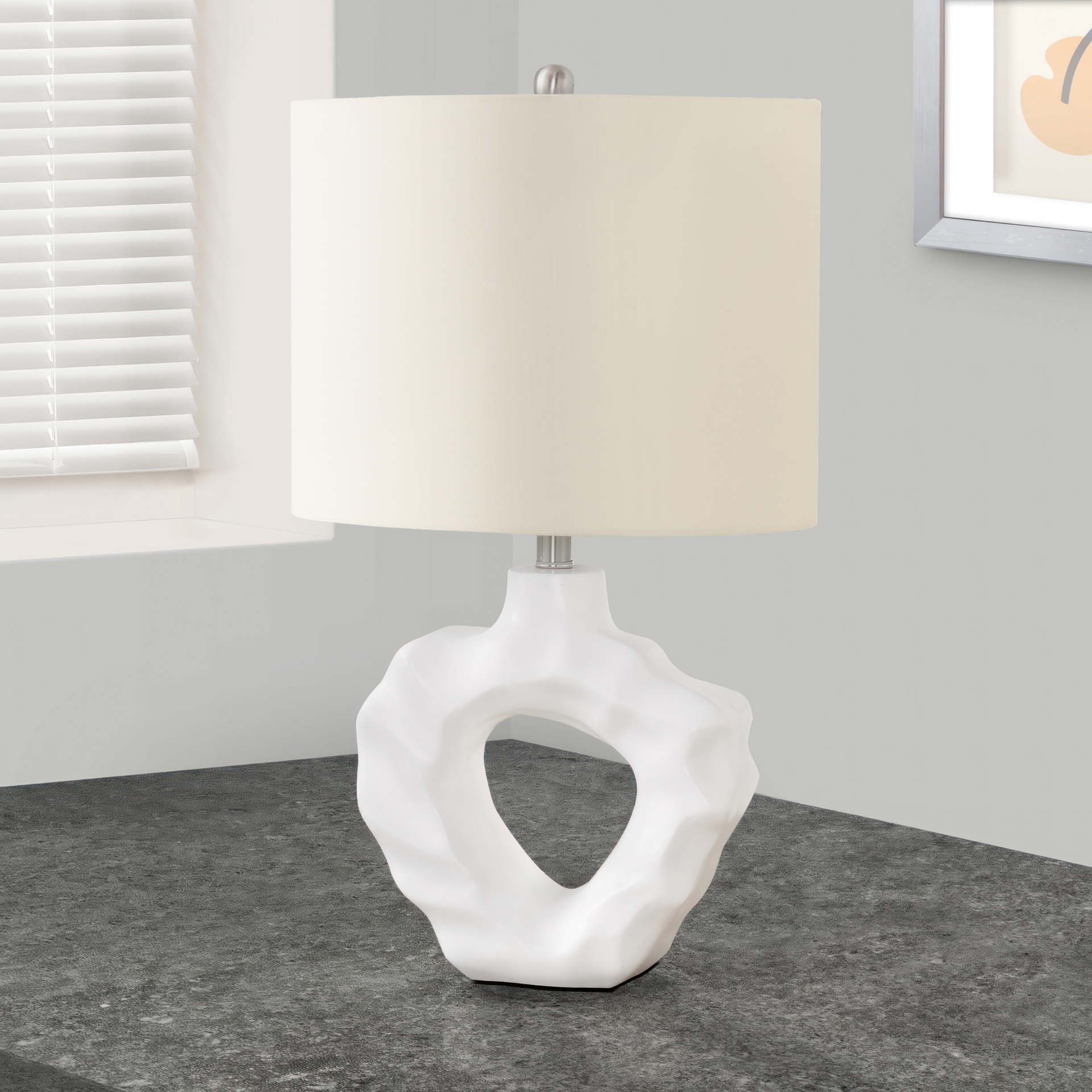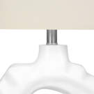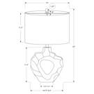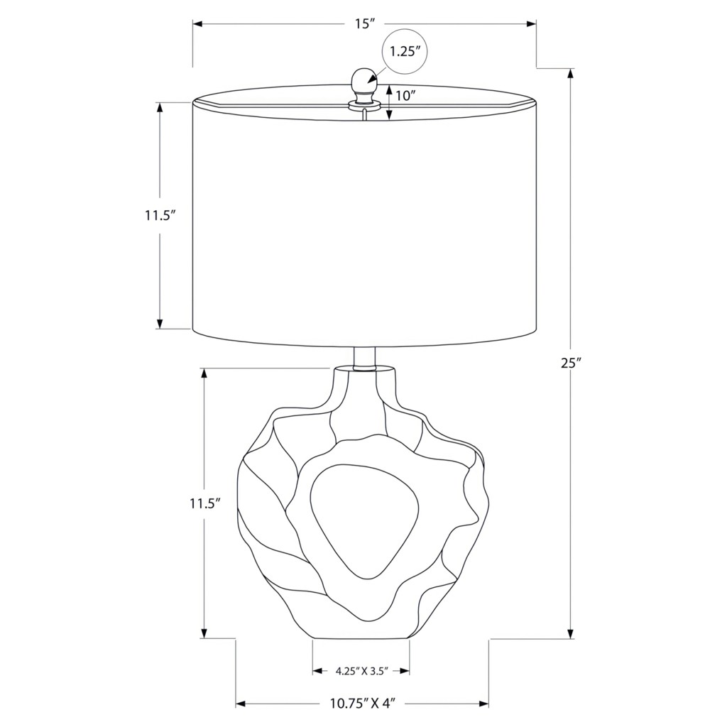 Make any room in your home shine with this unique 25"h table lamp. With a rippled sculptural base crafted from cream resin and an elegant oval ivory linen shade, finished with a round metal finial on top, this modern style lamp will instantly brighten your living room, office space, or bedroom.