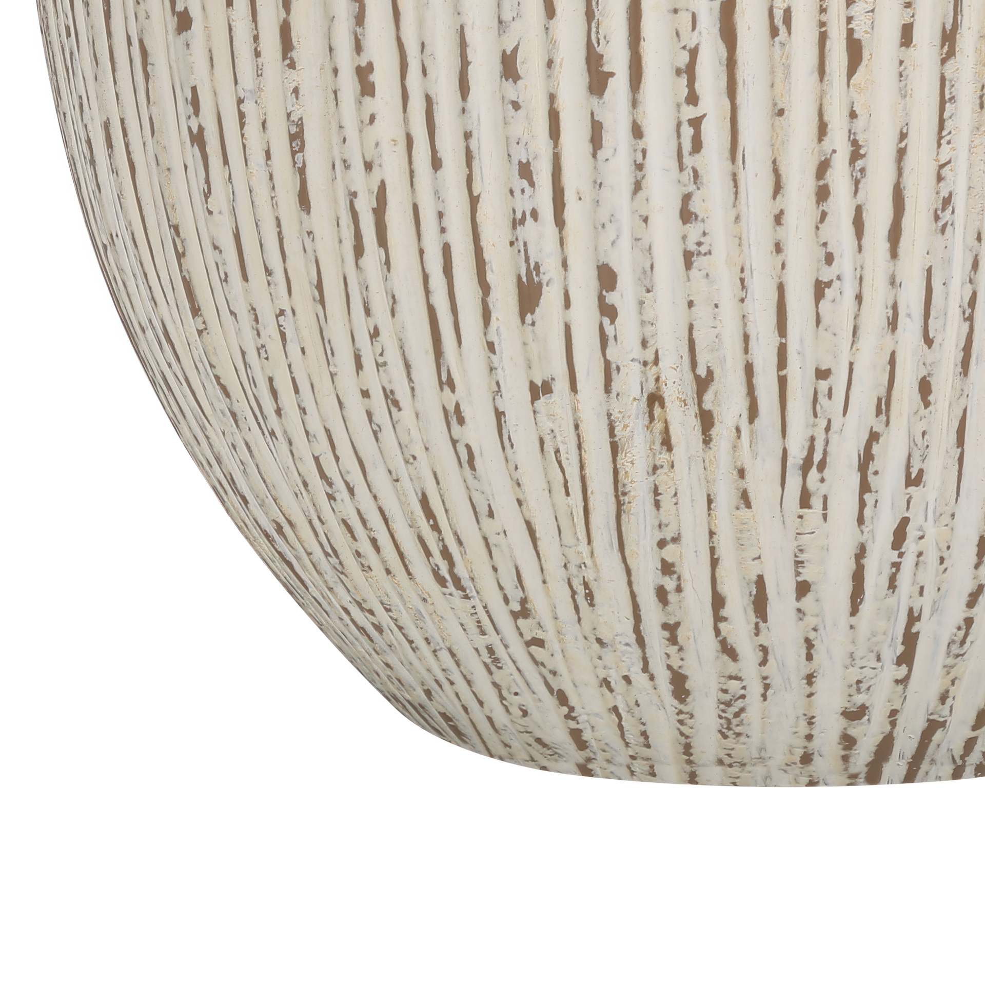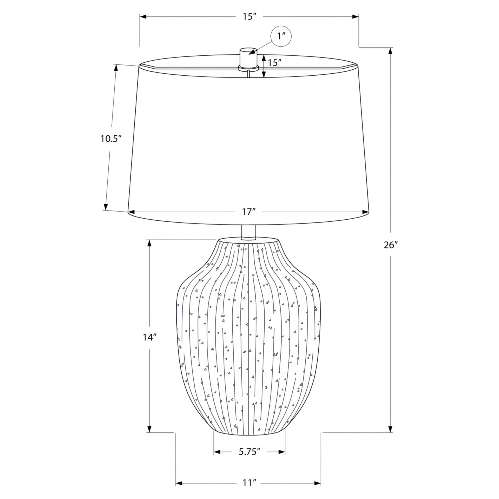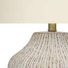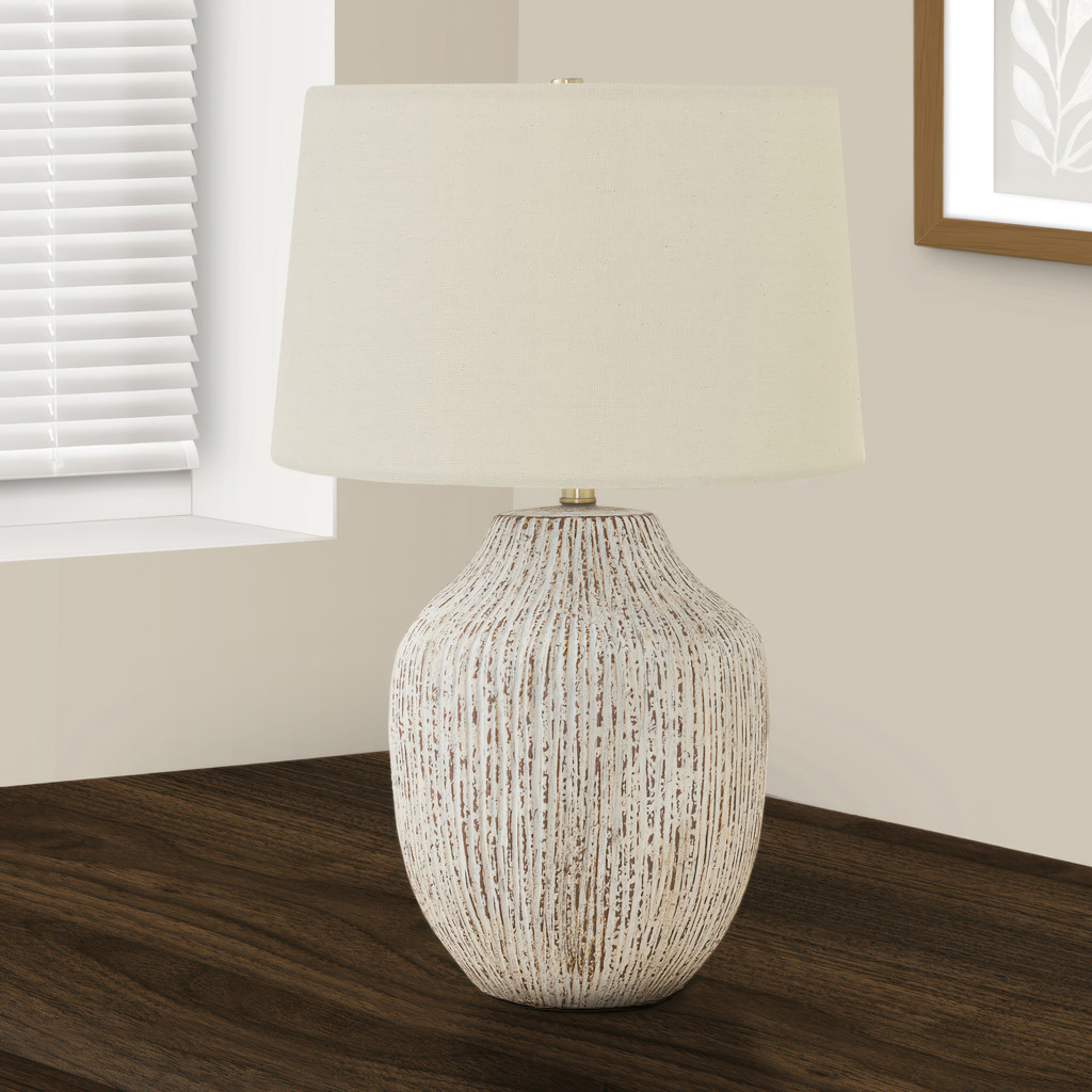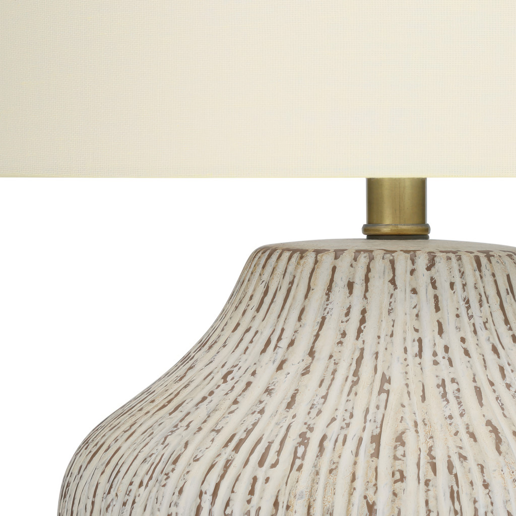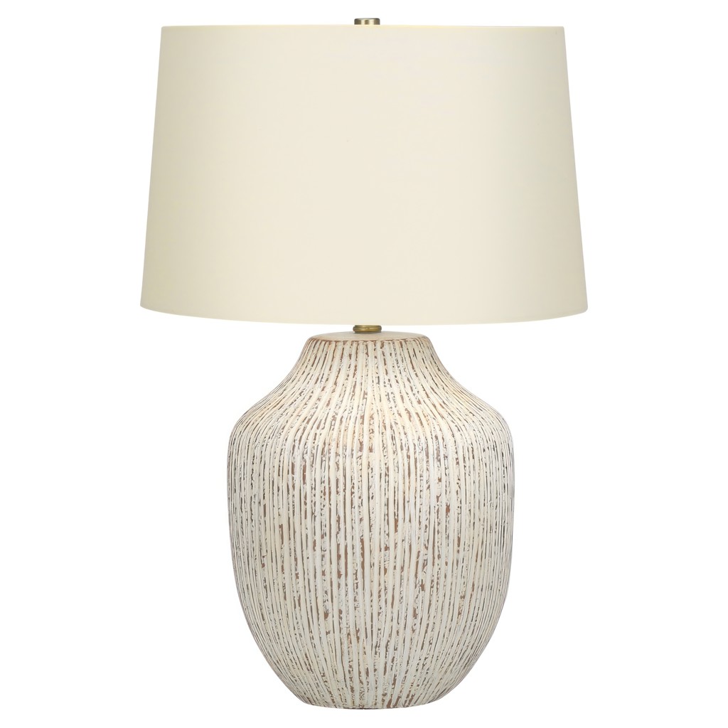 A beautiful blend of a textured cream ceramic vase shaped base topped with an ivory linen shade and finished with a gold finial on top, this stylish lamp is a great way to brighten any bedroom, living room or office.