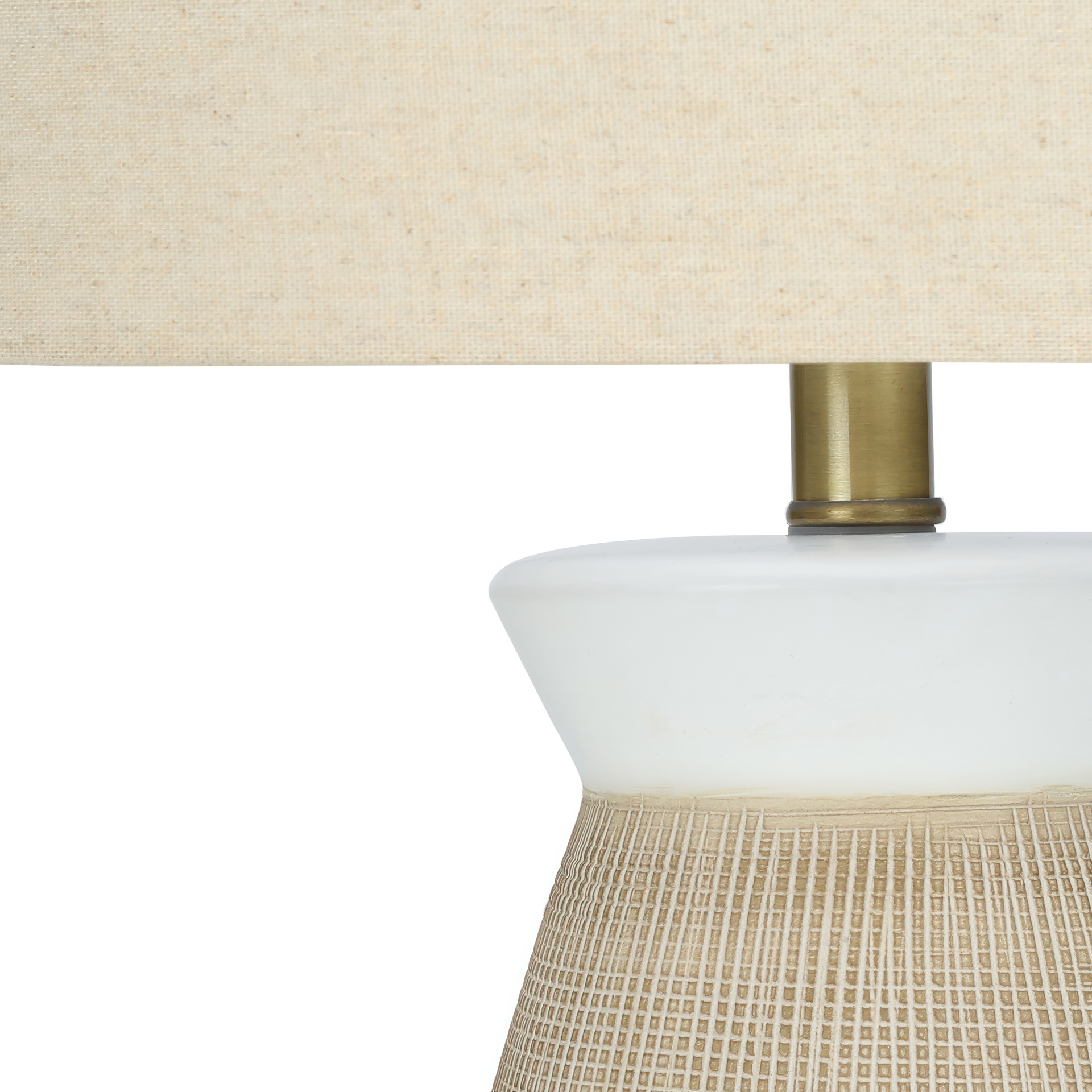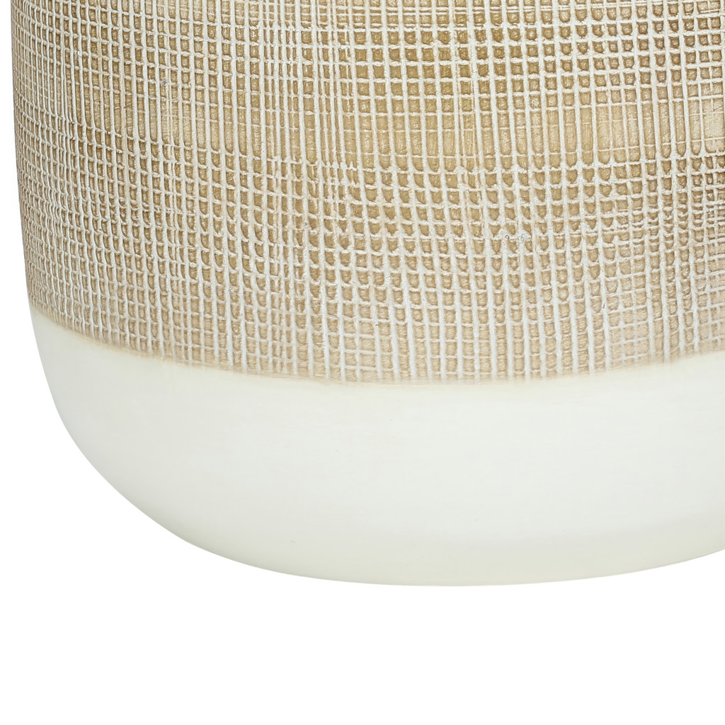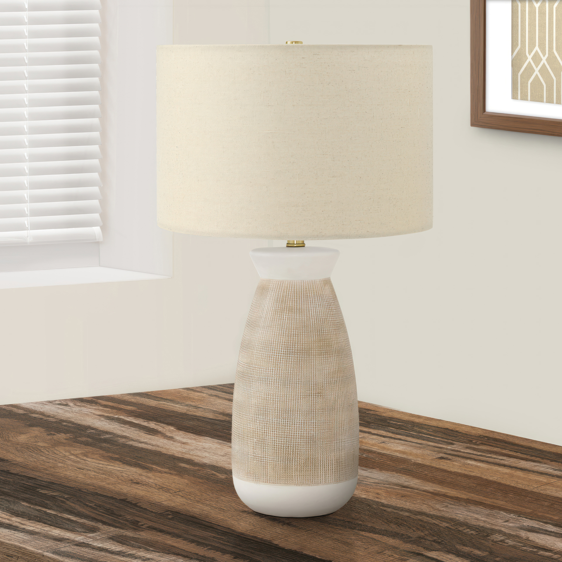 Showcasing a beautiful blend of a smooth light cream and textured dark cream on the vase shaped ceramic base, with a beige linen drum shade, and finished with a gold metal finial on top, this lamp is a great way to brighten any bedroom, living room or office.