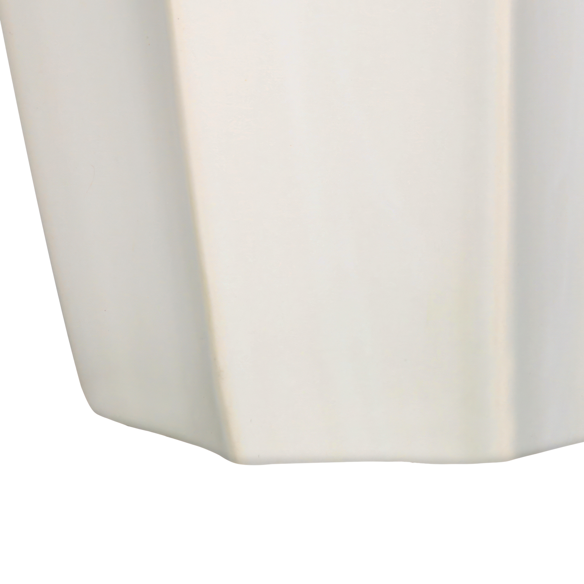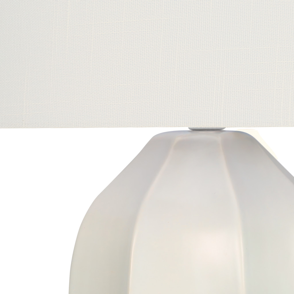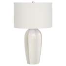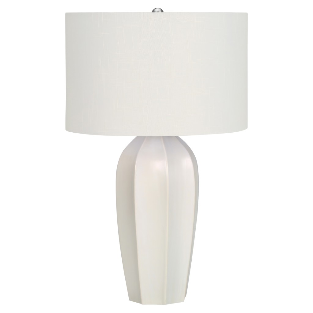 A beautiful blend of art-deco with a modern edge, the smooth cream ceramic base in a tapered vase shape, is complimented with an elegant ivory linen drum shade, and finished with a silver metal finial on top.