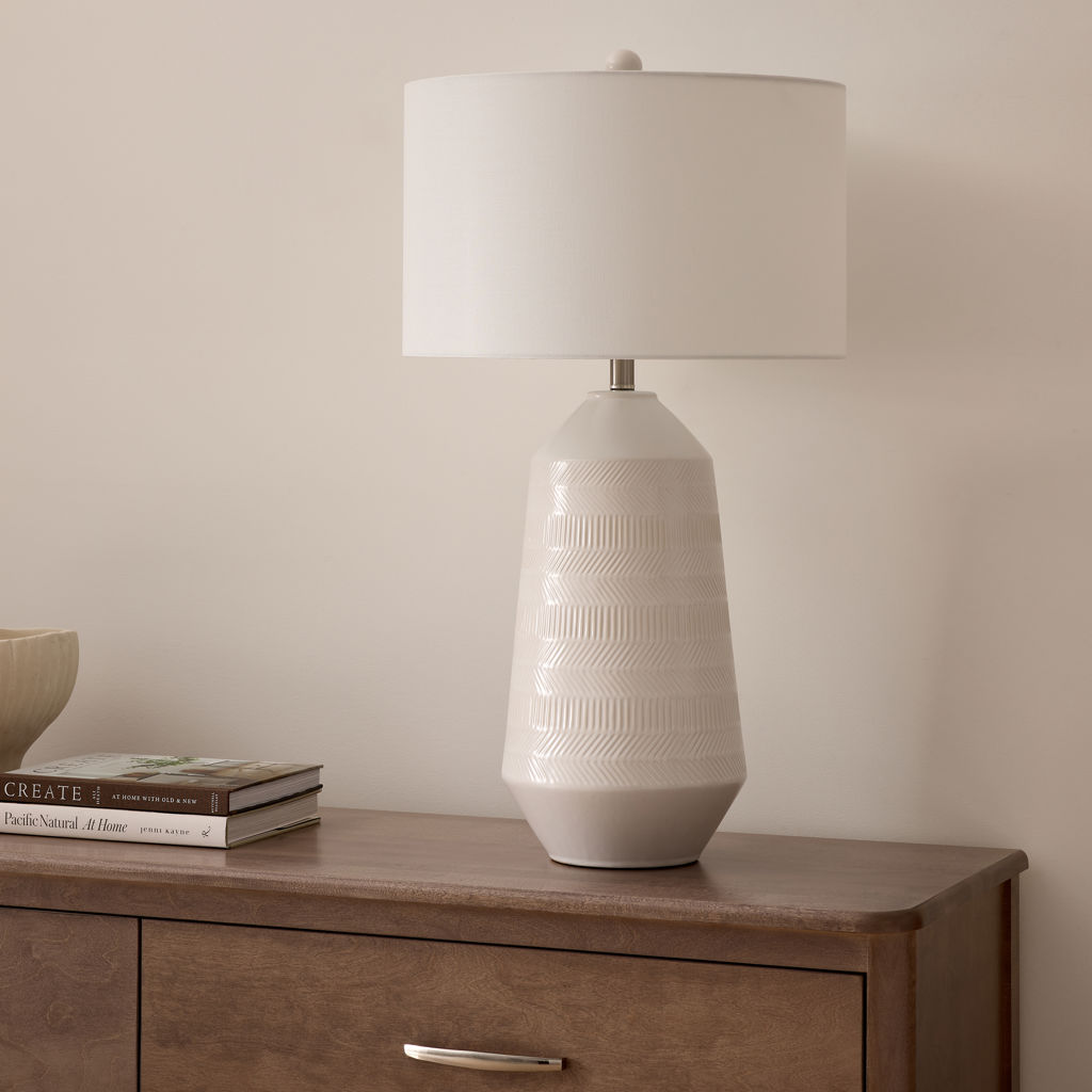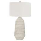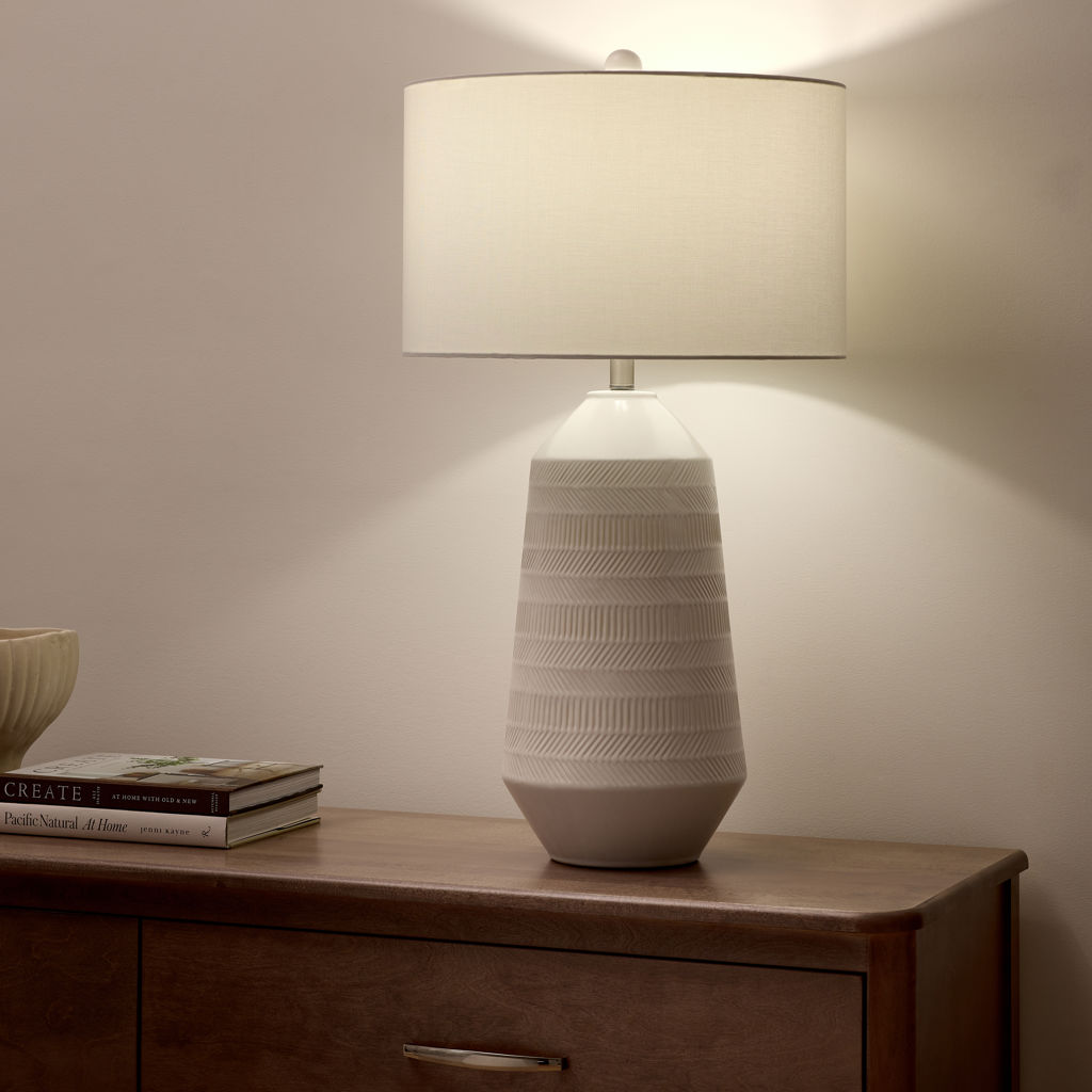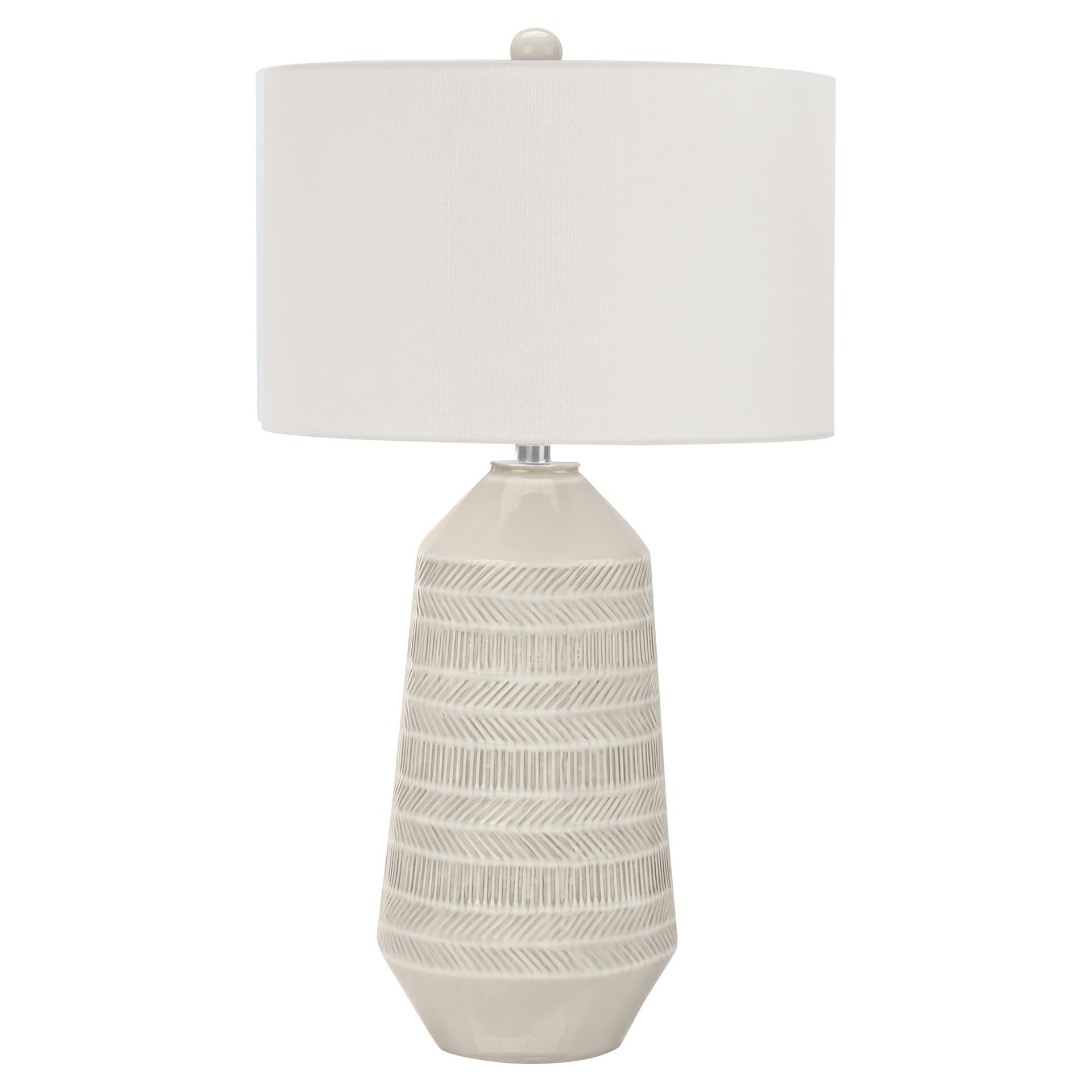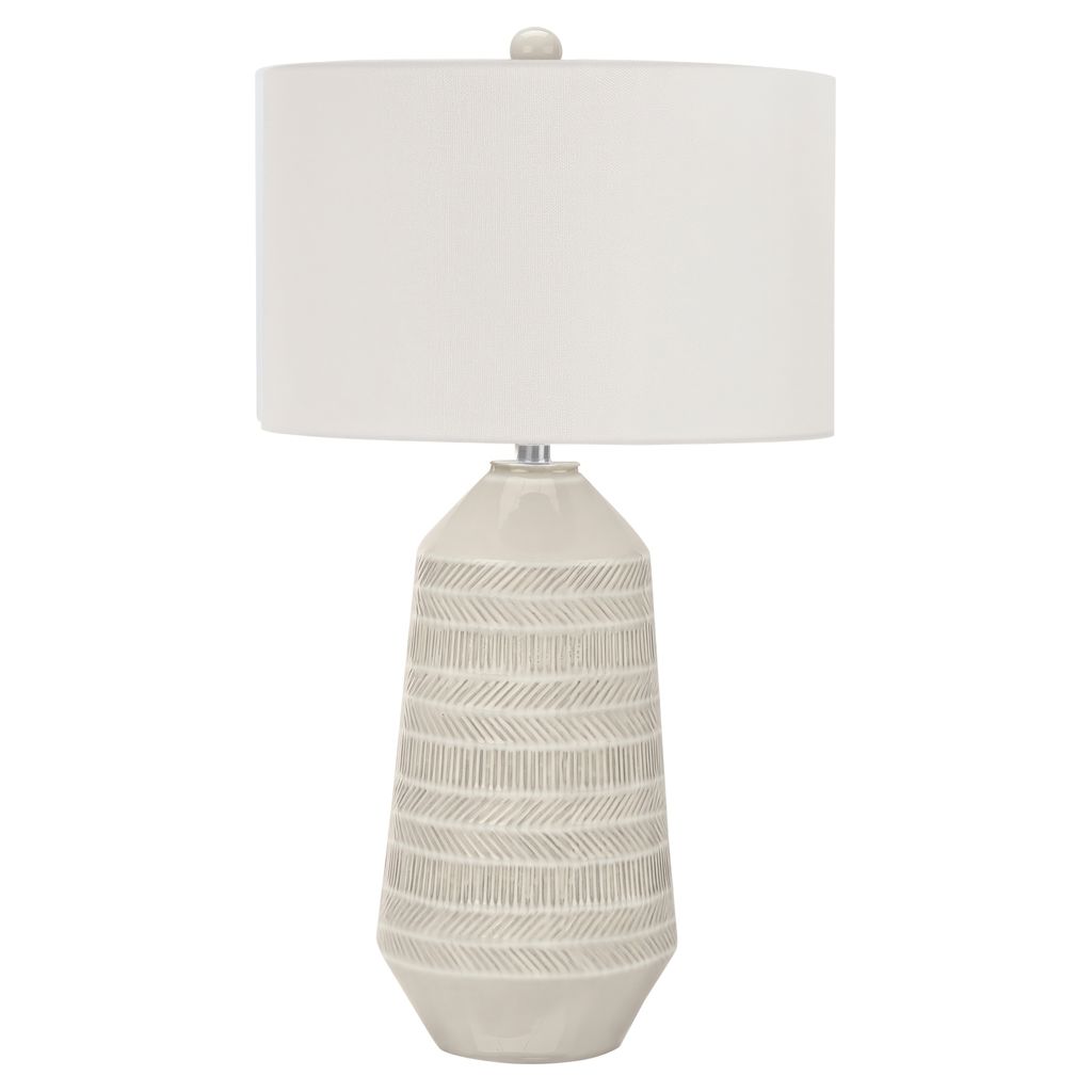 This beautiful, contemporary style 33"h table lamp with a cream ceramic textured base and ivory fabric shade, topped with a round ceramic finial is the perfect way to add some stylish and fashionable flair to any end or side table, or nightstand in your bedroom, living room and home office.