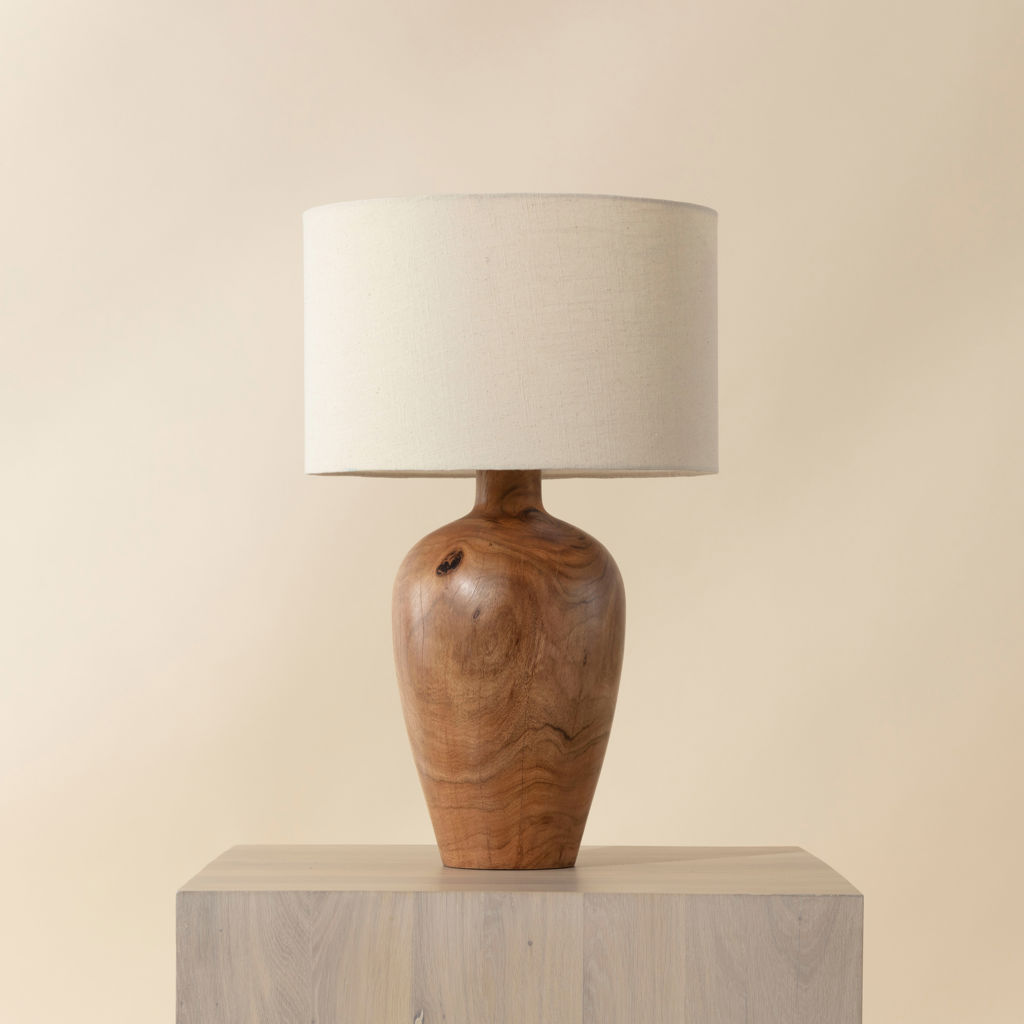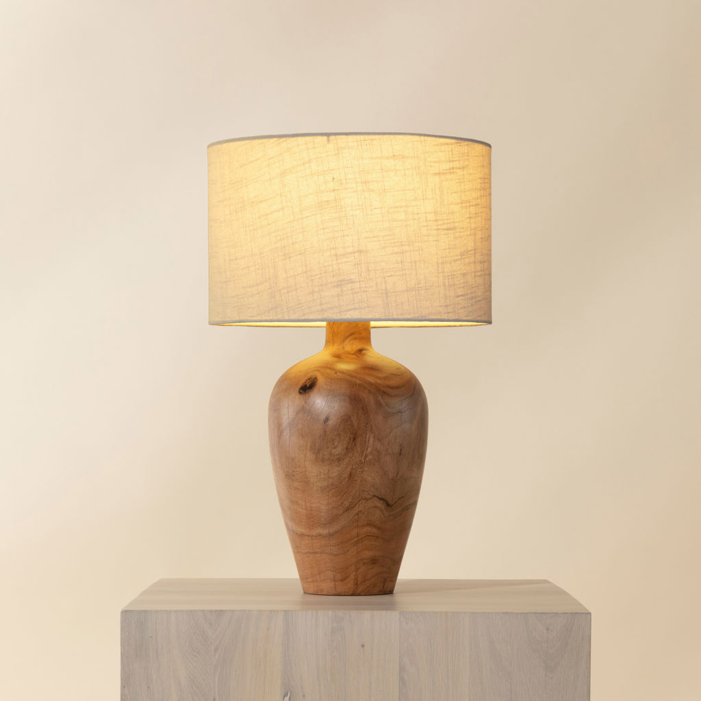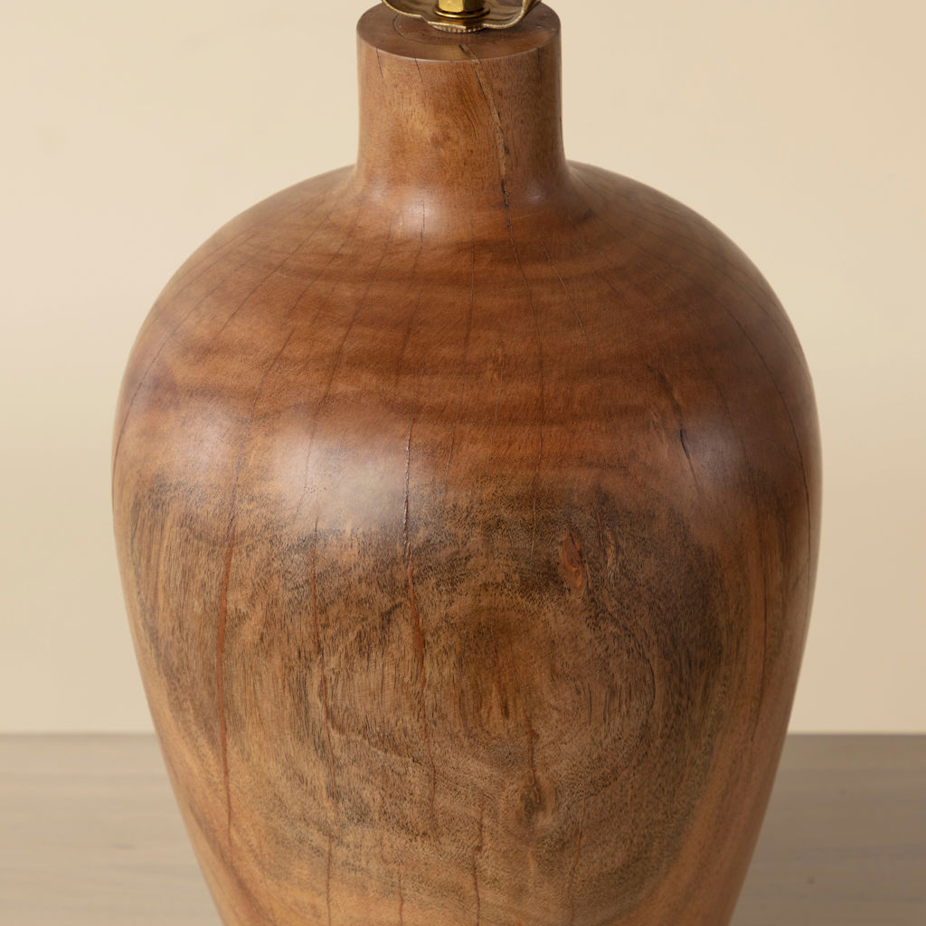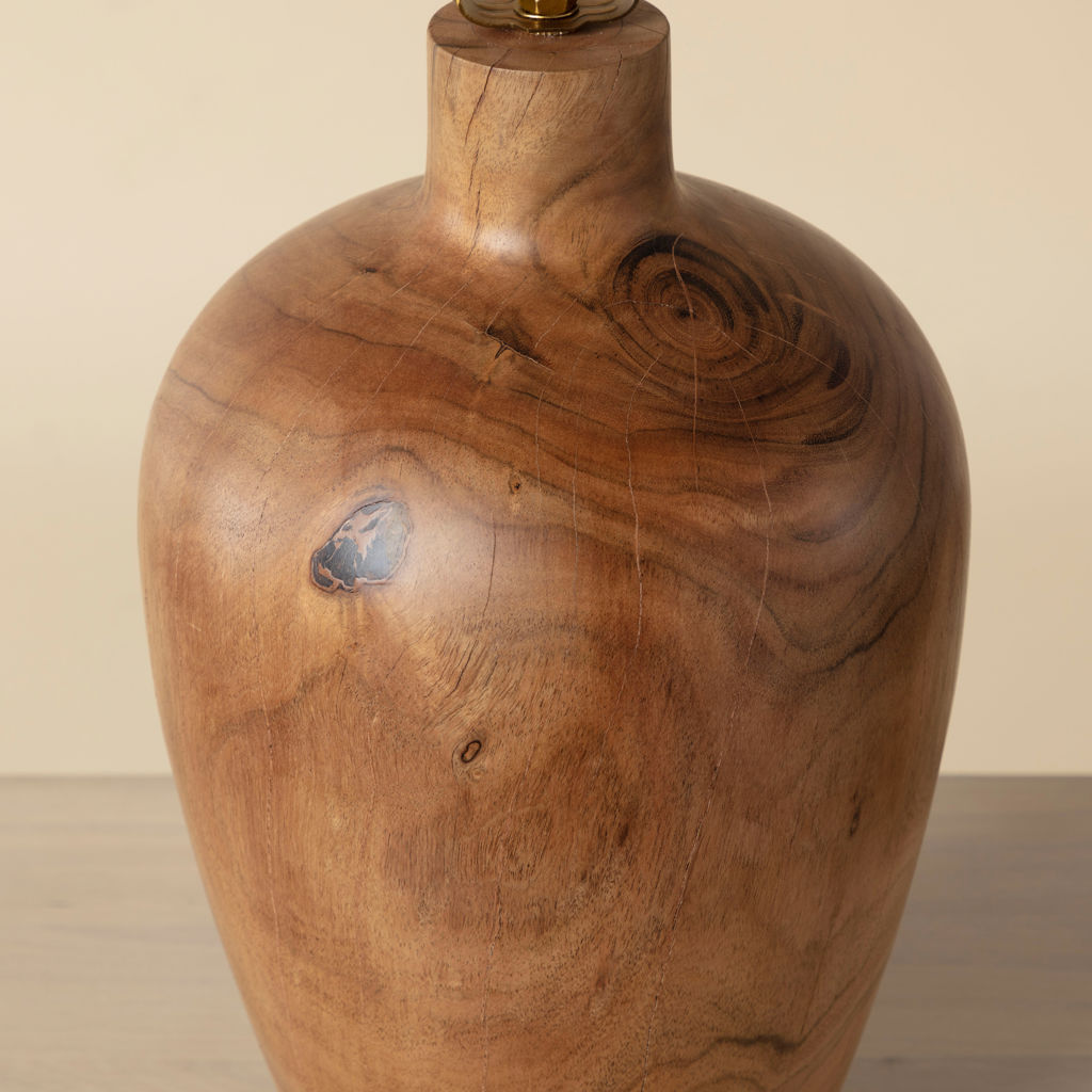 The Acacia Wood Table Lamp elevates the classic gourd shape by incorporating organic elements.
