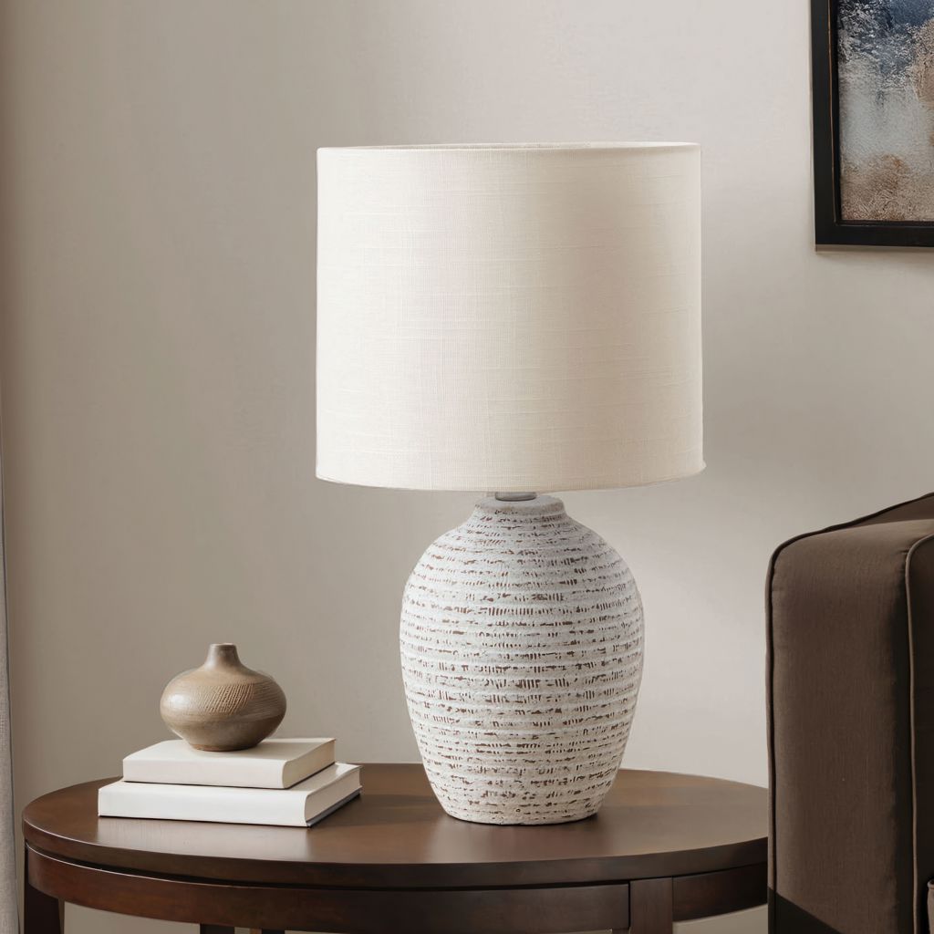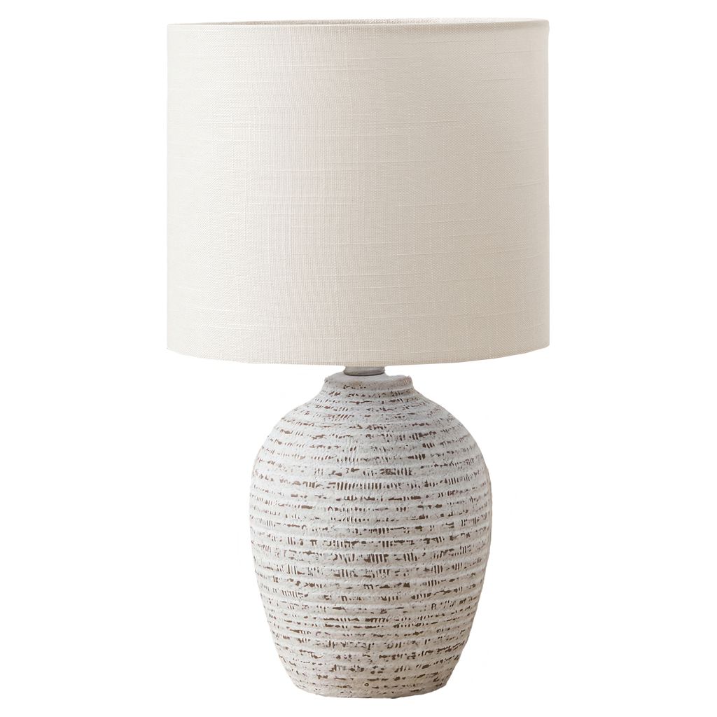 Here is the perfect blend of contemporary style and functional elegance with this beautifully crafted, 17 h table lamp in an exquisite ivory ceramic. This decorative lamp features a textured finish base with an elegantly weathered look in ivory with brown undertones and topped with a modern ivory fabric shade.