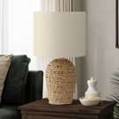 Designed with a textured finish base in a natural woven rope-style rattan material, this lamp not only serves a functional purpose but also infuses a trendy aesthetic into your space.