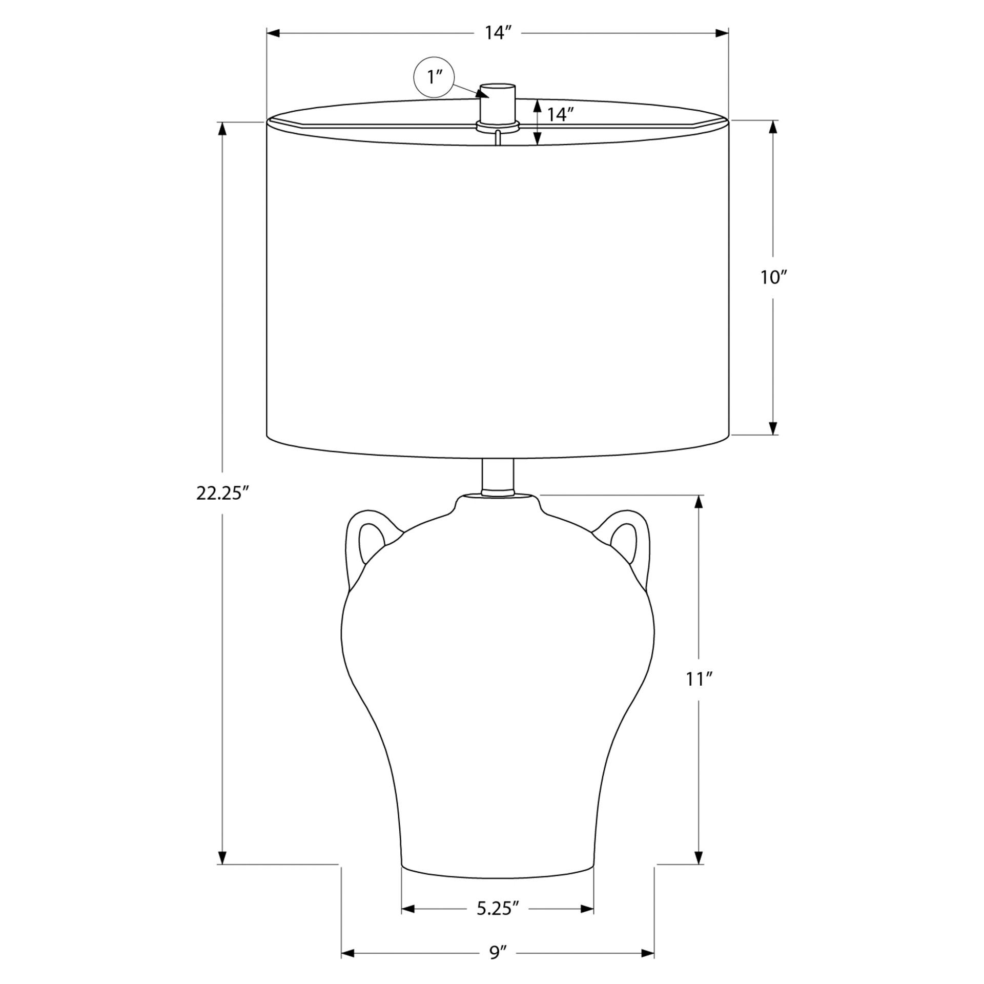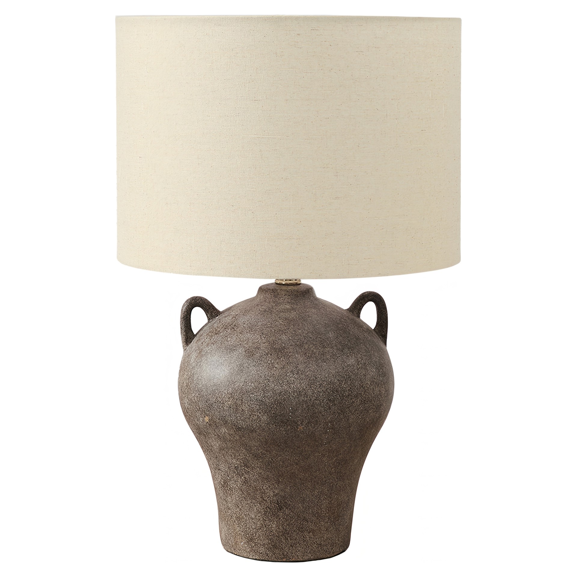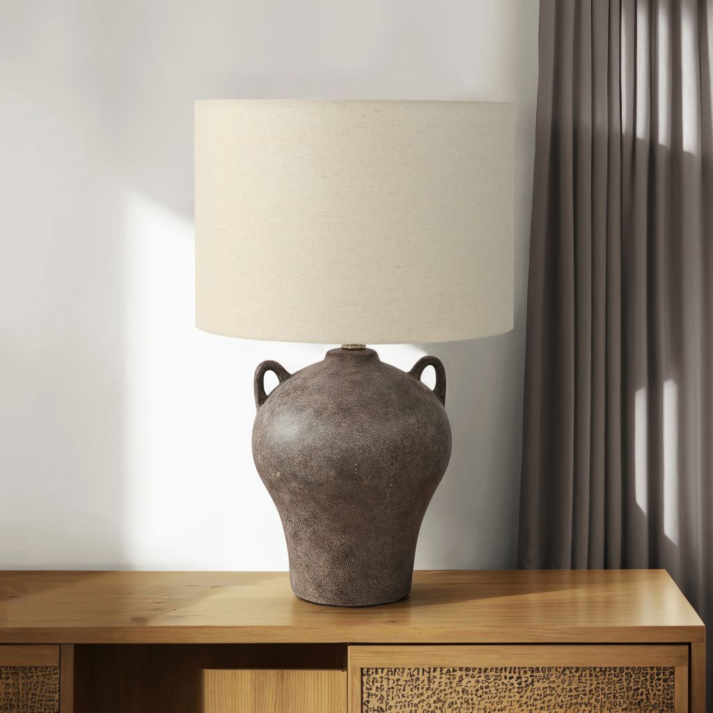 This 22-inch-high table lamp features a marbled brown ceramic base shaped like an antique jug, paired with a contemporary beige fabric shade—an elegant addition to any living room, bedroom, or home office décor.