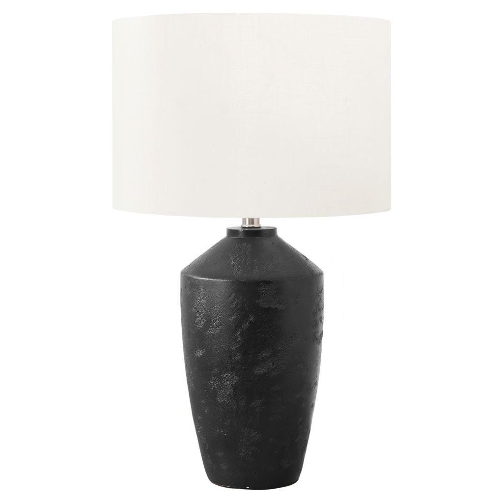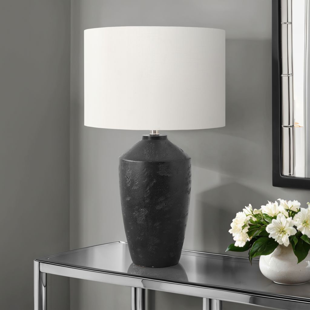 Designed with a bold black concrete base in an aged finish, this lamp pairs beautifully with the modern ivory fabric shade that softly diffuses the light, creating an inviting ambiance that is both decorative and functional. Place this contemporary accent piece on any end or side table, a console, or on a nightstand to effortlessly illuminate a room.