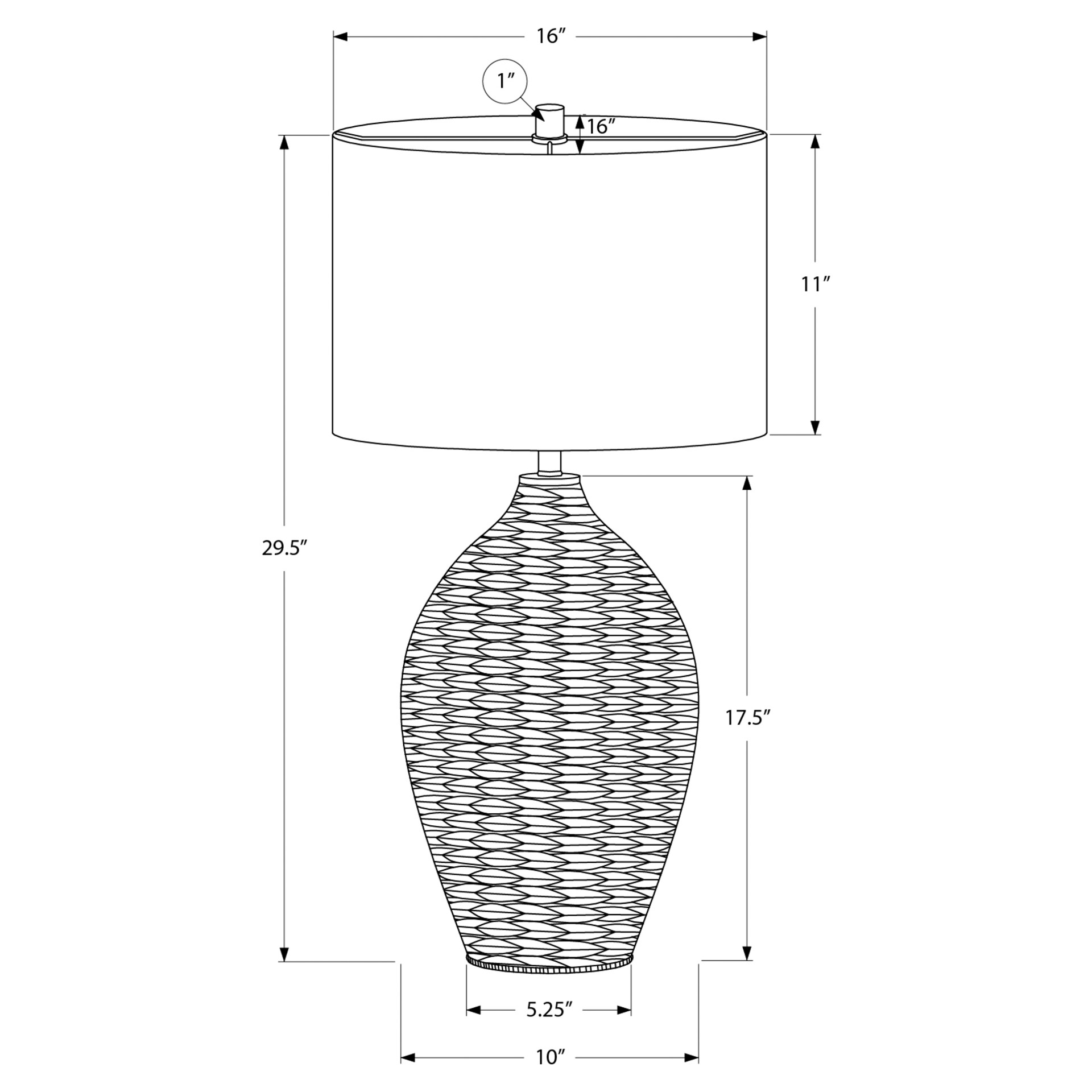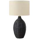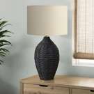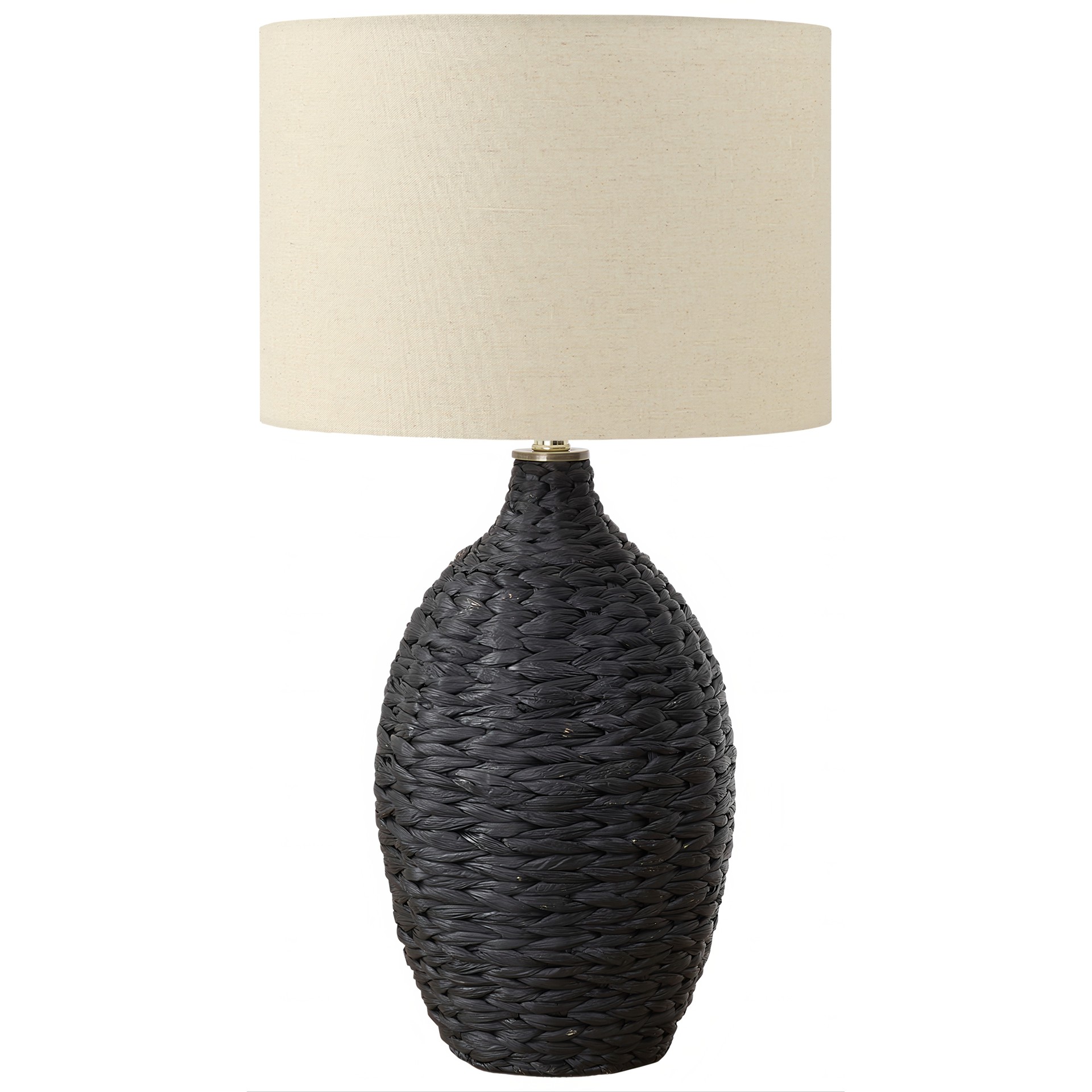 Renew your decor with this stunning 30"h table lamp that perfectly blends natural beauty with contemporary style. The modern, linen-blend beige shade pairs beautifully with the vase shaped, textured finish base crafted from exquisite black rattan in a woven design, adding depth and character to your living room, bedroom, or home office.