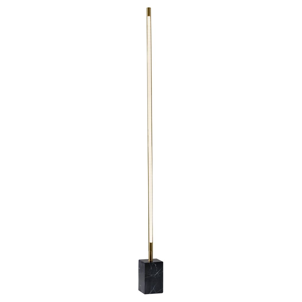 A slim 1-inch tube emits 2,500 lumens of fully dimmable light, reflecting off the wall to fill the room with a warm, ambient glow. A substantial rectangular black marble base adds a sophisticated touch to its modern design.
